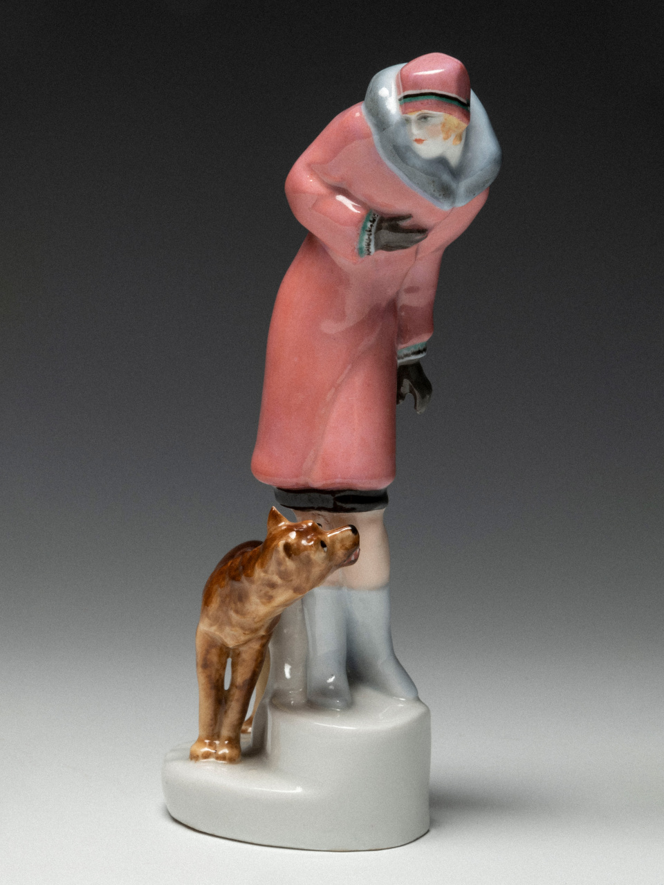 Еще один женский образ в числе моих фаворитов — статуэтка «Трусиха». Изнеженная модница со взъерошенной собачонкой в ногах одета в нежно-розовое пальто и кокетливую шляпку. Она трепещет от ветра, боязливо озираясь по сторонам — всем своим видом молодая девушка олицетворяет состояние творческой интеллигенции, нередкое для тех лет.