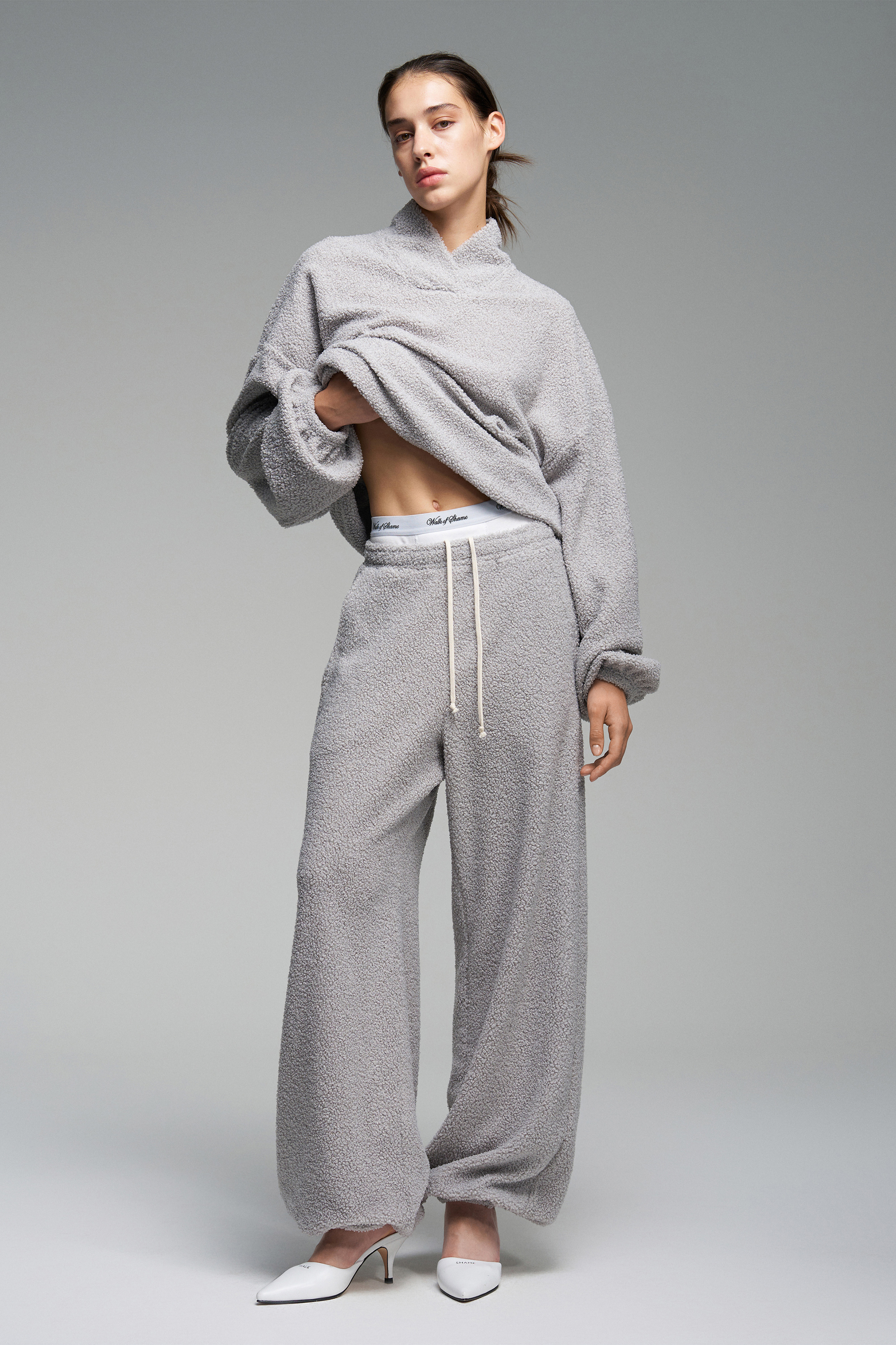 Джоггеры Mouton серого оттенка из мягкого материала. Эластичный пояс обеспечивает комфортную посадку, по бокам — врезные карманы. Низ штанин собран на резинку.