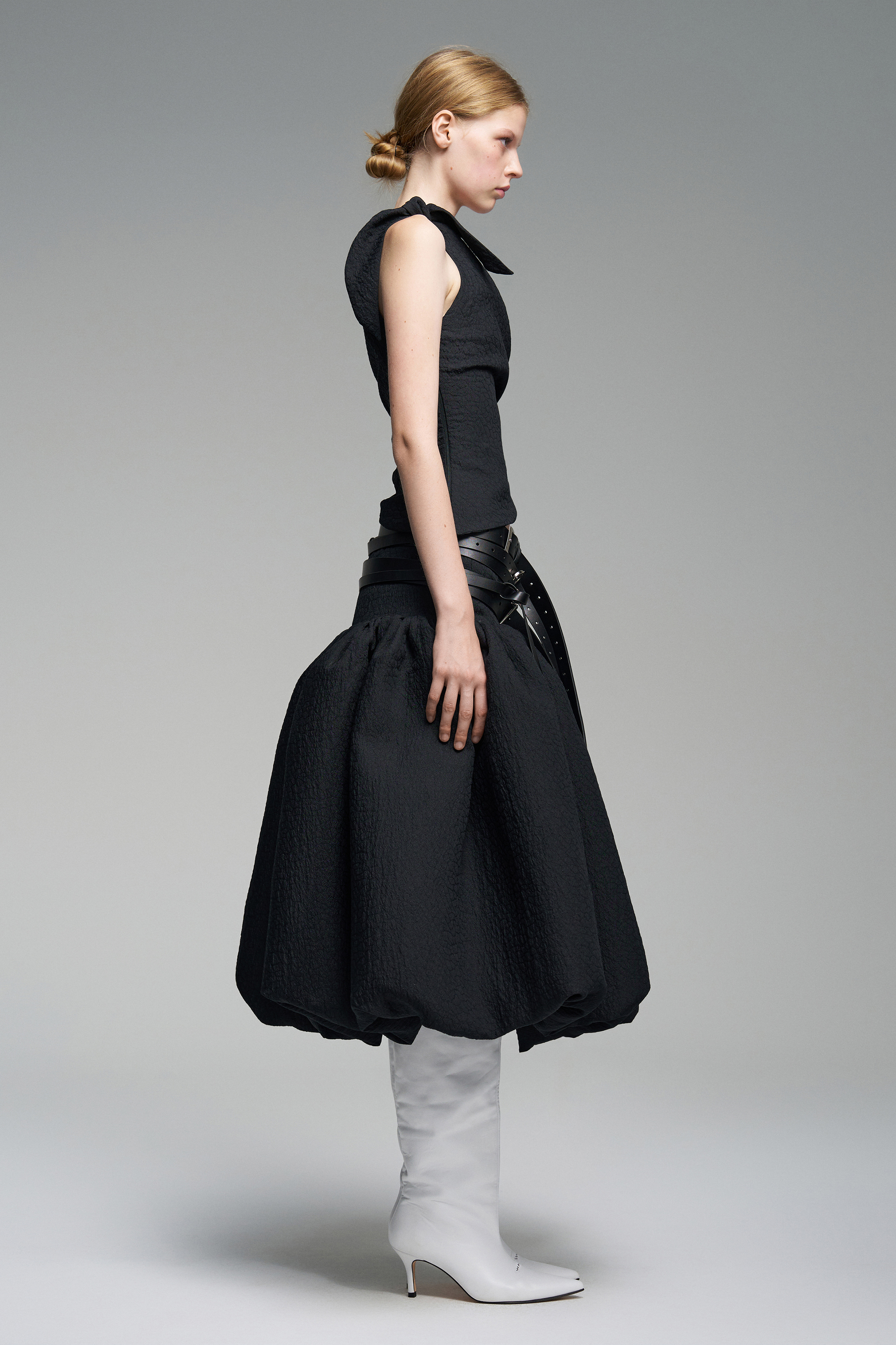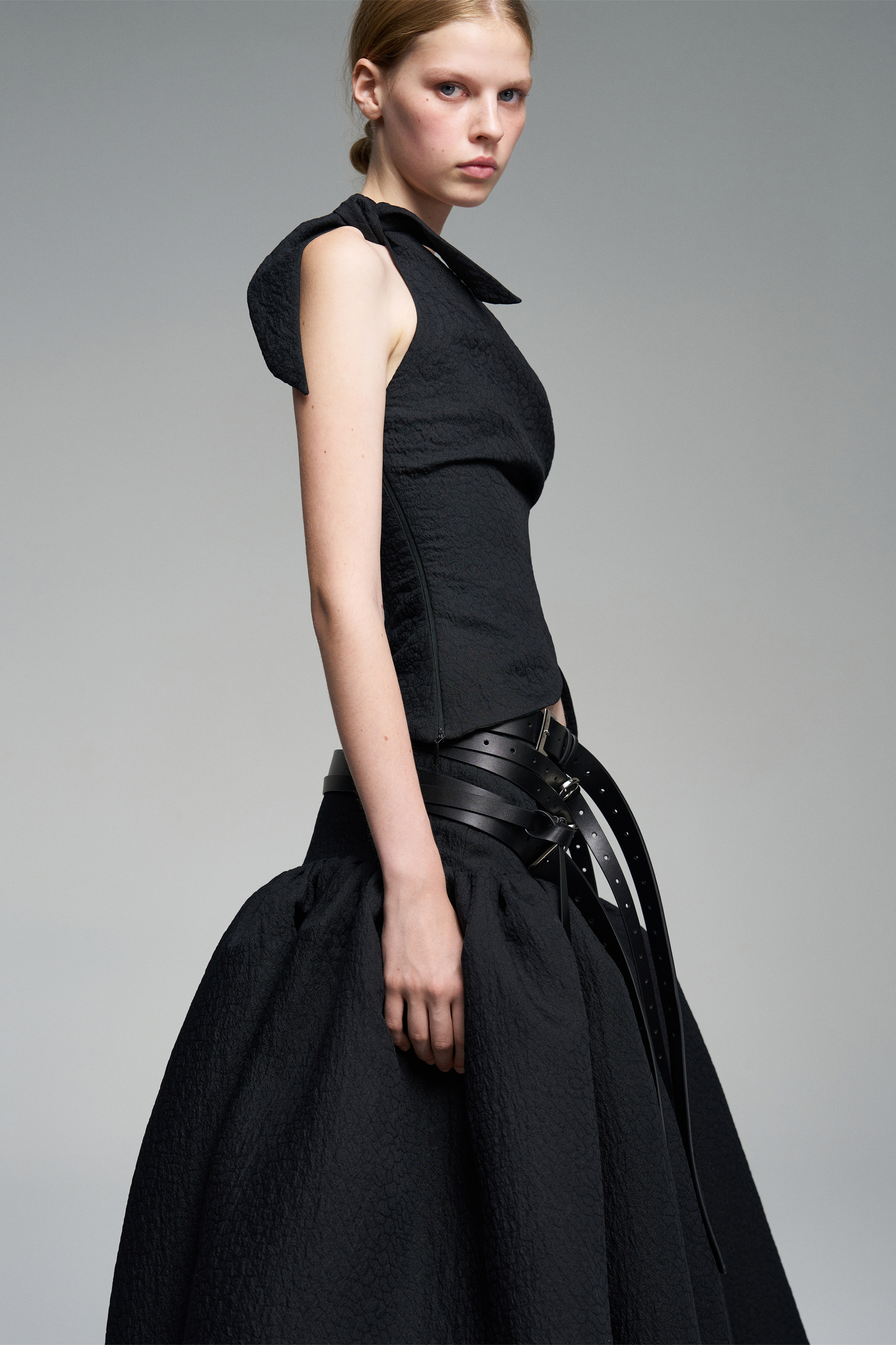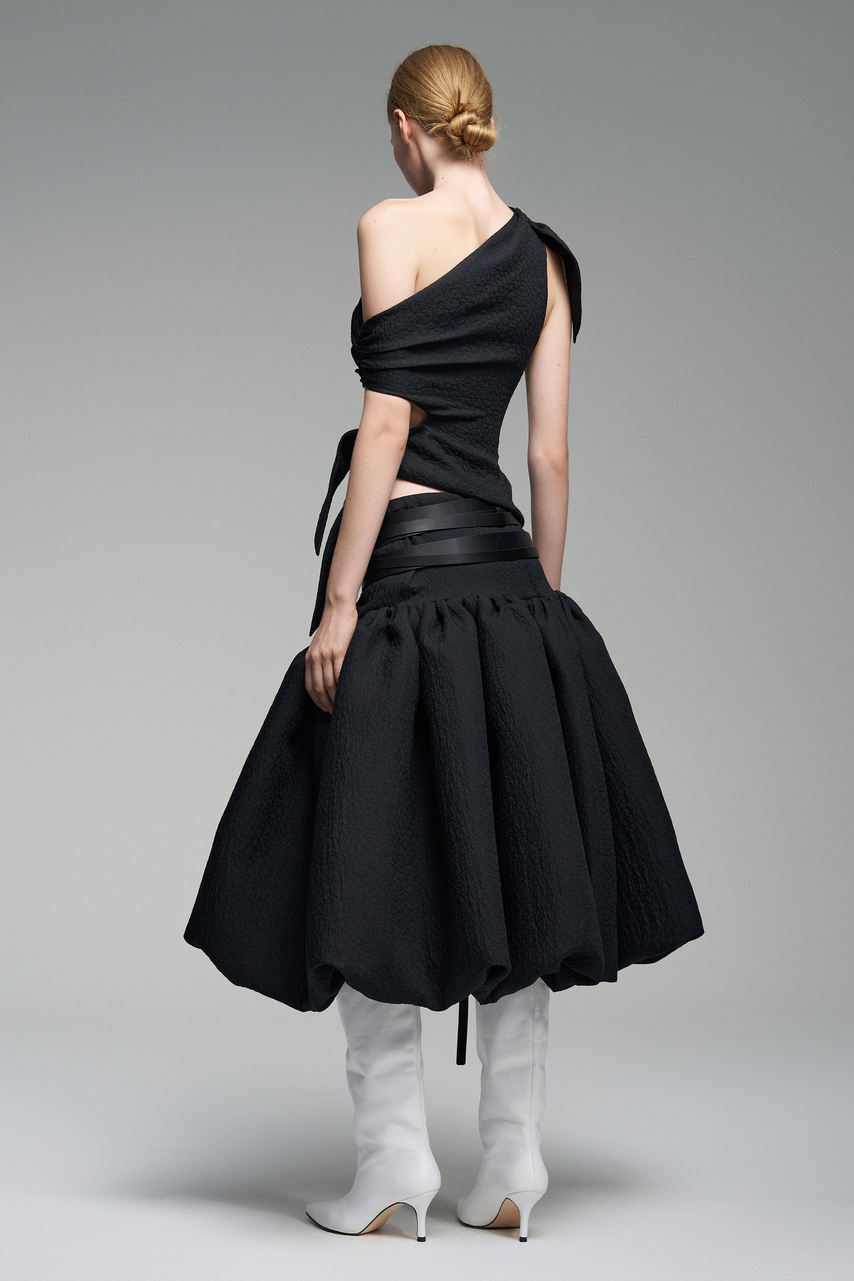 Эта объёмная юбка миди выполнена из фактурного жаккарда, который держит форму и подчёркивает архитектурный силуэт. Широкий пояс плотно фиксируется на бёдрах, а расклёшенная форма-баллон создаёт выразительный объём. Такая юбка становится ярким акцентом, вокруг которого легко строить как вечерние, так и дневные комбинации в духе бренда.