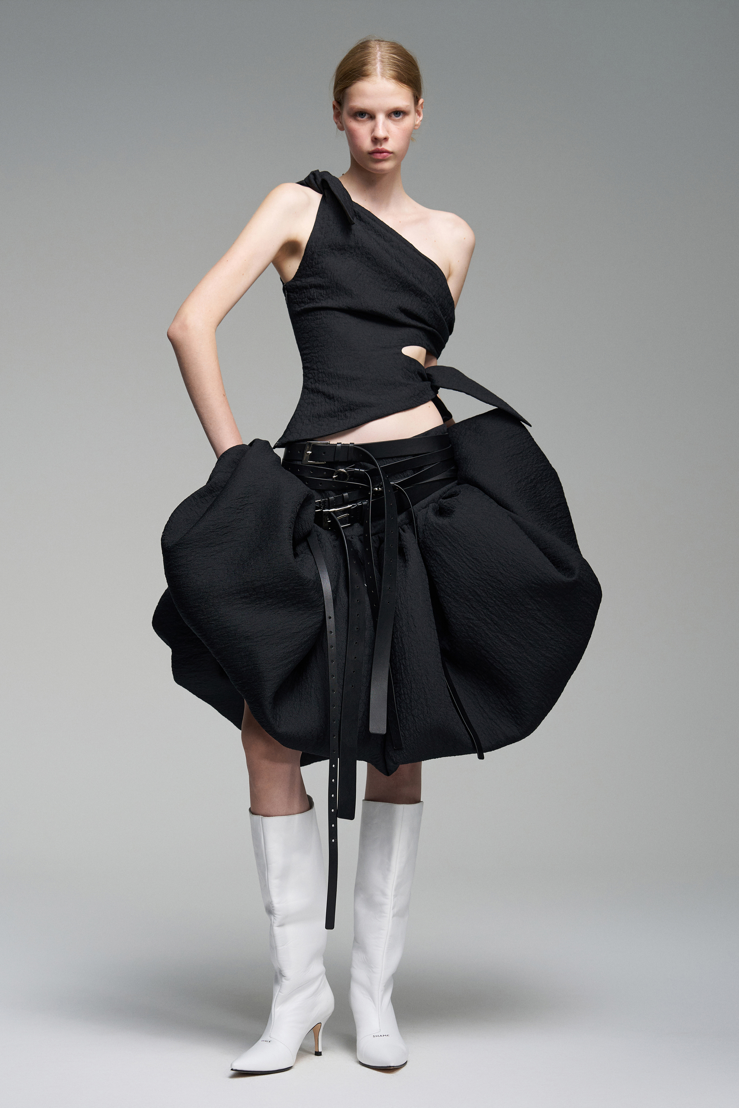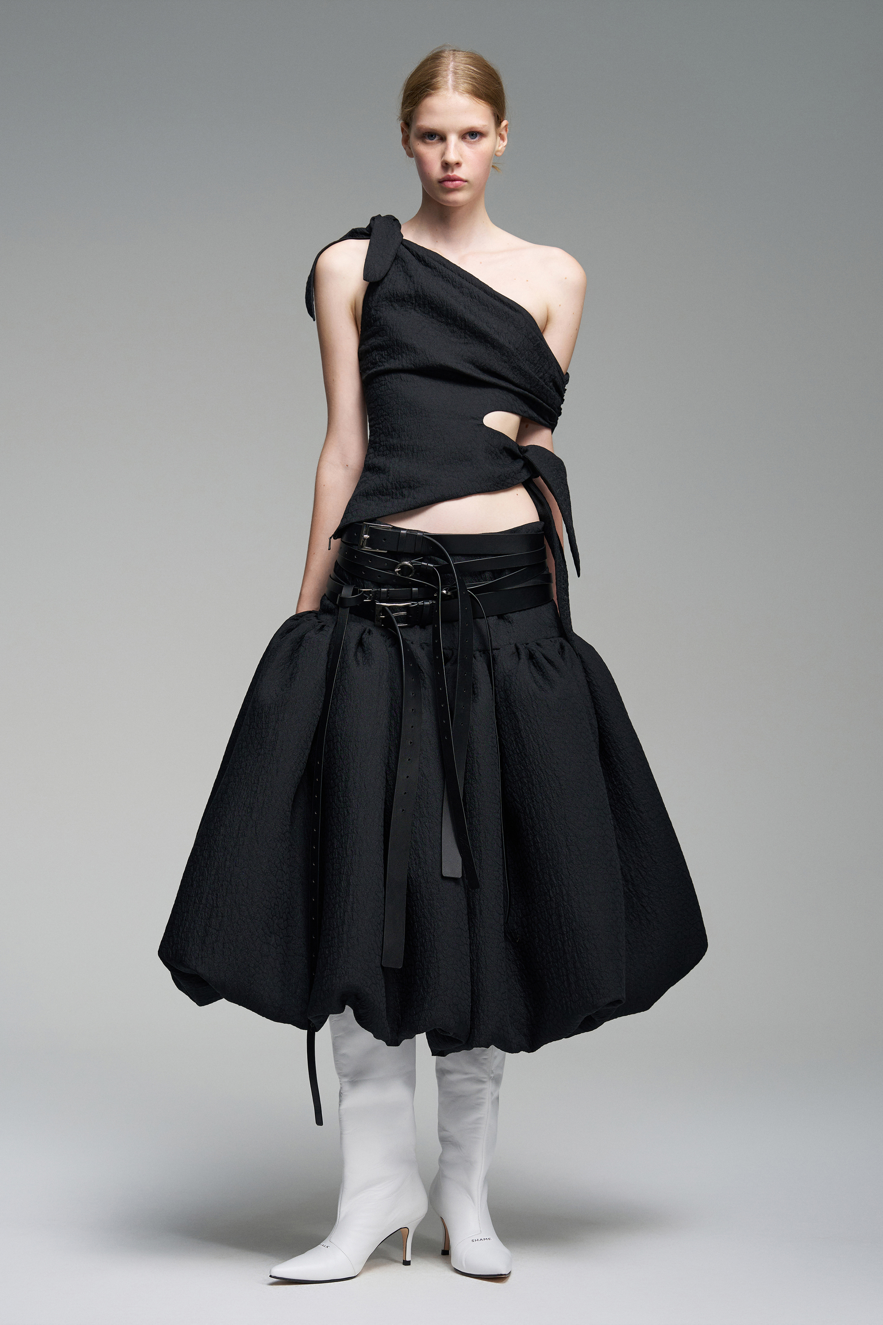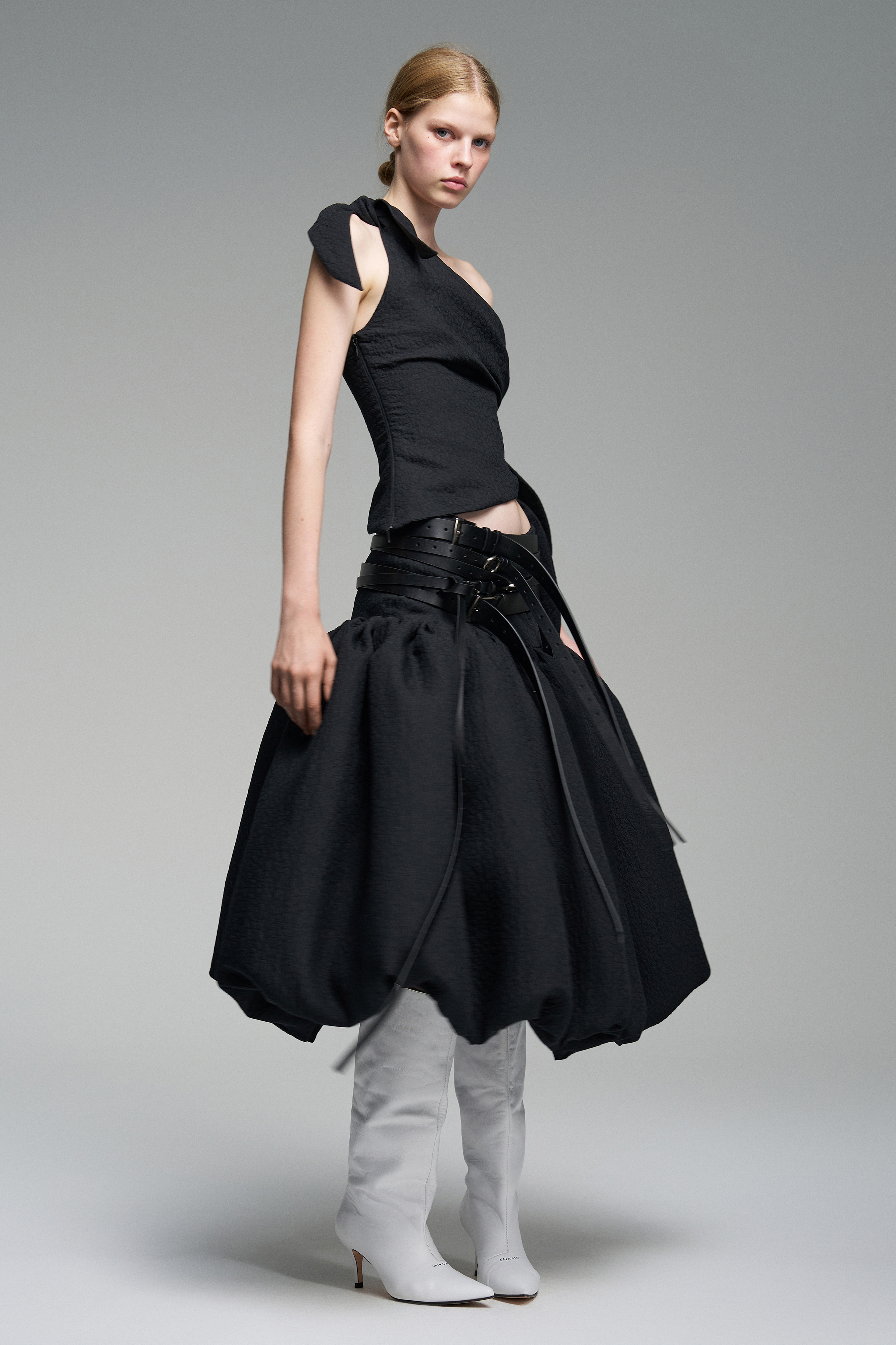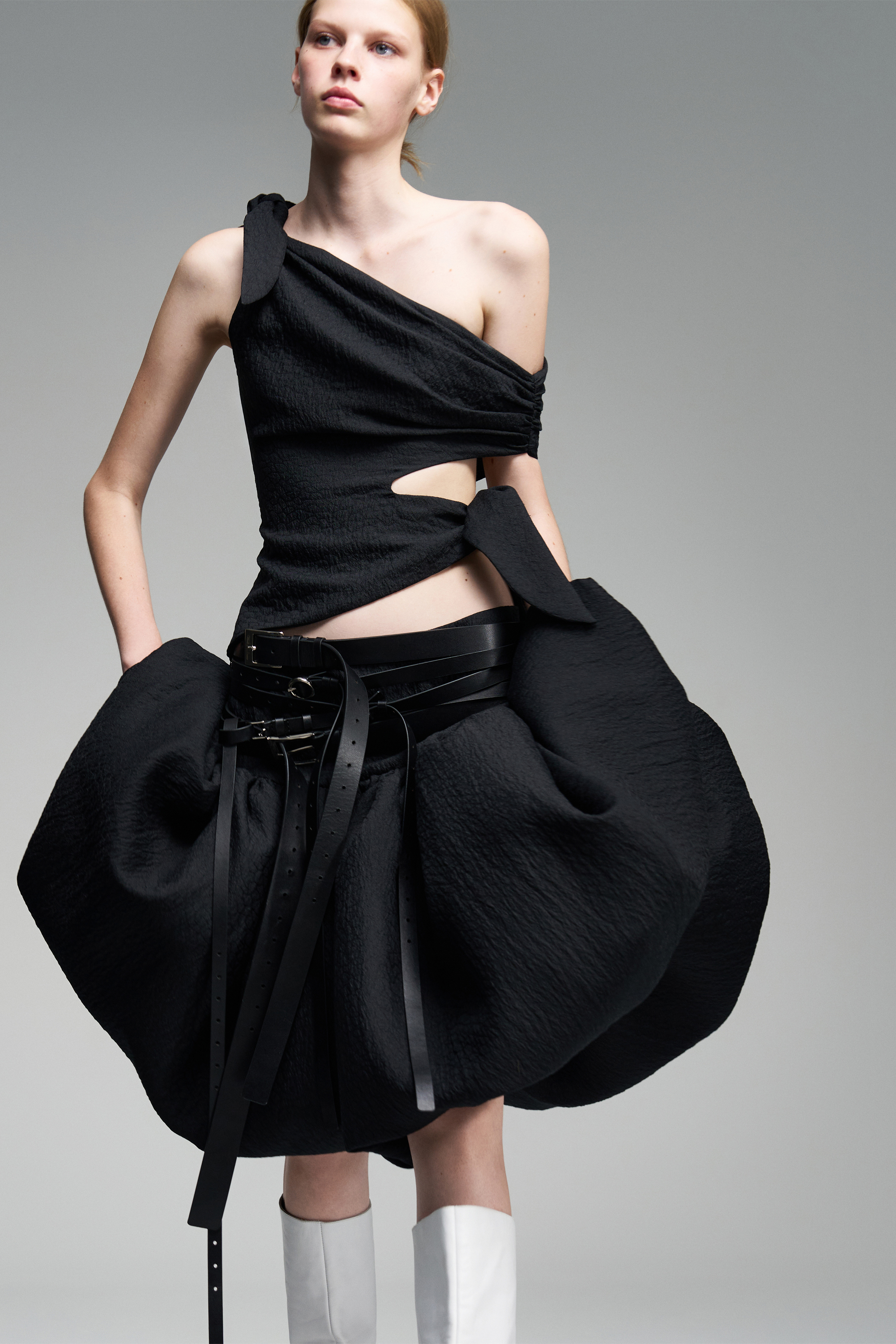 Эта объёмная юбка миди выполнена из фактурного жаккарда, который держит форму и подчёркивает архитектурный силуэт. Широкий пояс плотно фиксируется на бёдрах, а расклёшенная форма-баллон создаёт выразительный объём. Такая юбка становится ярким акцентом, вокруг которого легко строить как вечерние, так и дневные комбинации в духе бренда.