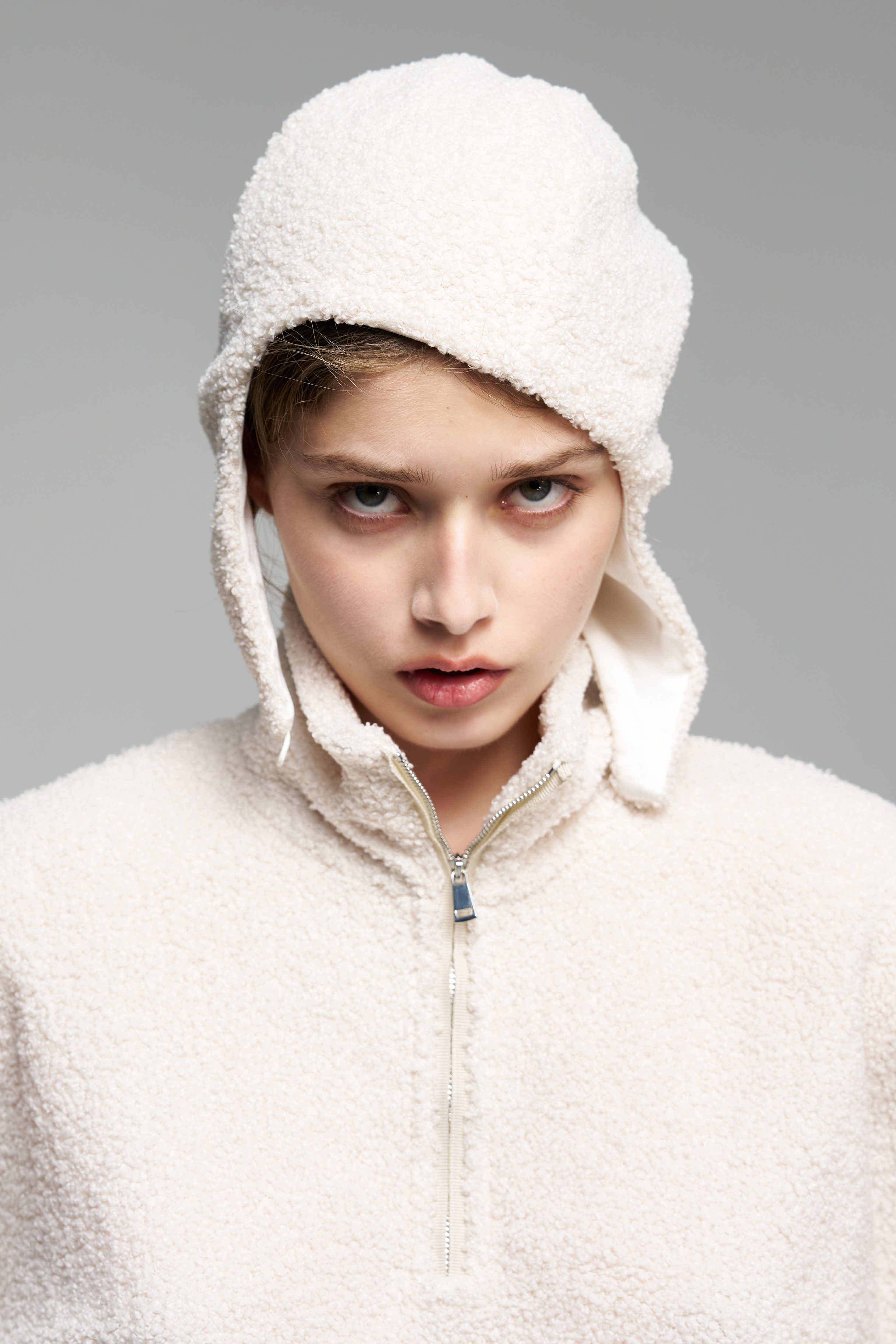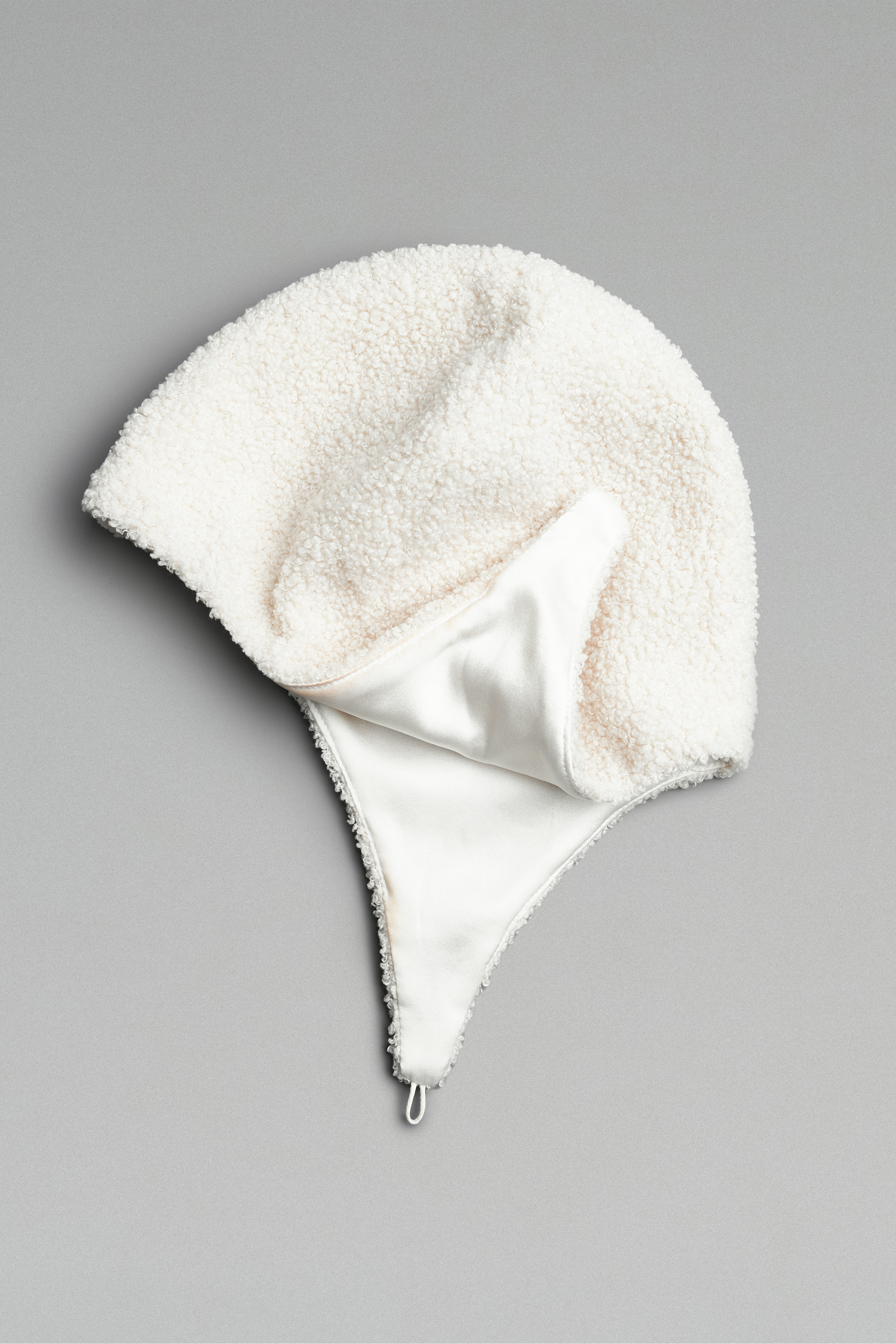 Шапка-шлем, плотно прилегающая по форме головы. Модель застёгивается на пуговицу под подбородком. Изделие из мягкой ткани с шелковой подкладкой.