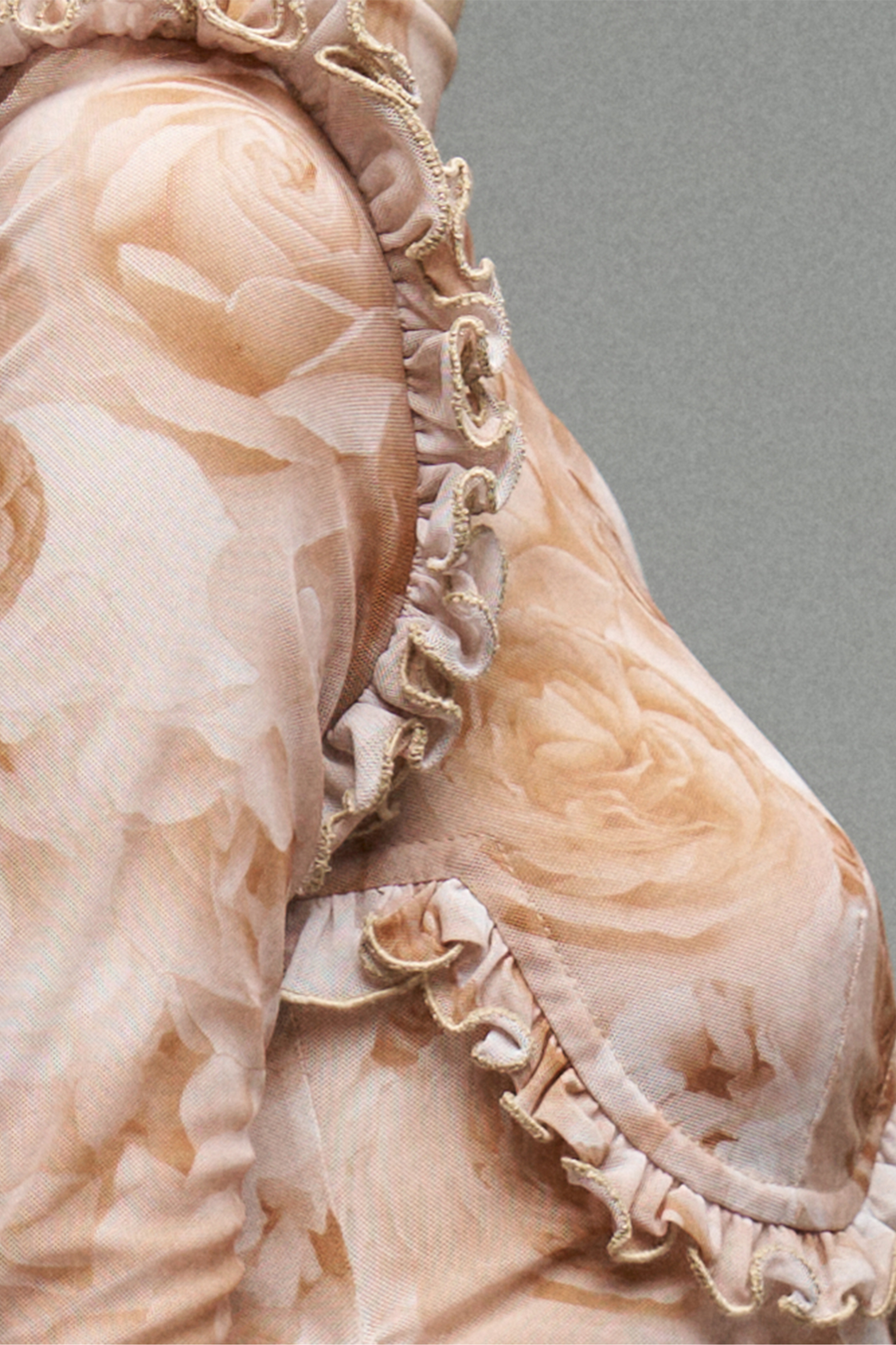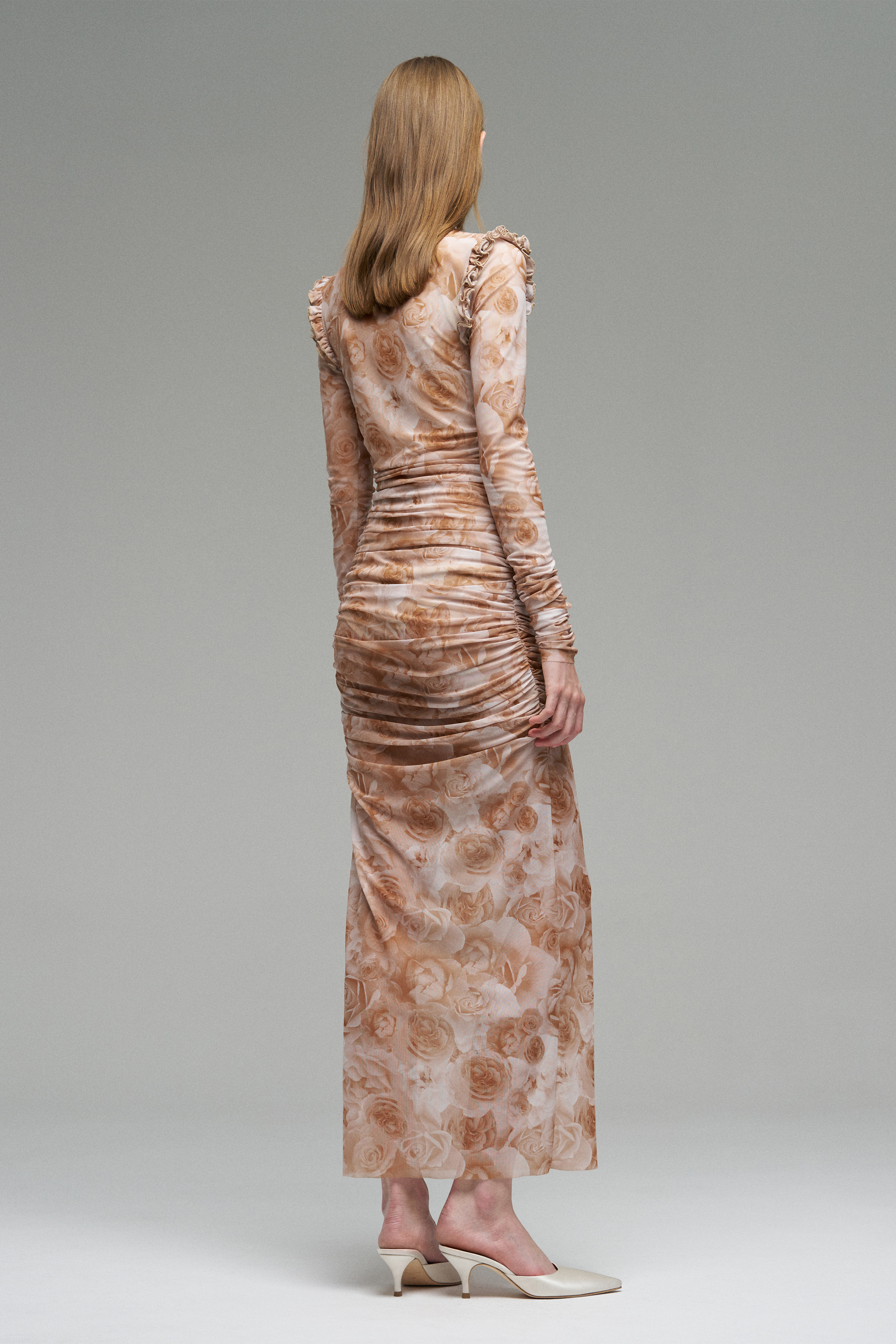 Платье из эластичной сетки с принтом роз. Полупрозрачная ткань мягко драпируется по телу, создавая акцент на силуэте. В конструкции — имитация косточек под грудью и рюши.