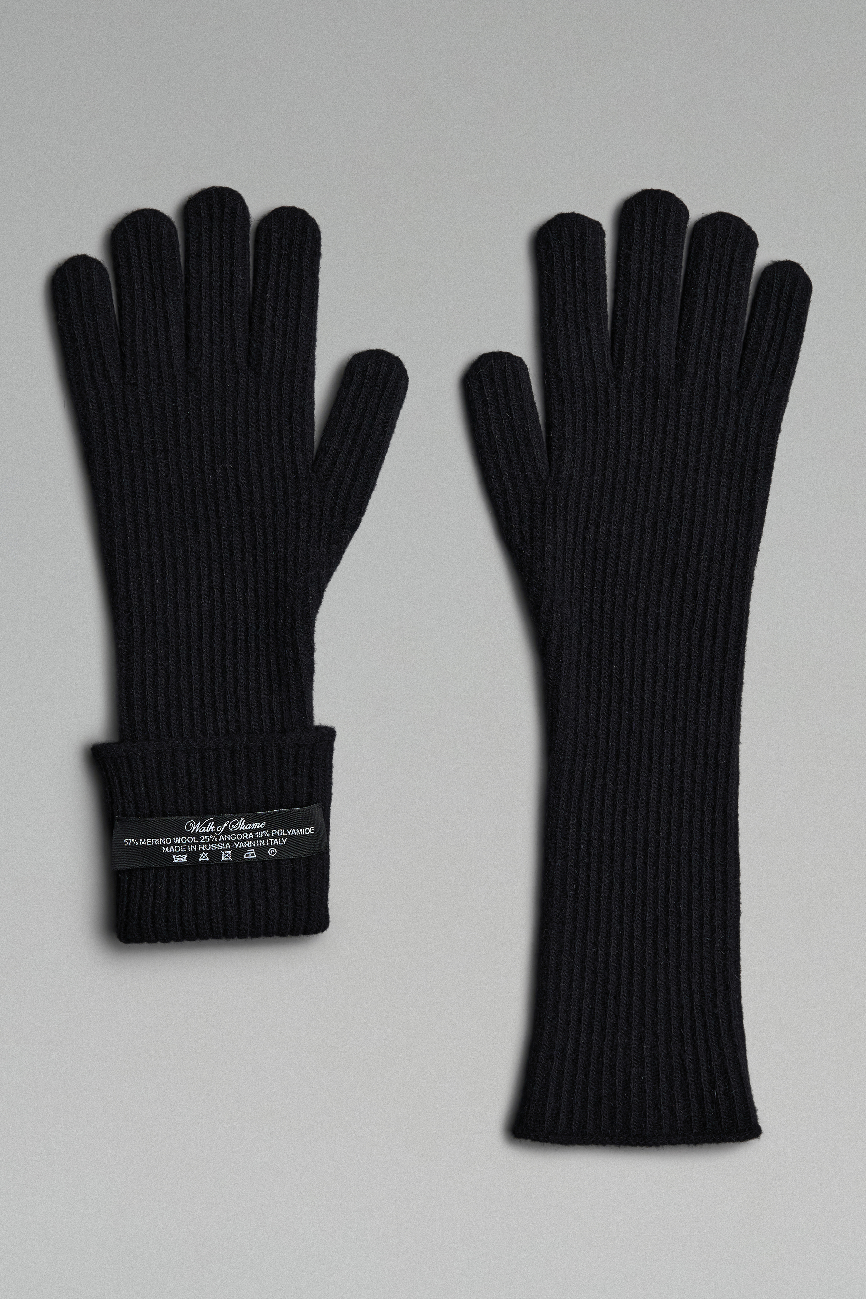 Длинные вязаные перчатки выполнены из мягкой пряжи с добавлением гипоаллергенной шерсти ангоры и мериноса — они тёплые, деликатные к коже и комфортные в носке. Длина до локтя позволяет носить их как полностью расправленными и заправленными под верхнюю одежду, так и в присборенном виде. Обе перчатки украшены репсовой лентой с логотипом бренда, а с изнанки дополнены жаккардовым лейблом, который при желании можно снять.