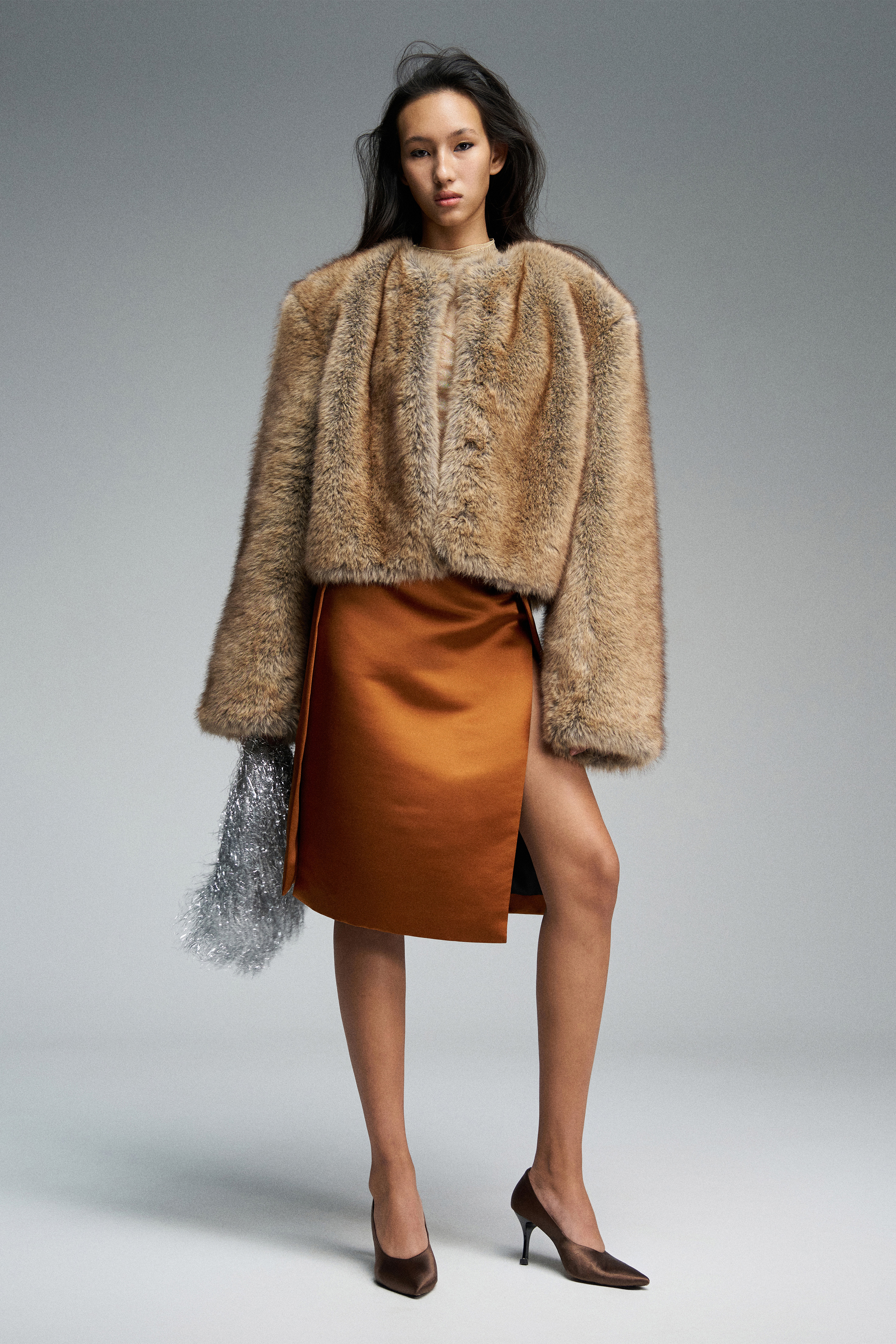 Укороченная шуба из искусственного меха, который выглядит как баргузинский соболь. Подклад выполнен из натурального шёлка нежно-розового цвета и украшен фирменной вышивкой. Модель застёгивается на крючки. Несмотря на искусственное происхождение меха, шуба отлично сохраняет тепло и благодаря длине подходит к любому образу.