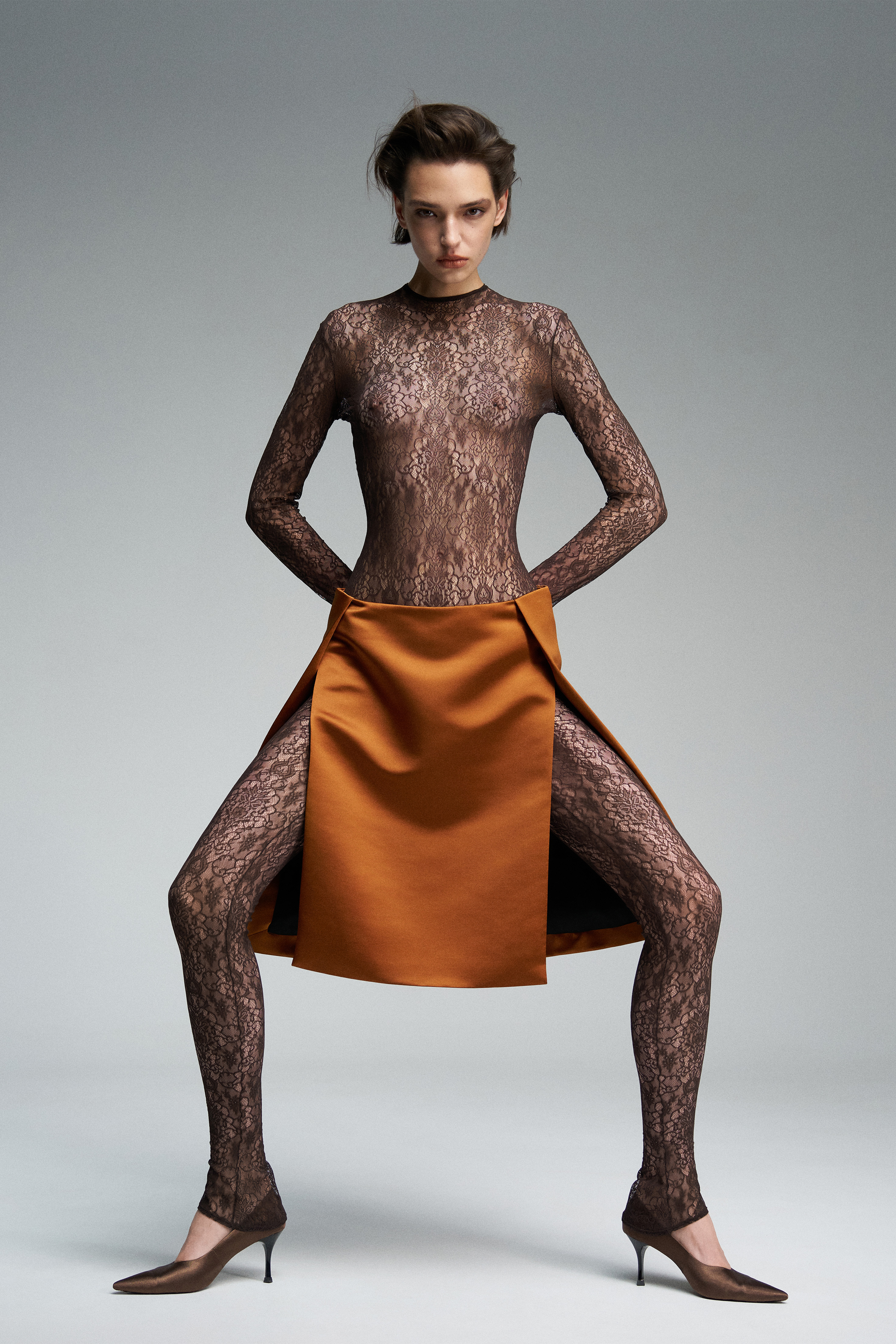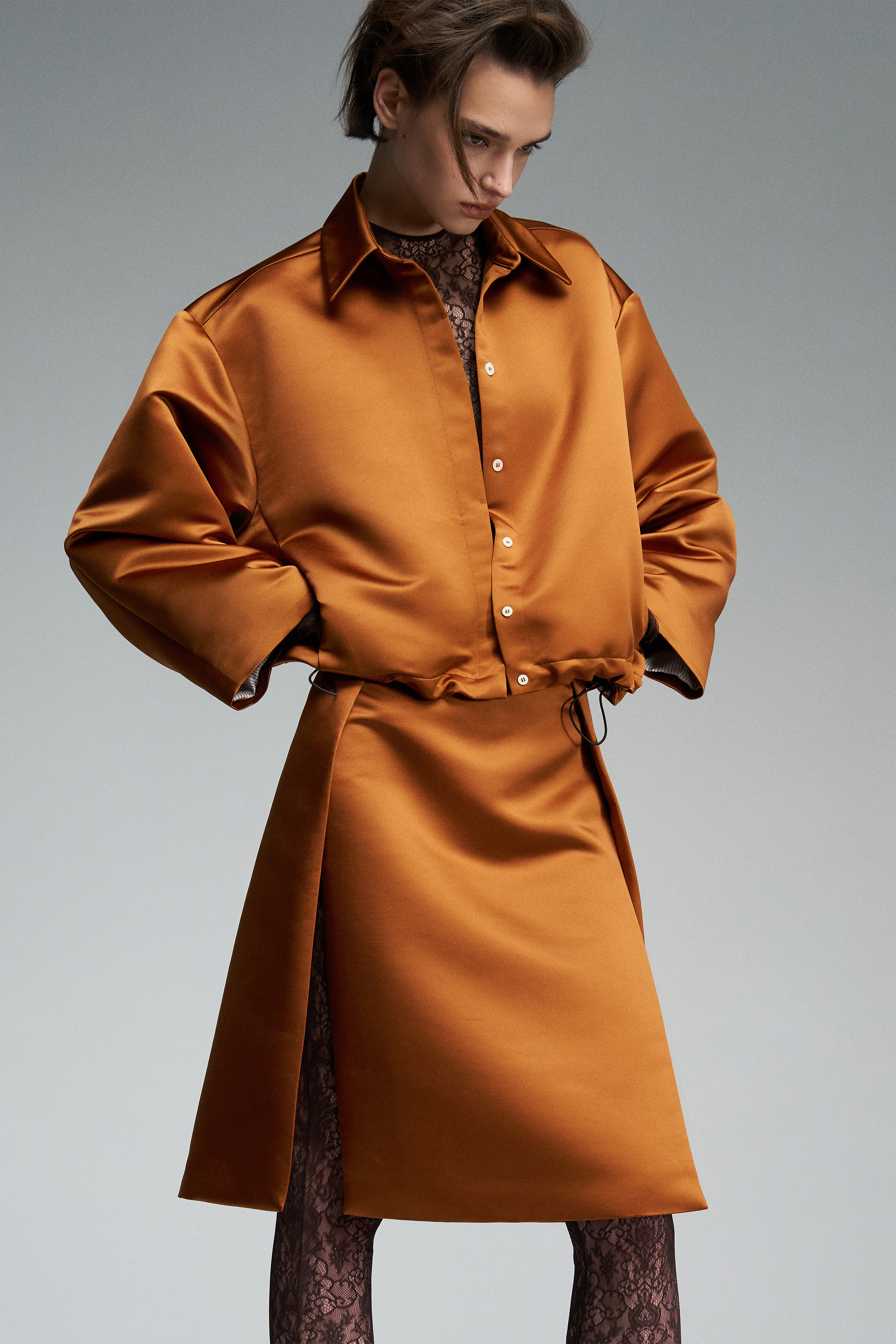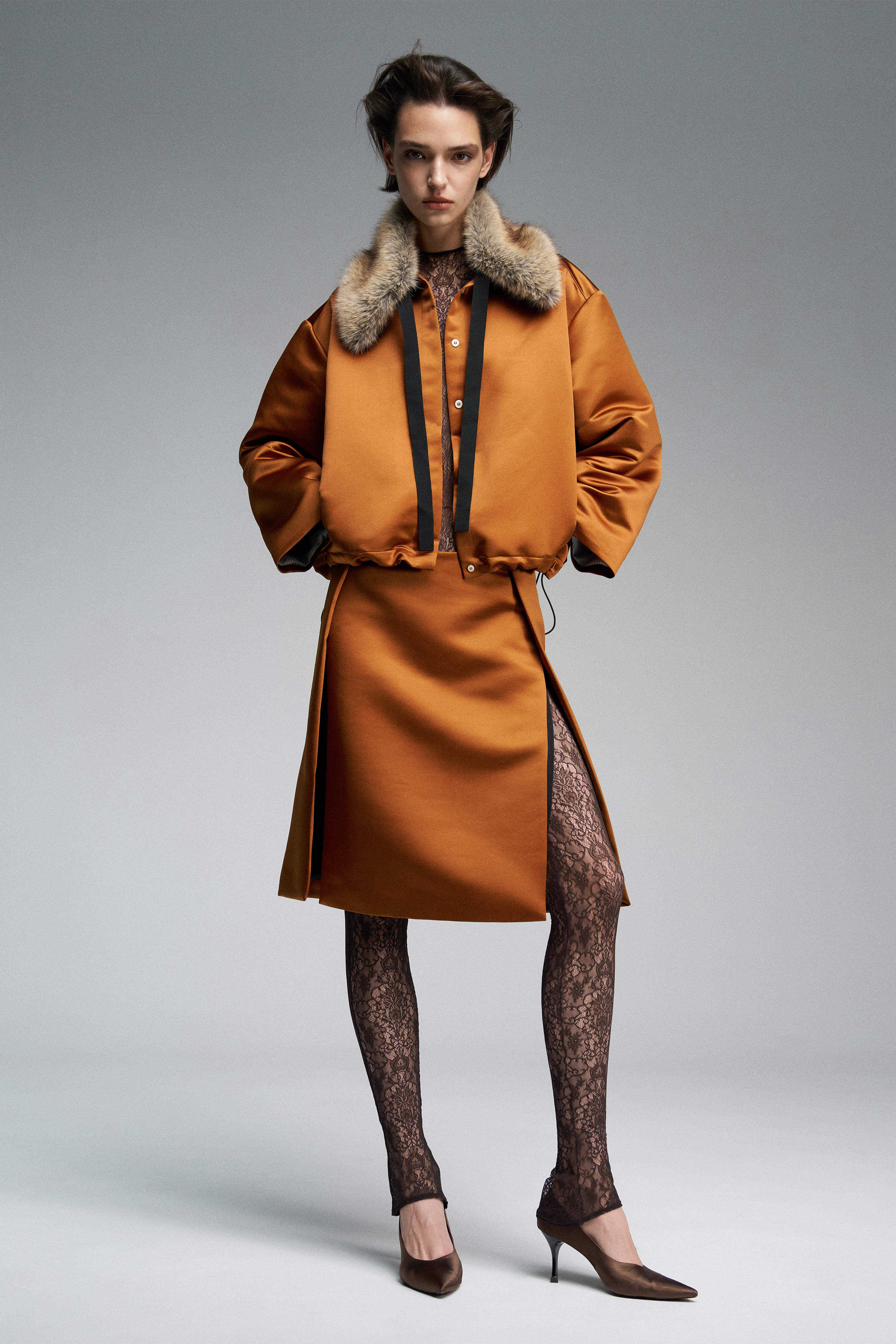 Юбка из сатина длиной до колена с волнительными разрезами по бокам. Модель выполнена на подкладе для более выразительного силуэта. Застёжка — скрытая молния по спинке.