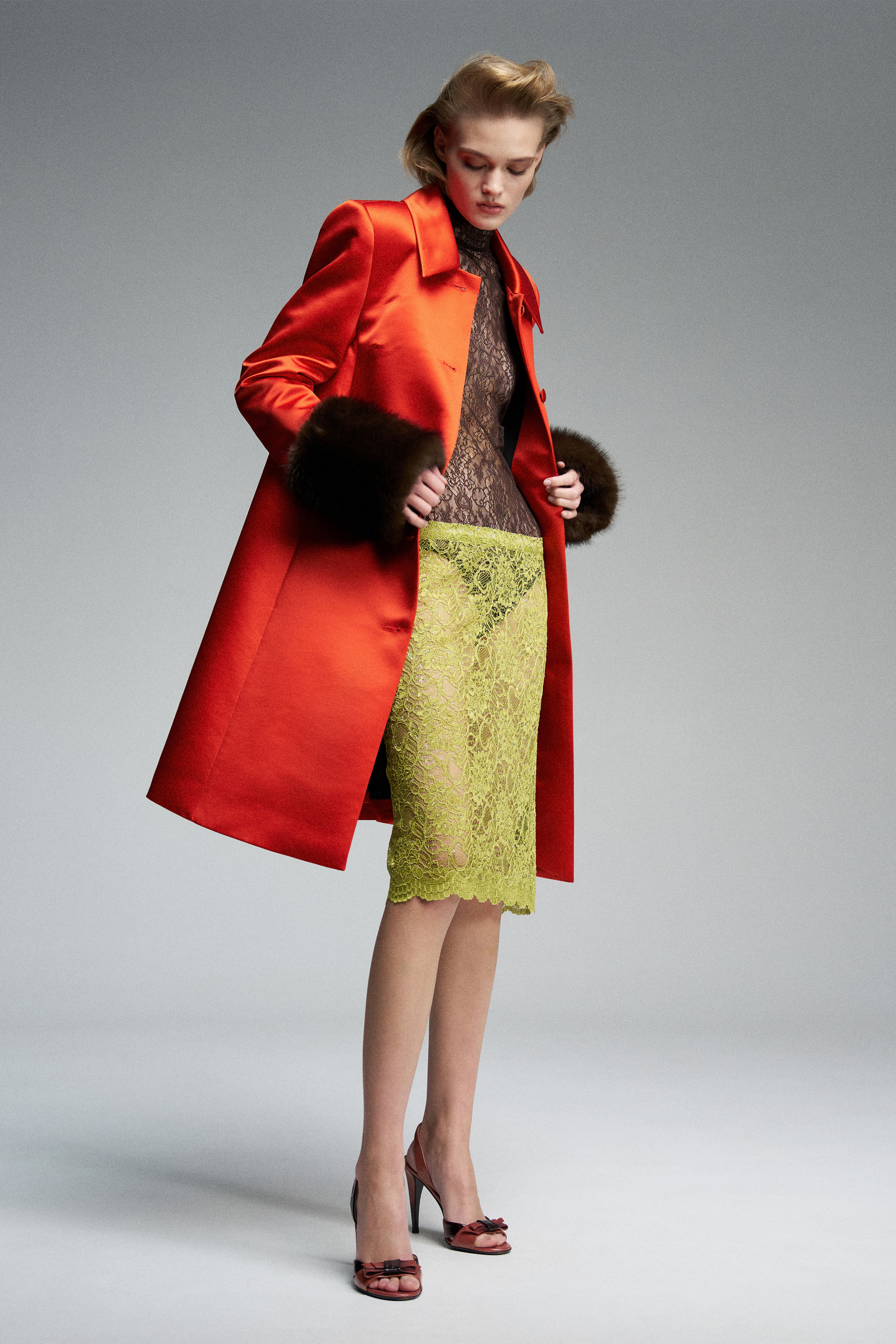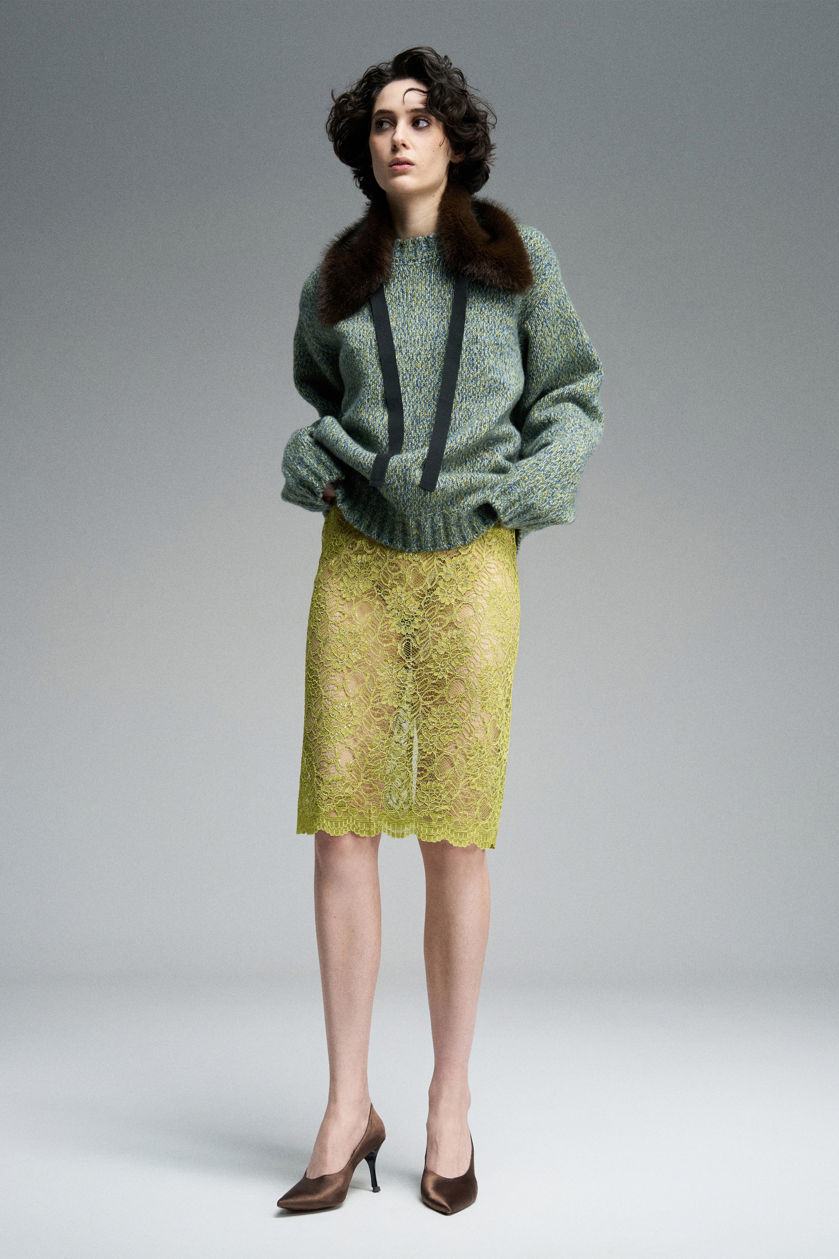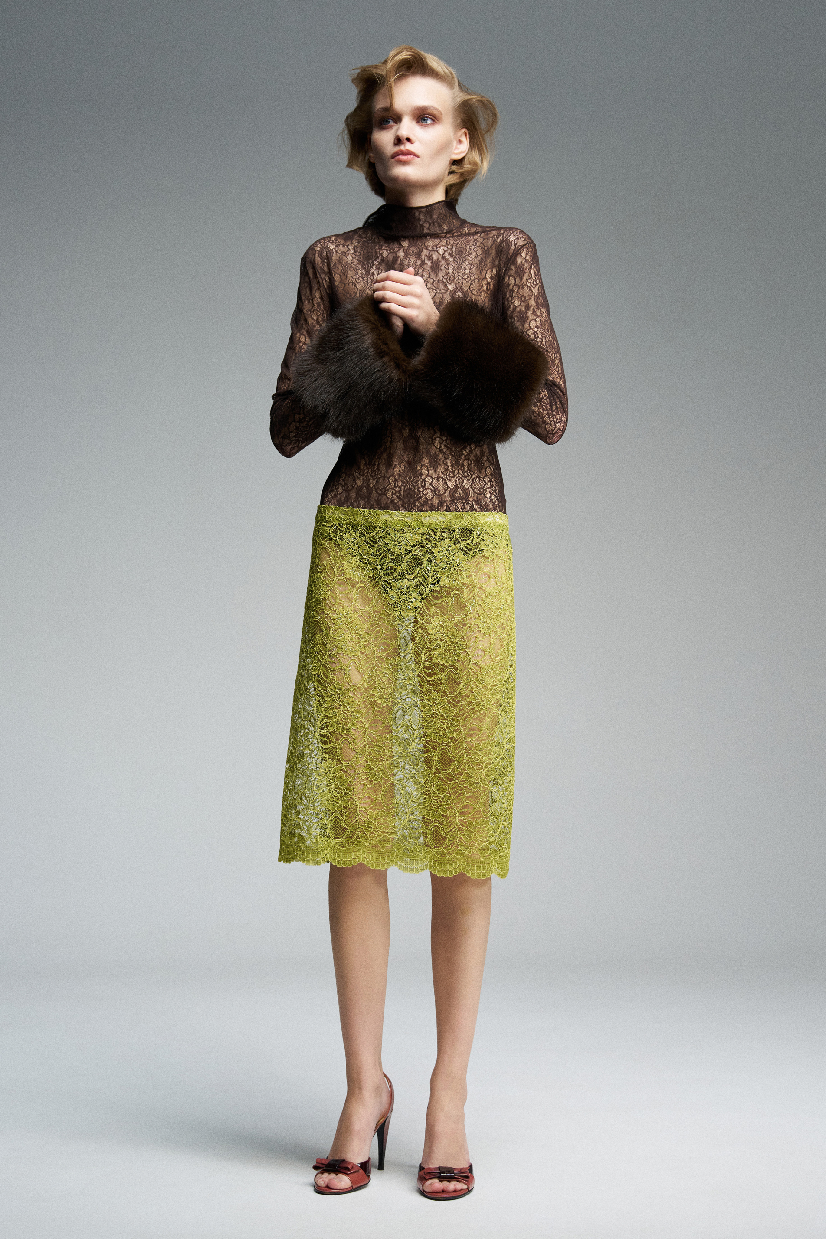 Прозрачная юбка миди из японского кружева салатового цвета. При создании полотна используются нити разной толщины, что придаёт рисунку объём и фактурно выделяет орнамент. Нижний край сохранён с естественными фистонами кружева.