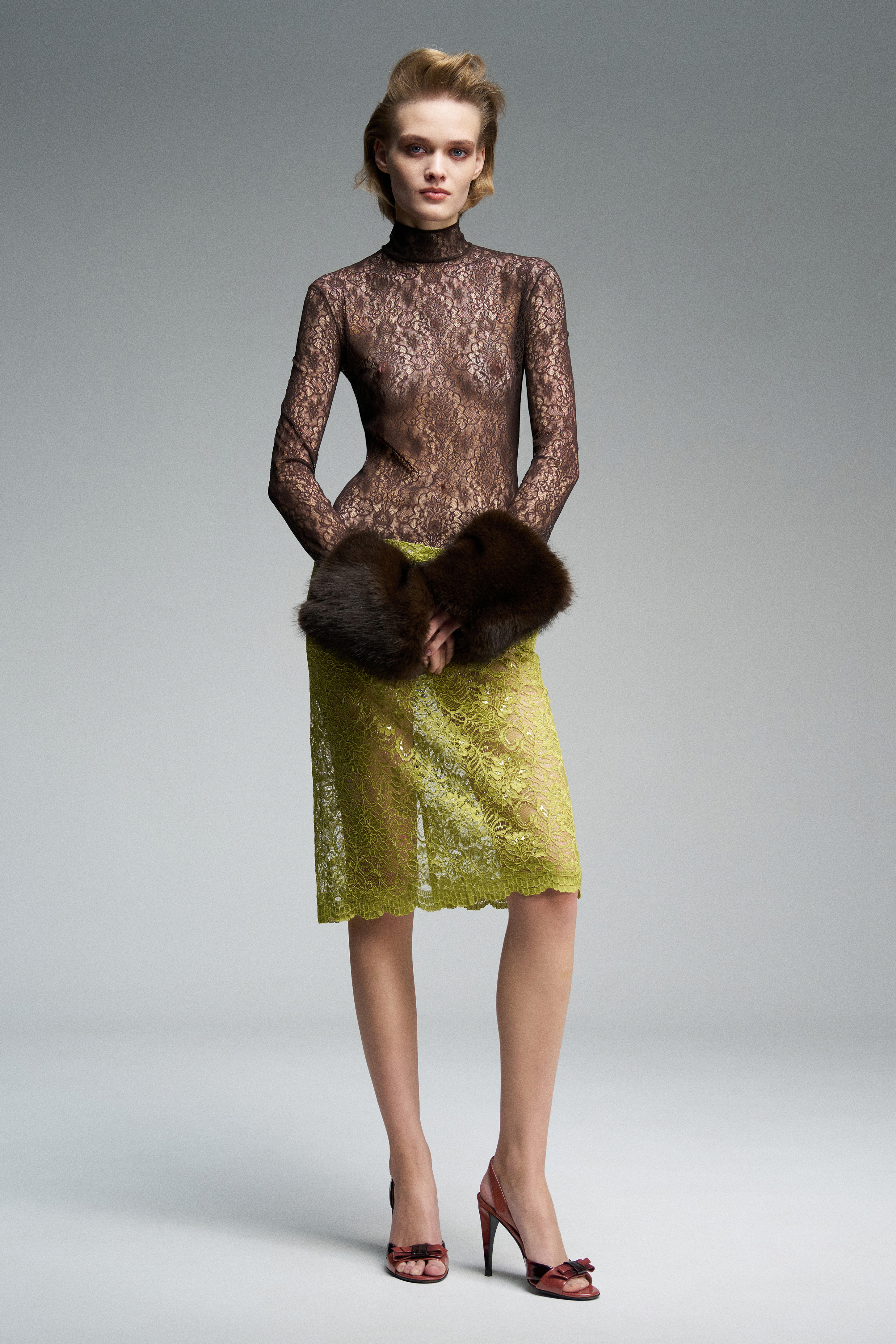 Боди из японского кружева с длинными рукавами и воротником-стойкой. По спинке — застёжка на молнию, по низу — на кнопках. Изделие плотно прилегает к телу и подчёркивает силуэт.