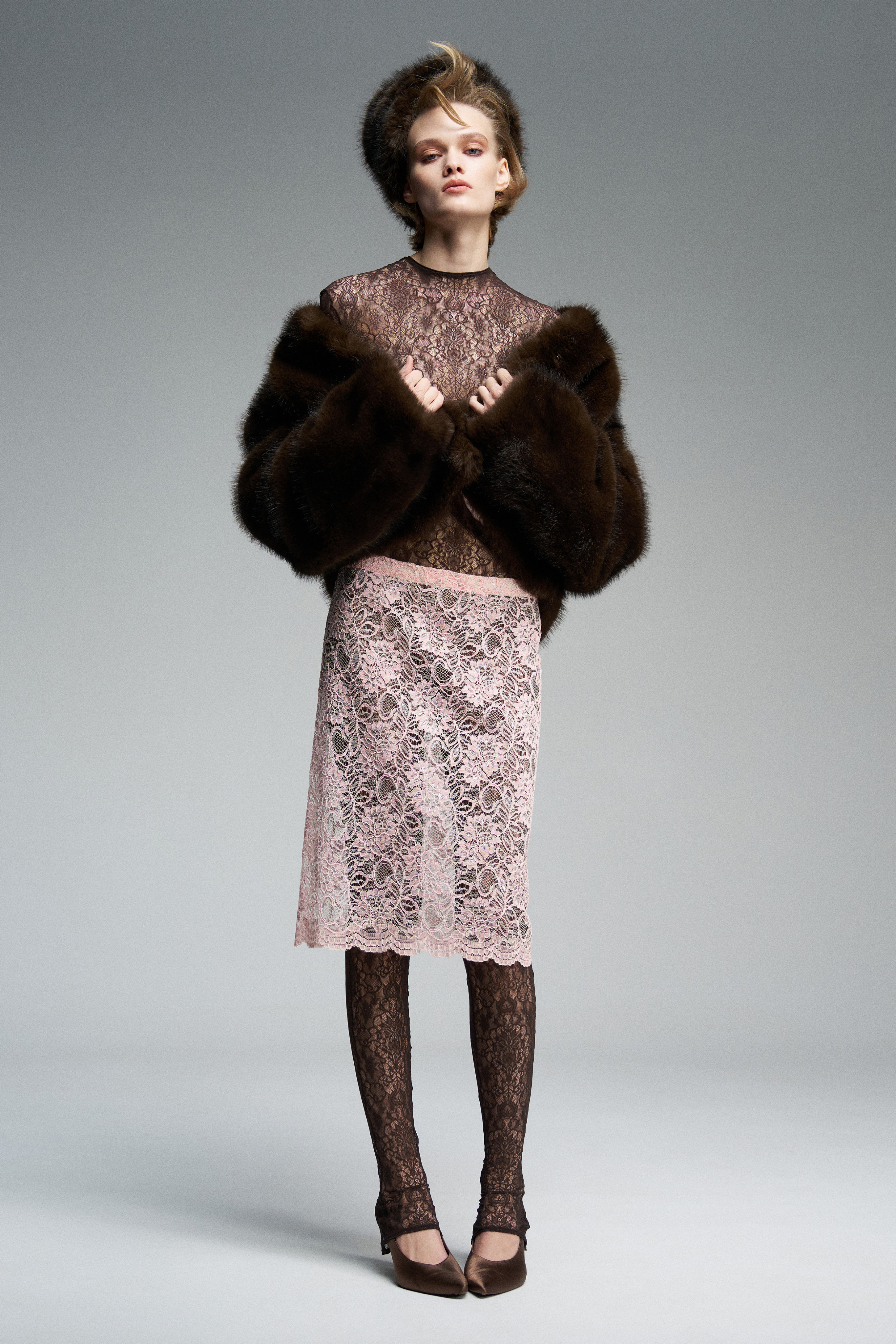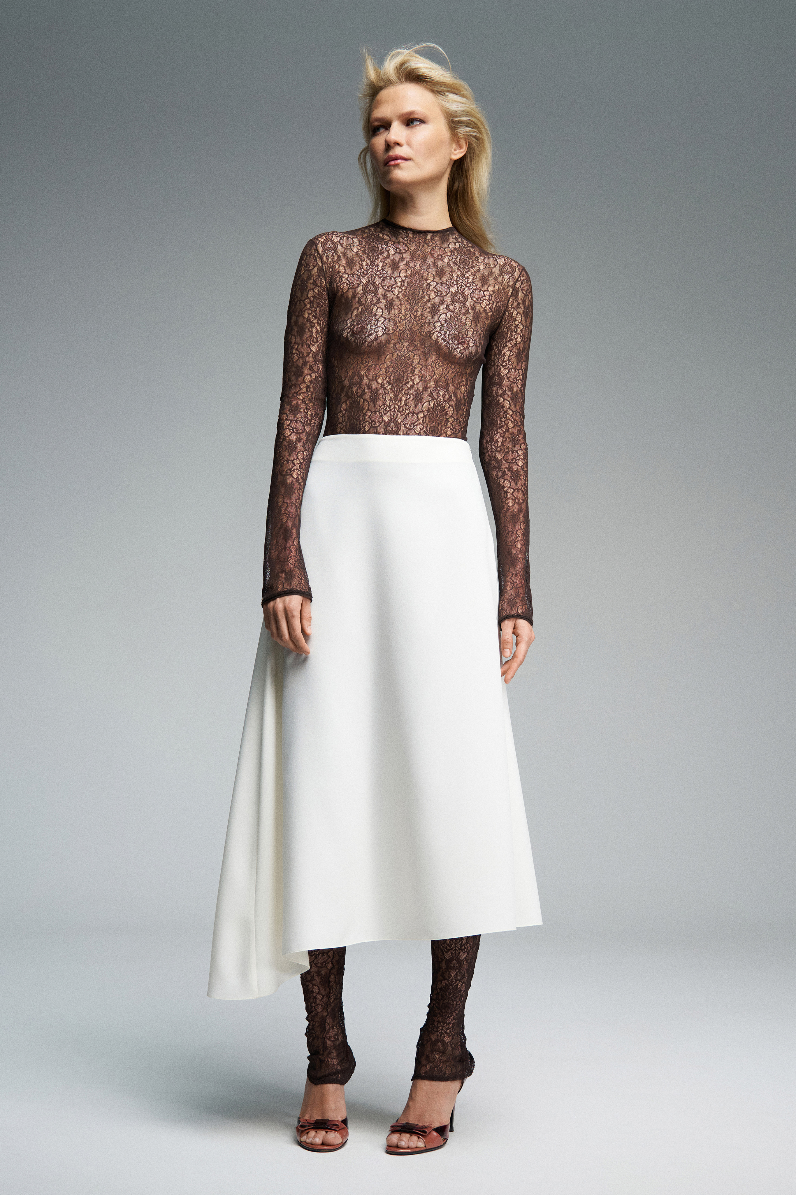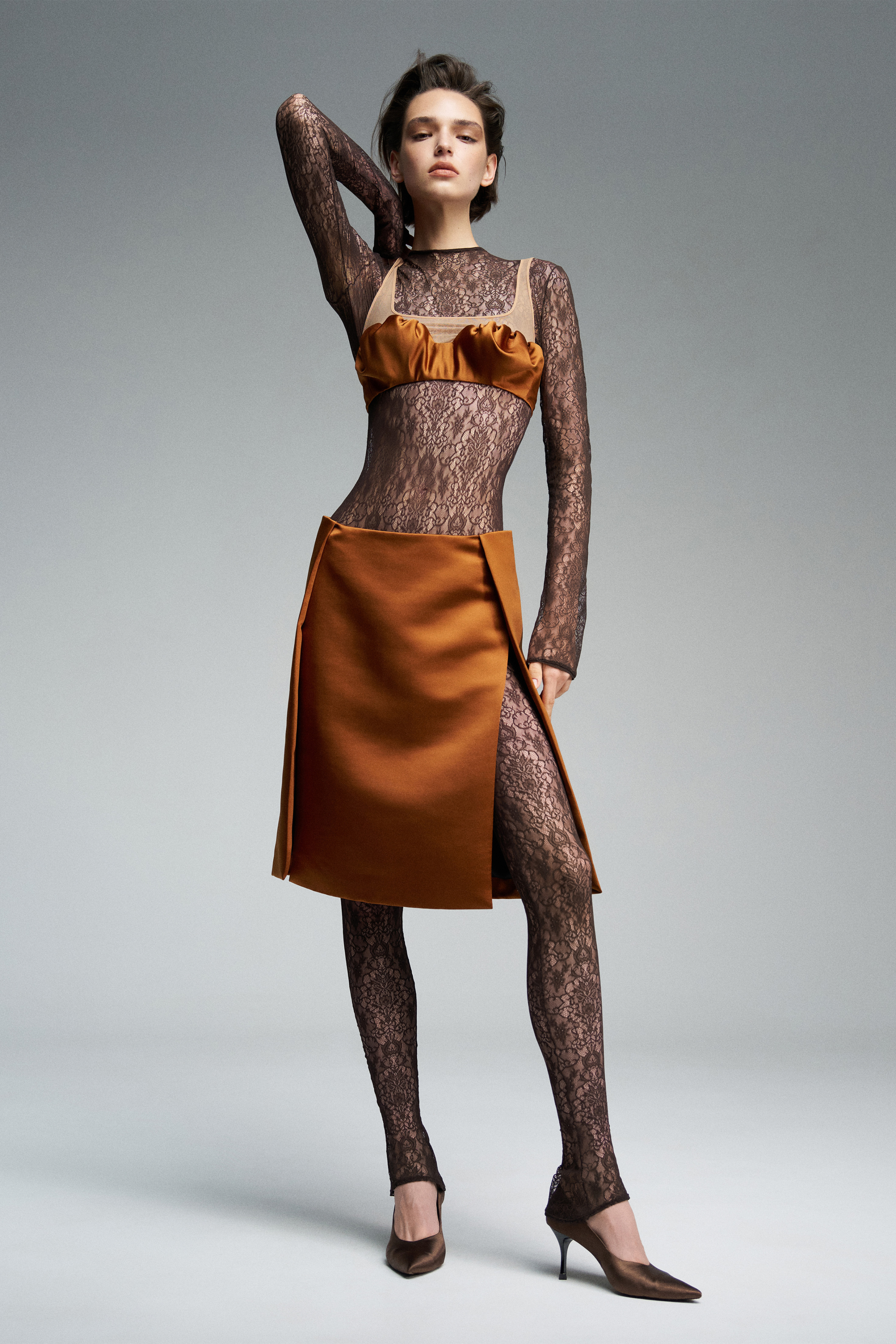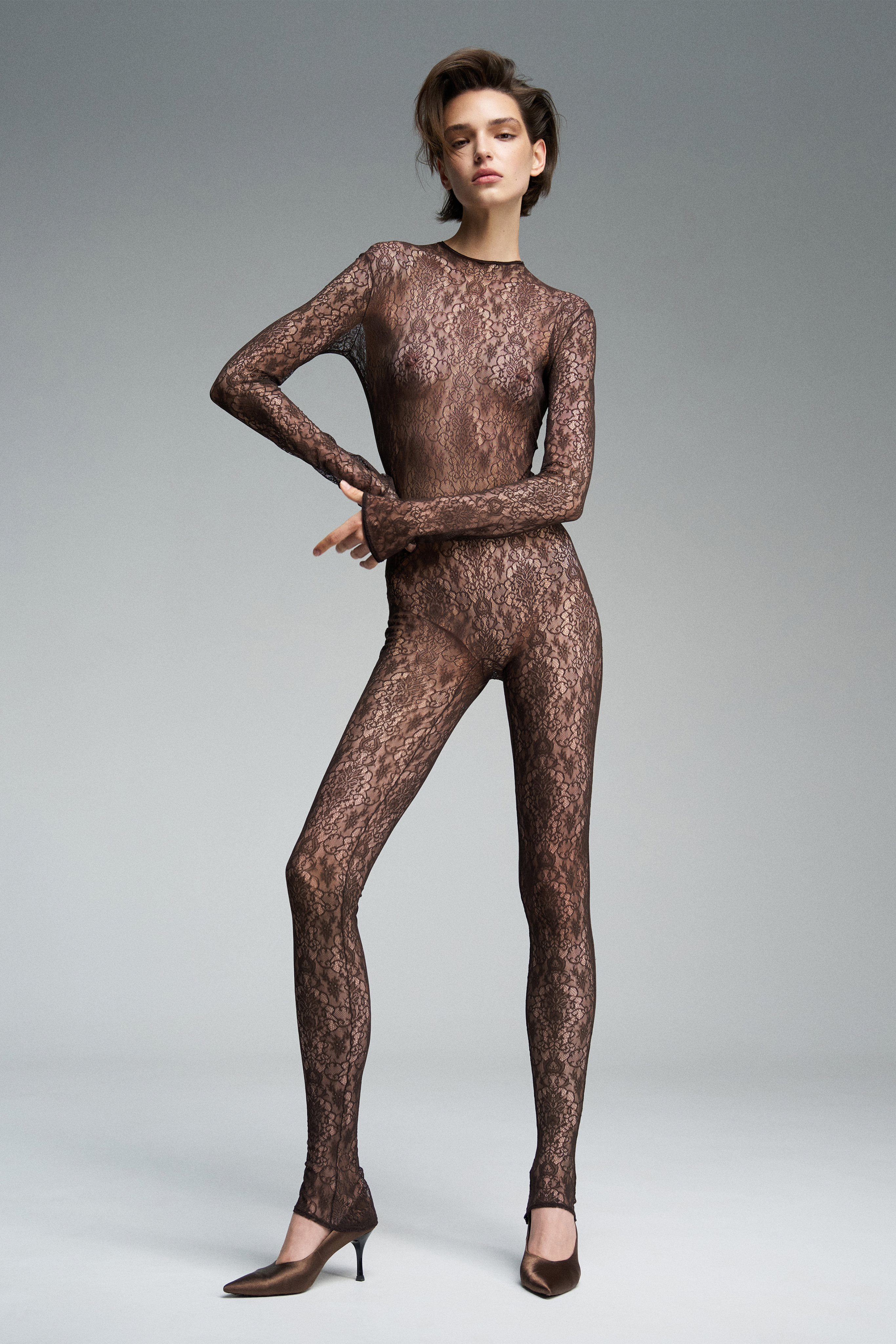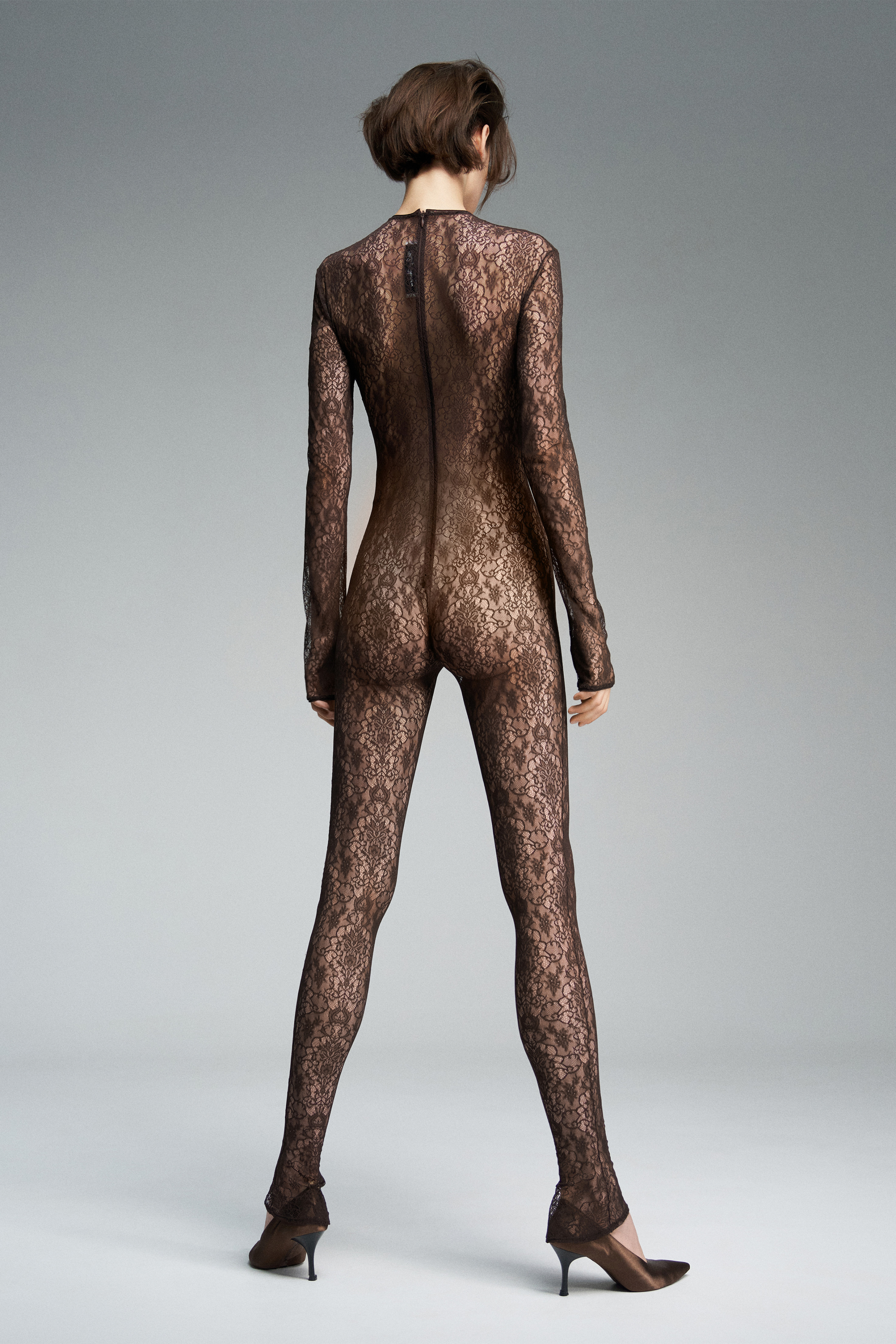 Комбинезон из кружева с воротником-стойкой. По спинке — застёжка на молнию, благодаря которой изделие плотно прилегает к телу и подчёркивает силуэт.