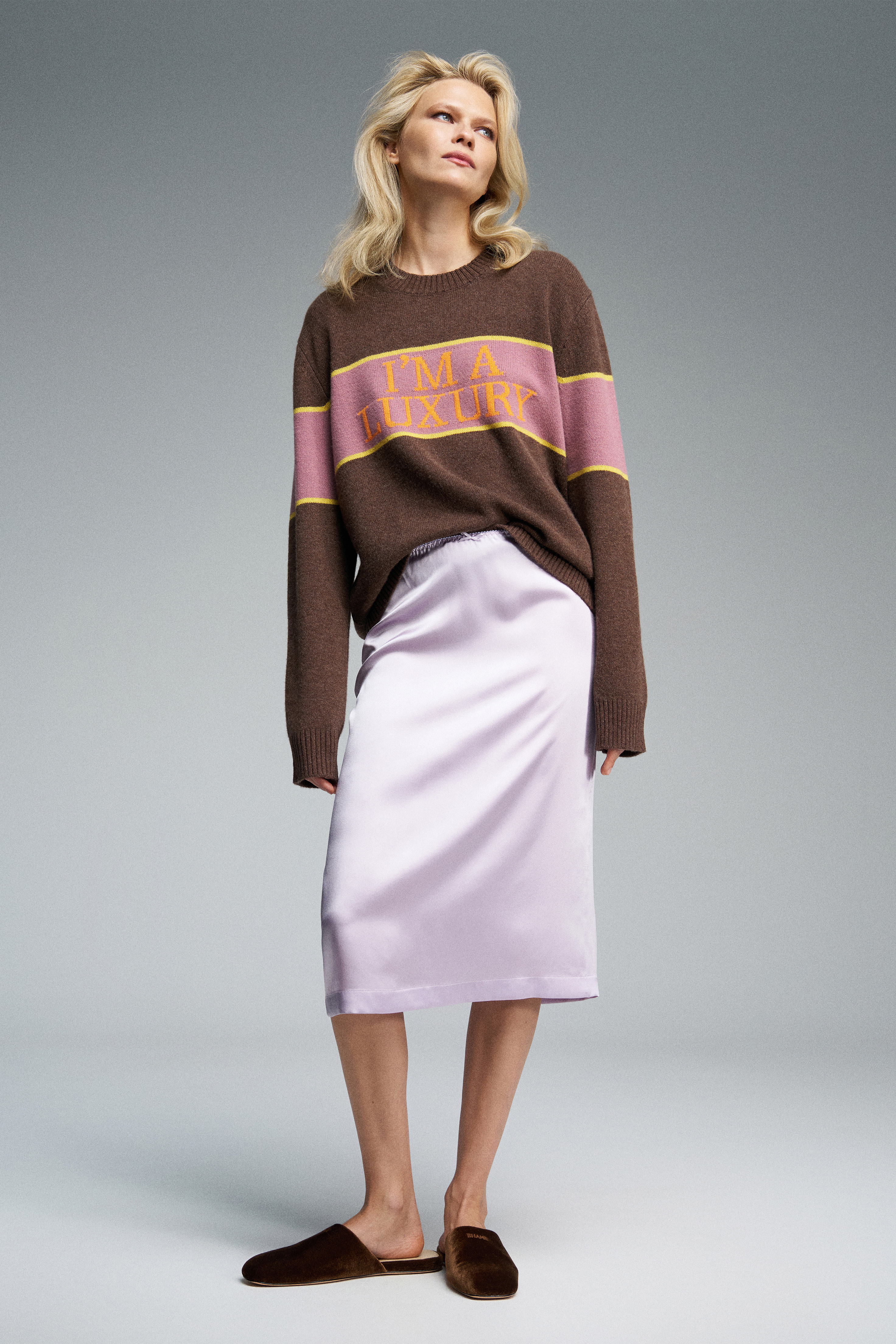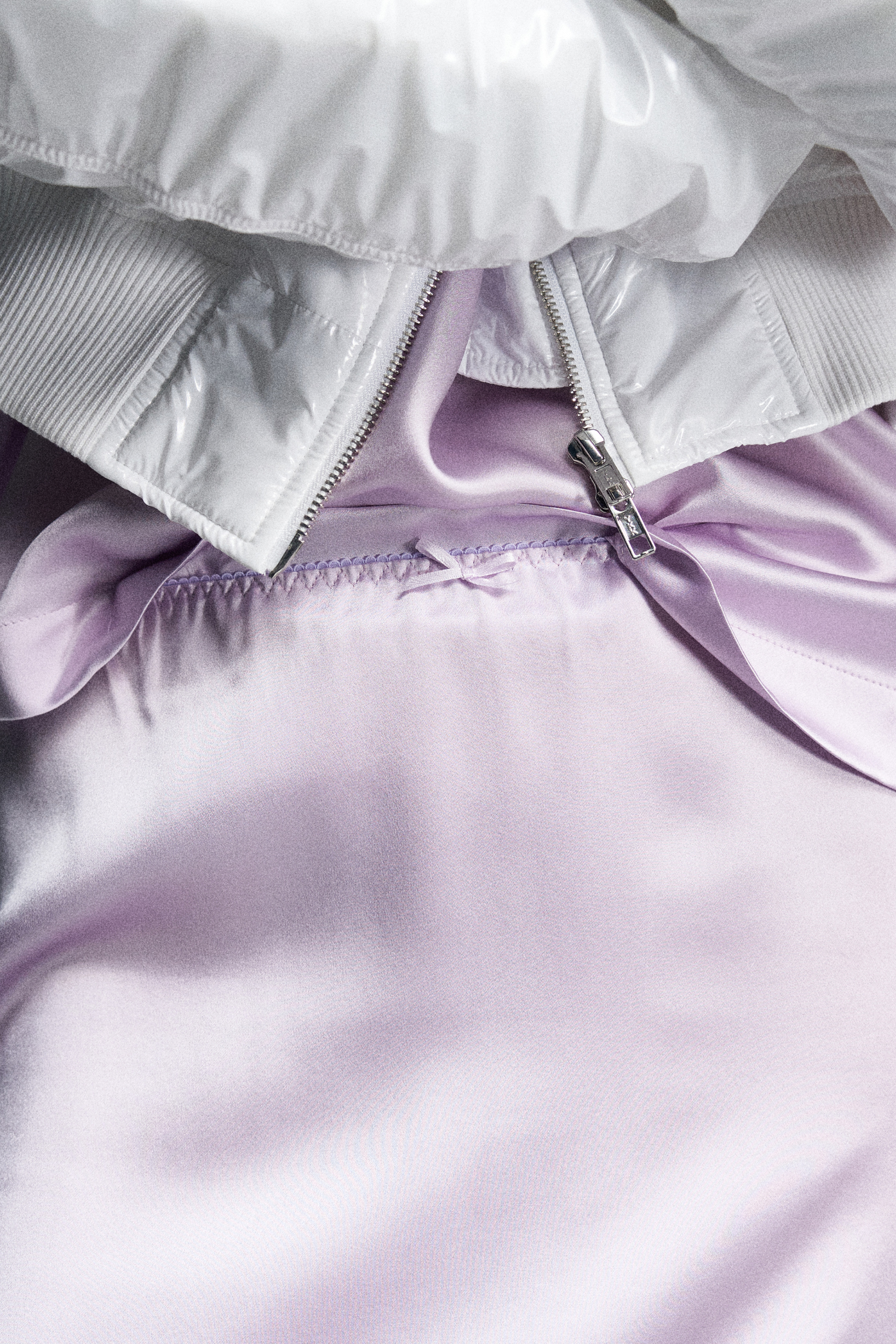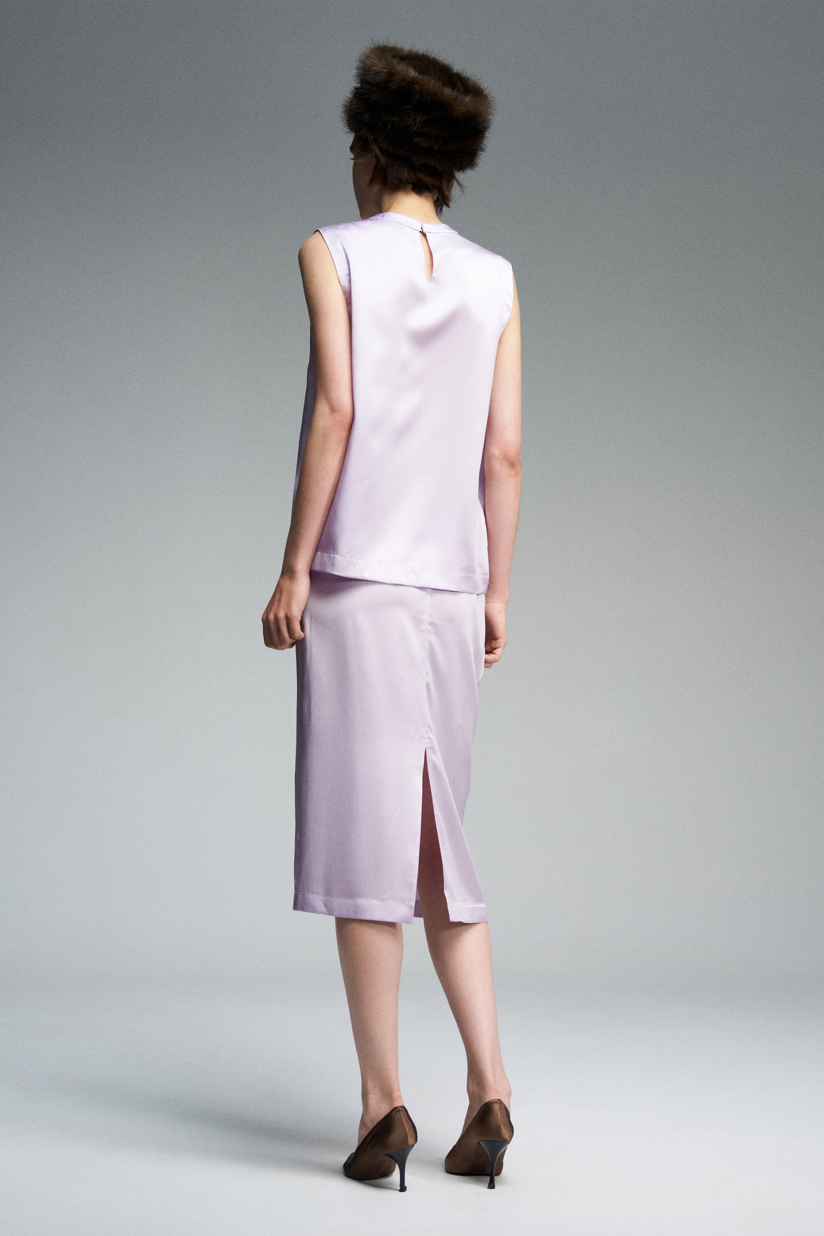 Юбка миди из натурального английского шёлка нежно-розового цвета. Изделие на бельевой резинке, украшенной спереди декоративным бантиком. Сзади — шлица и скрытая застёжка на молнию. Можно носить как самостоятельно, так и в качестве второго слоя под платье или юбку.