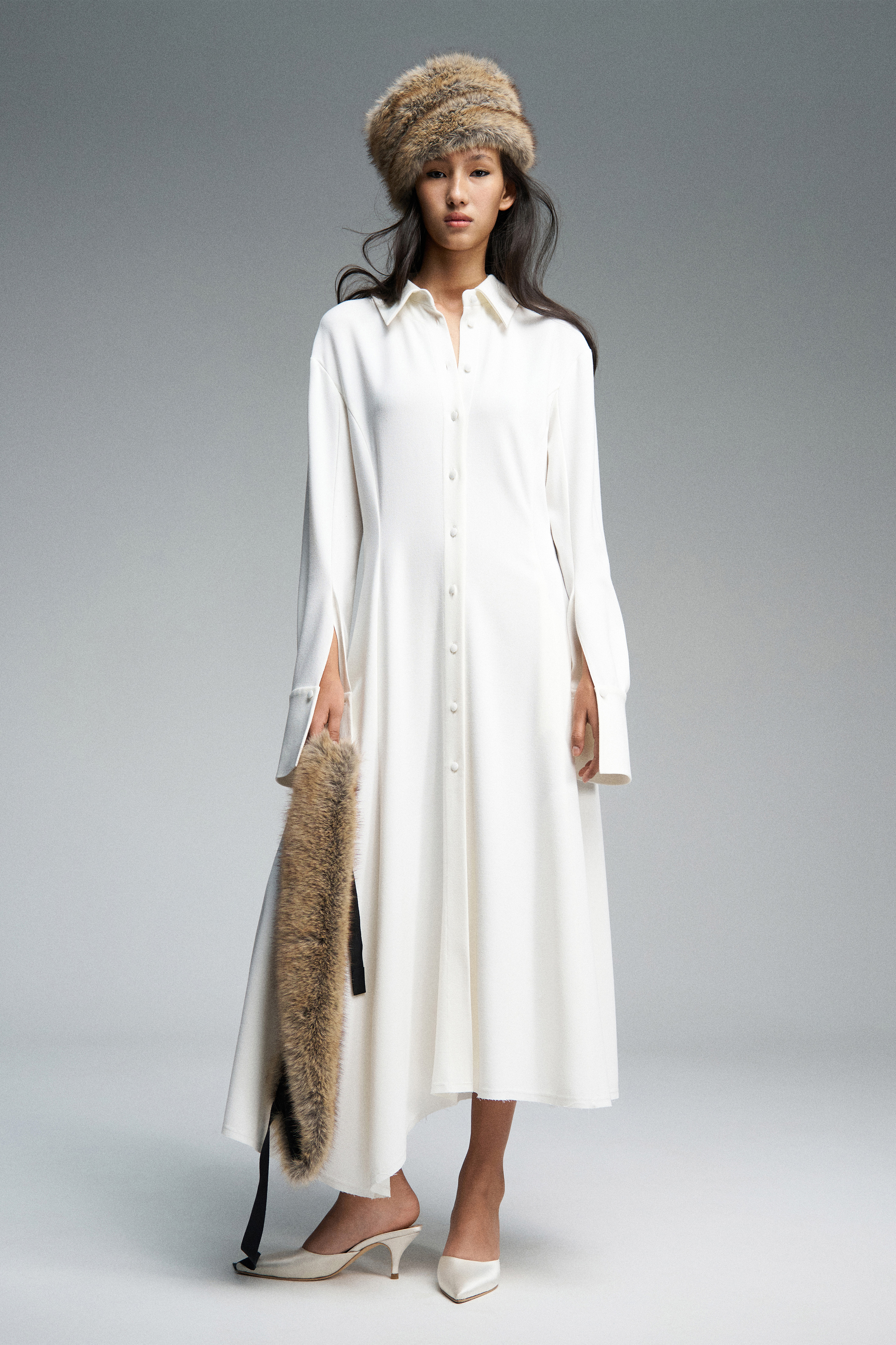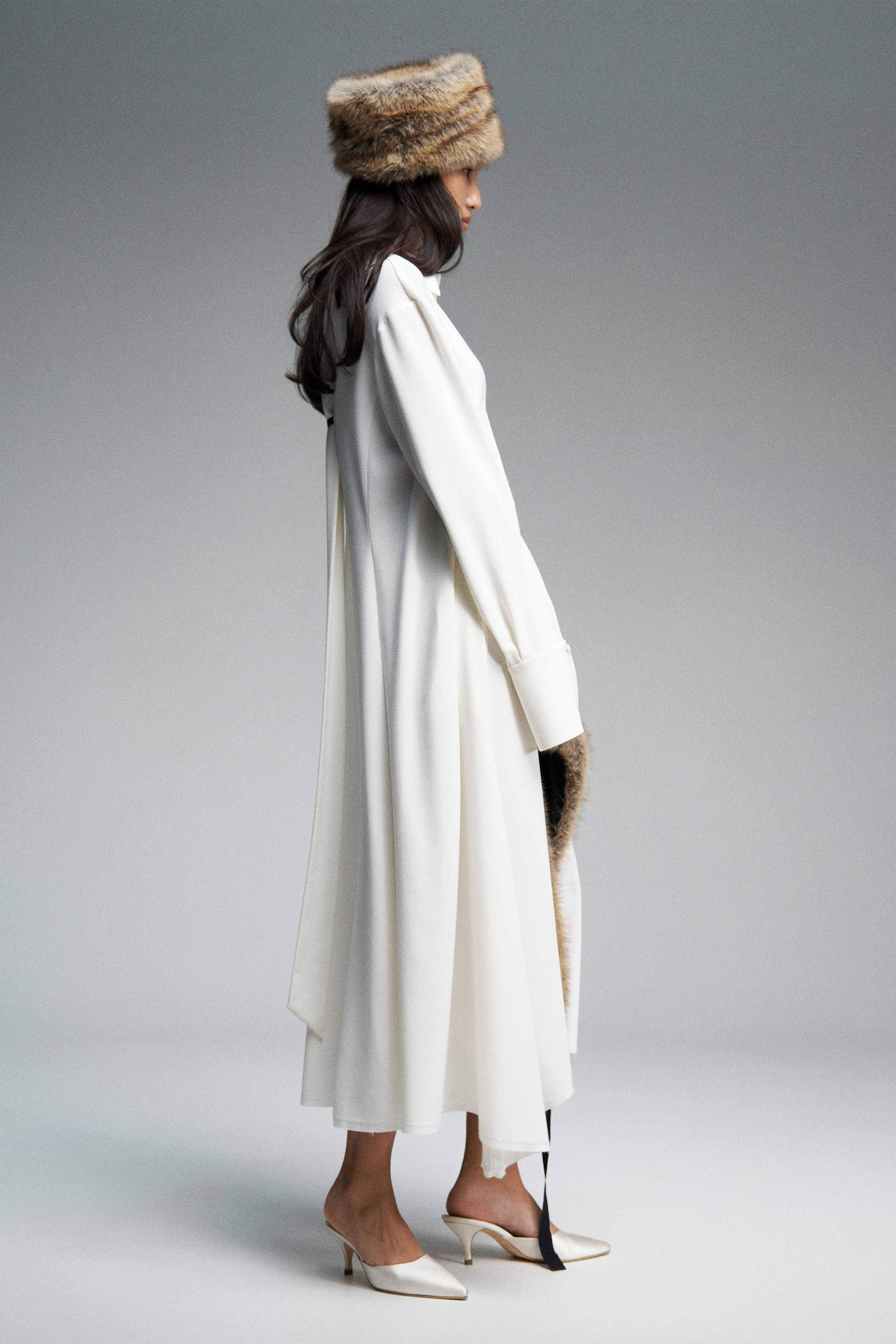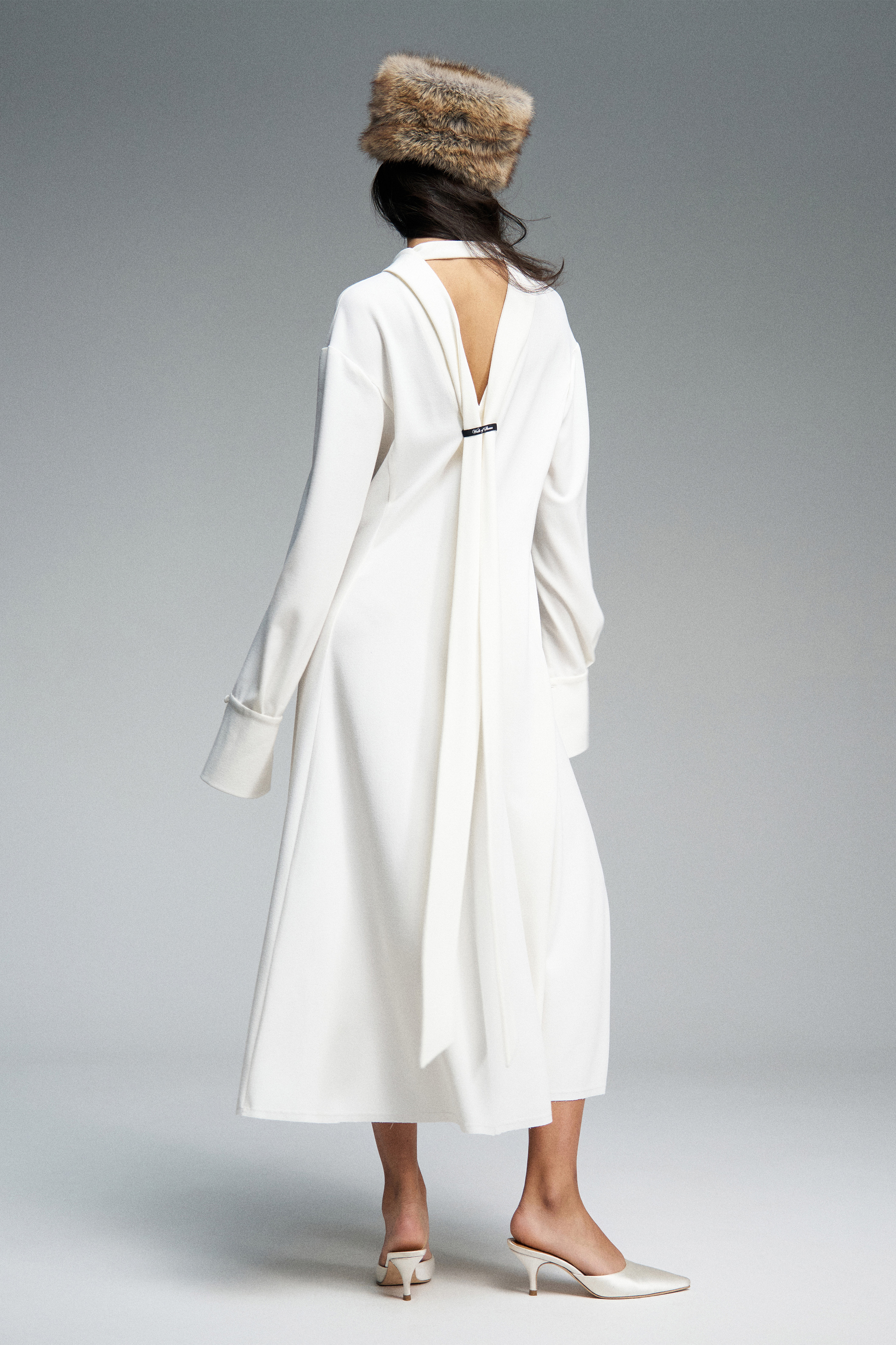 Платье миди с лёгким приталенным силуэтом из шерстяного крепа. Воротник спереди имеет классическую рубашечную форму, а сзади переходит в длинные выразительные ленты, которые можно использовать как шарф. По спинке — V-образный вырез и репсовая тесьма с логотипом бренда. Юбка асимметричная. Модель с длинными рукавами и планкой на пуговицах: в расстегнутом виде манжеты плавно ниспадают вниз.
