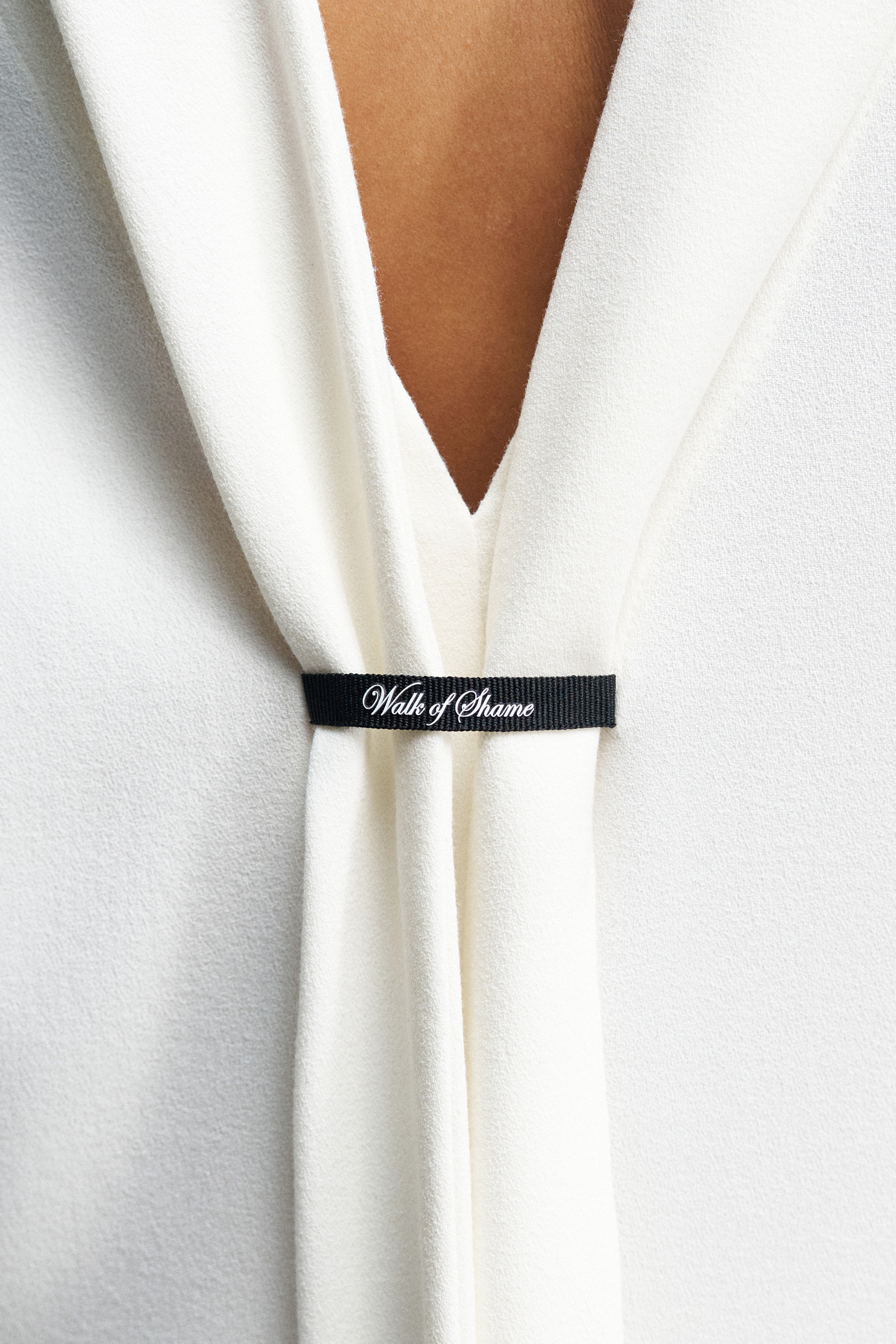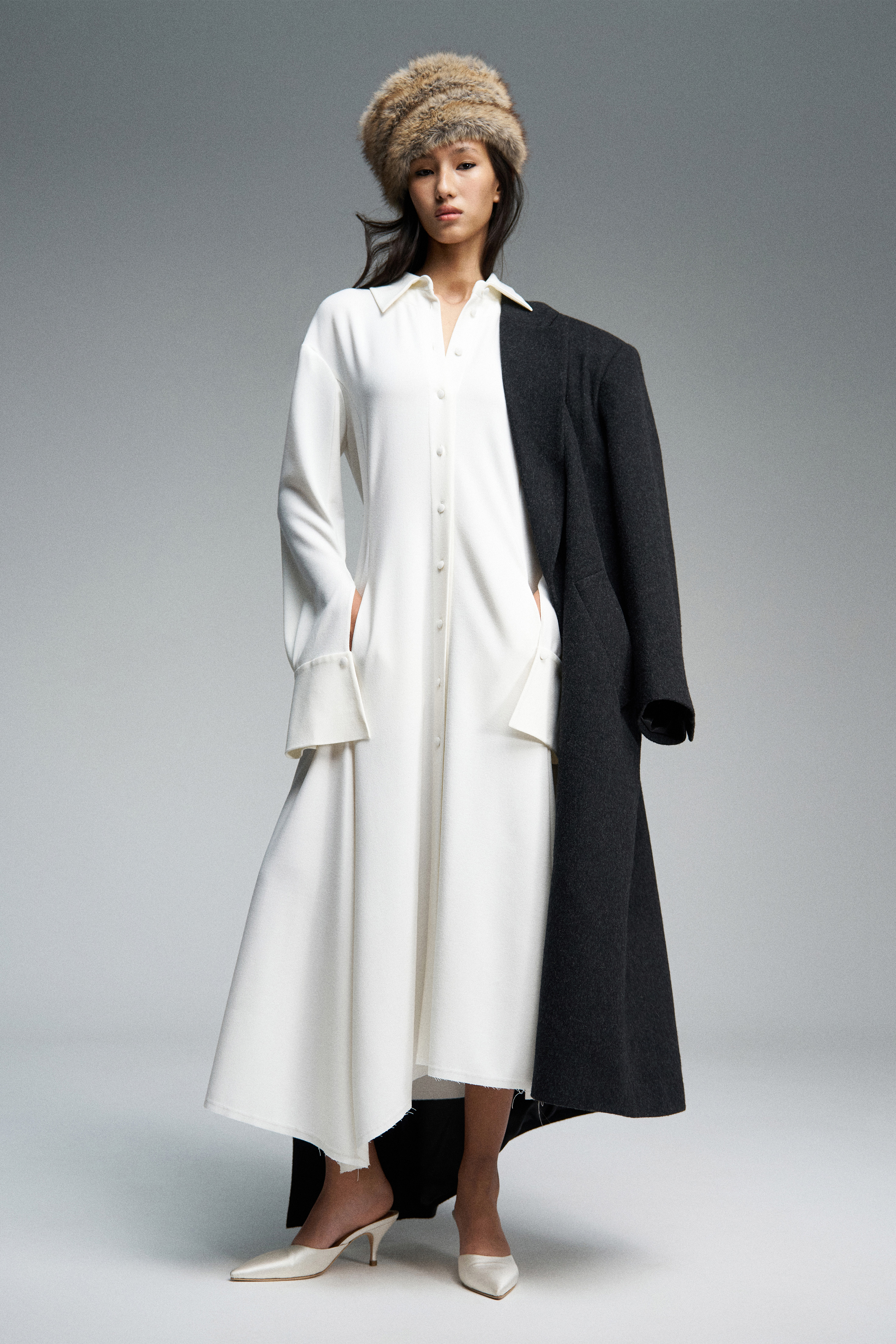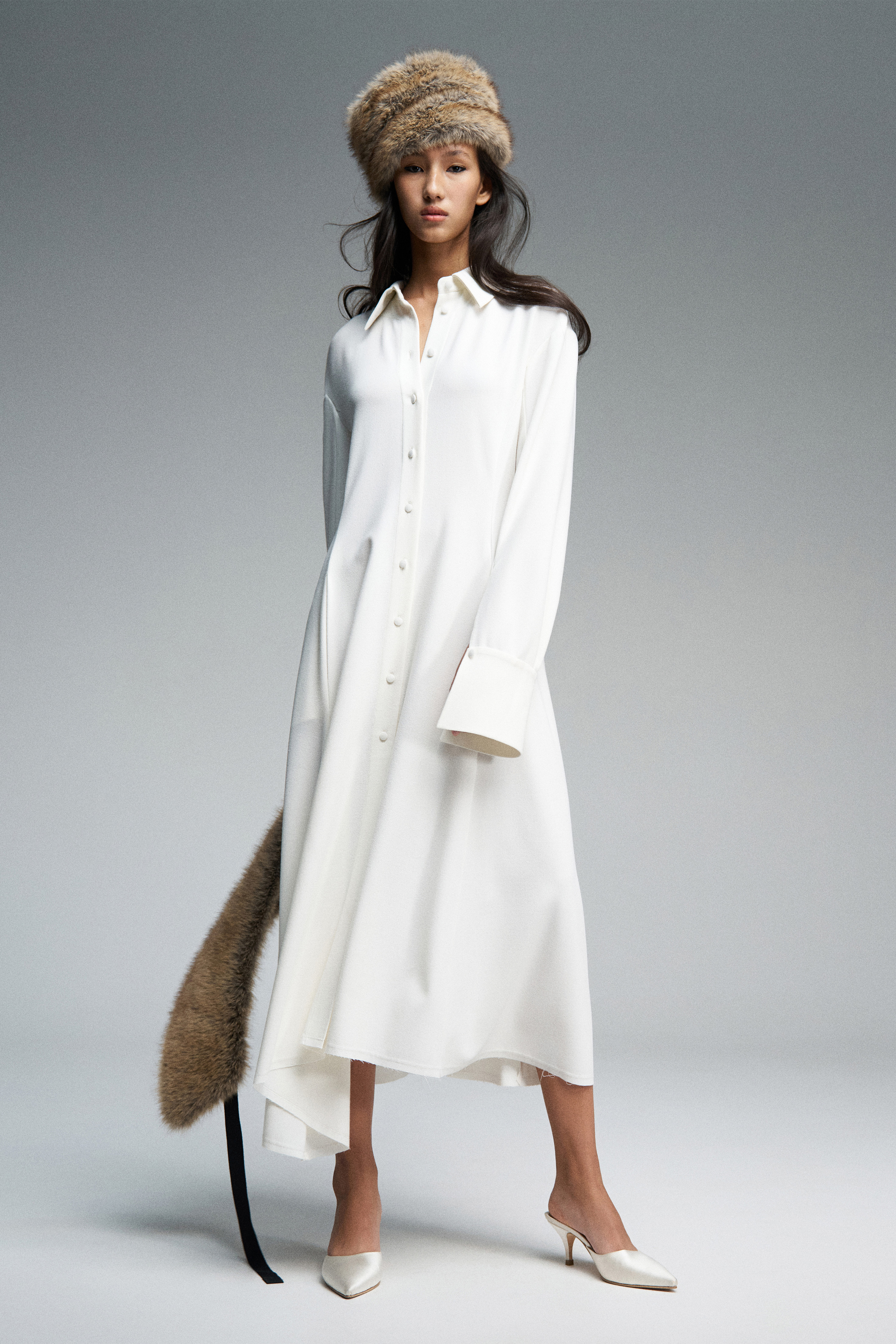 Платье миди с лёгким приталенным силуэтом из шерстяного крепа. Воротник спереди имеет классическую рубашечную форму, а сзади переходит в длинные выразительные ленты, которые можно использовать как шарф. По спинке — V-образный вырез и репсовая тесьма с логотипом бренда. Юбка асимметричная. Модель с длинными рукавами и планкой на пуговицах: в расстегнутом виде манжеты плавно ниспадают вниз.