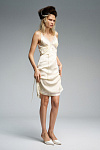 Платье-комбинация из струящейся ткани, украшенное вставками из французских шёлковых кружевных тесьм. Верхняя часть изделия выполнена в виде сложной конструкции двойного лифа: его вторую часть можно носить как декоративную деталь, ниспадающую вниз, или поднять наверх, завязав ленты в бантики. Вся шёлковая отделка вручную накалывалась мастером, чтобы подчеркнуть изгибы тела.