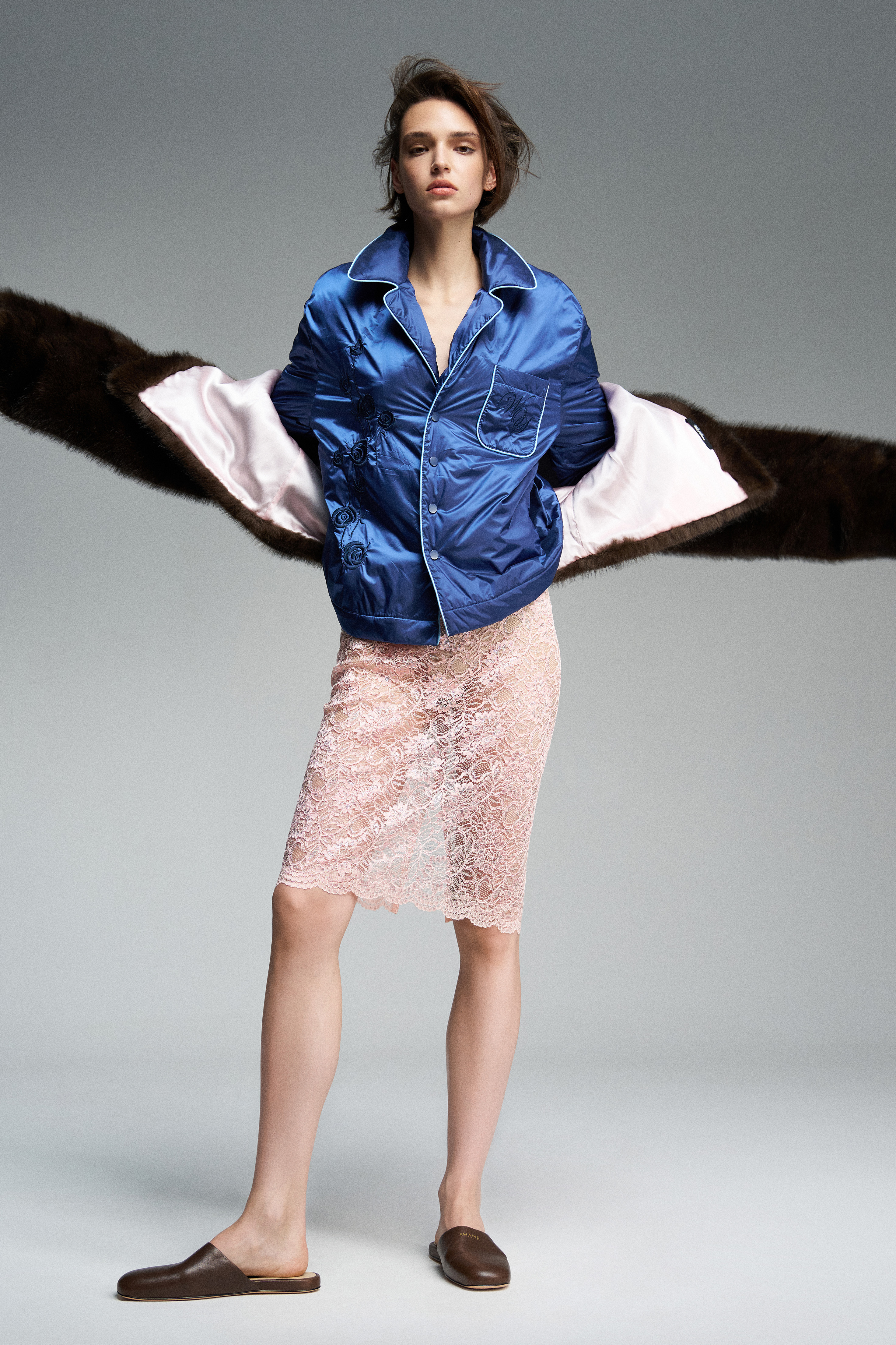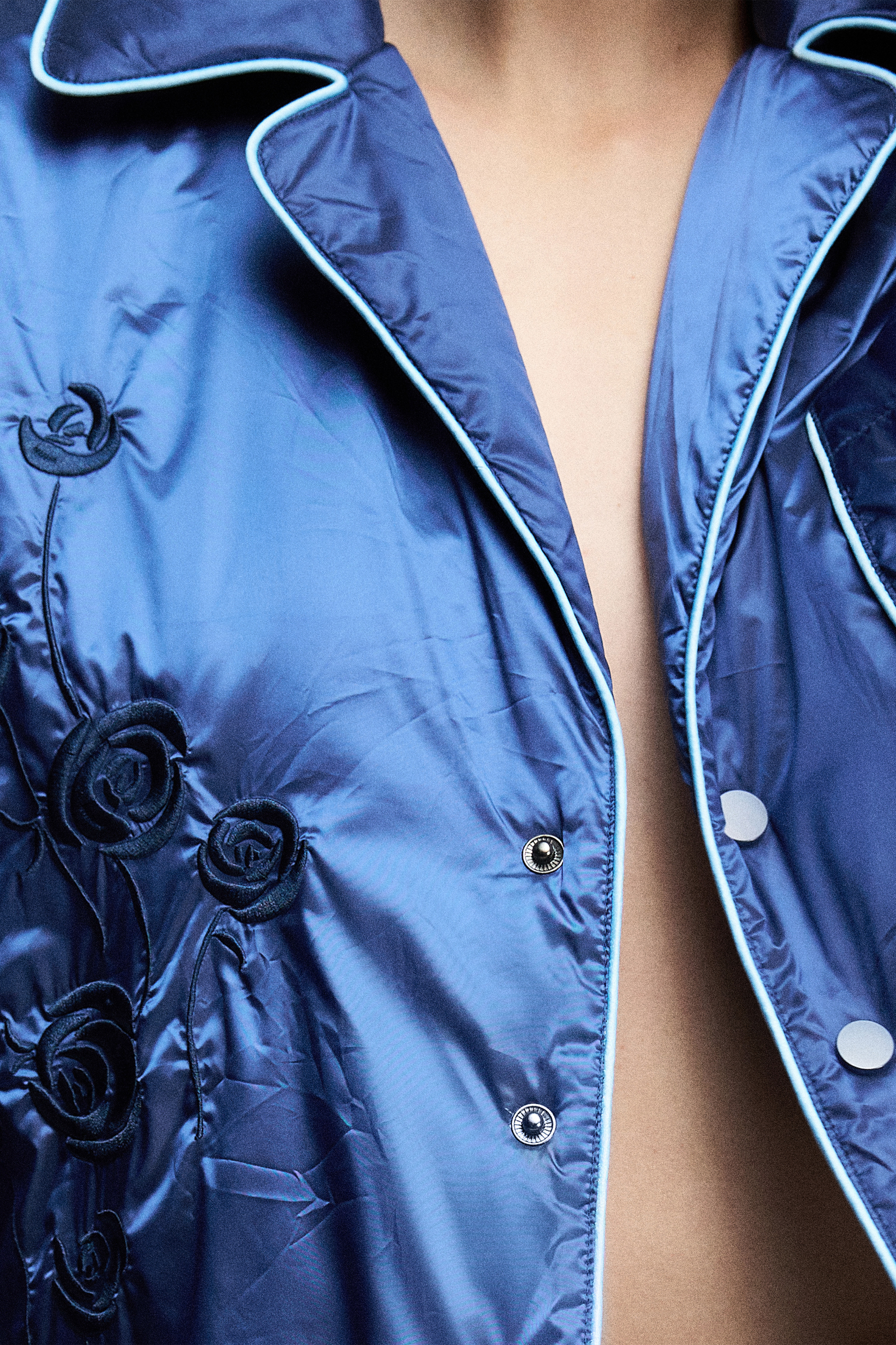 Дутая рубашка в пижамном стиле с лёгким объёмом за счёт шелкового наполнителя, поддерживающего комфортную температуру тела. Прямой крой, классический воротник. Модель украшена вышивкой на грудном кармане и розами на боку.