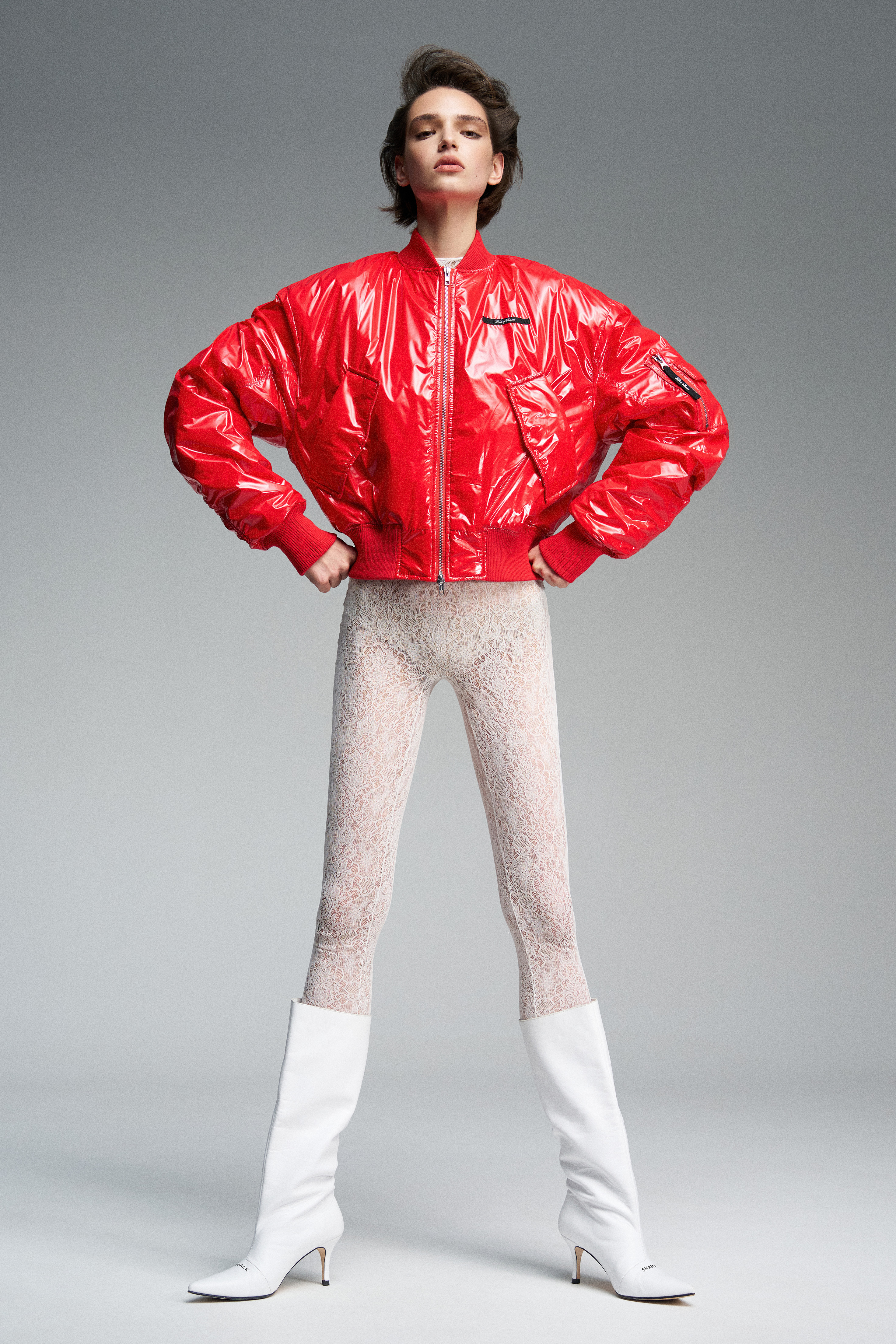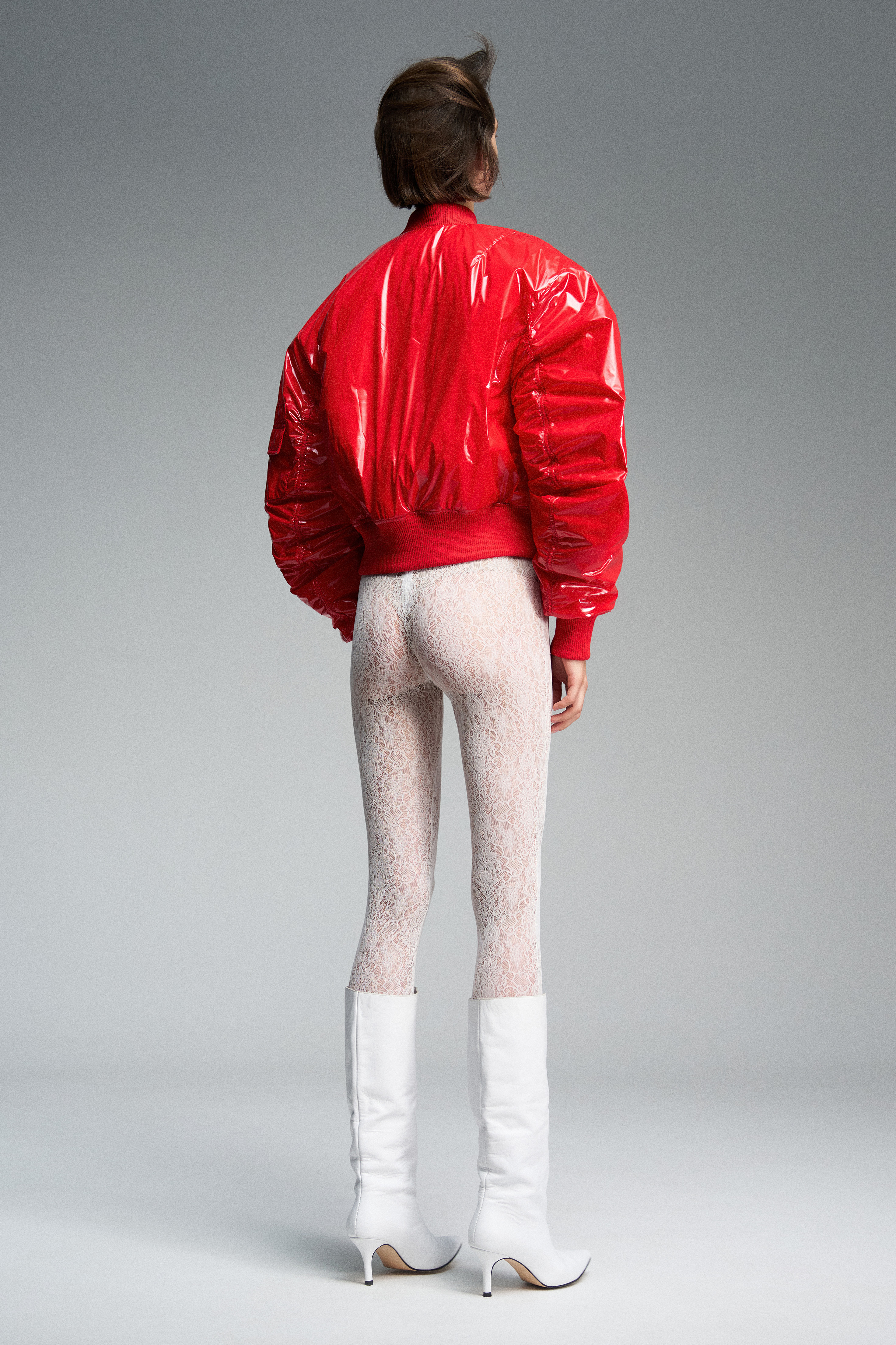 Укороченный бомбер из лакированной ткани. Модель сохраняет все классические детали бомбера, но за счёт материала выглядит как statement piece. С таким верхом любой образ станет акцентным, даже если вы носите пижамные штаны. Бомбер украшен вышивкой бренда и репсовыми лентами с логотипом. Рекомендуемая температура носки: до -20 °C.