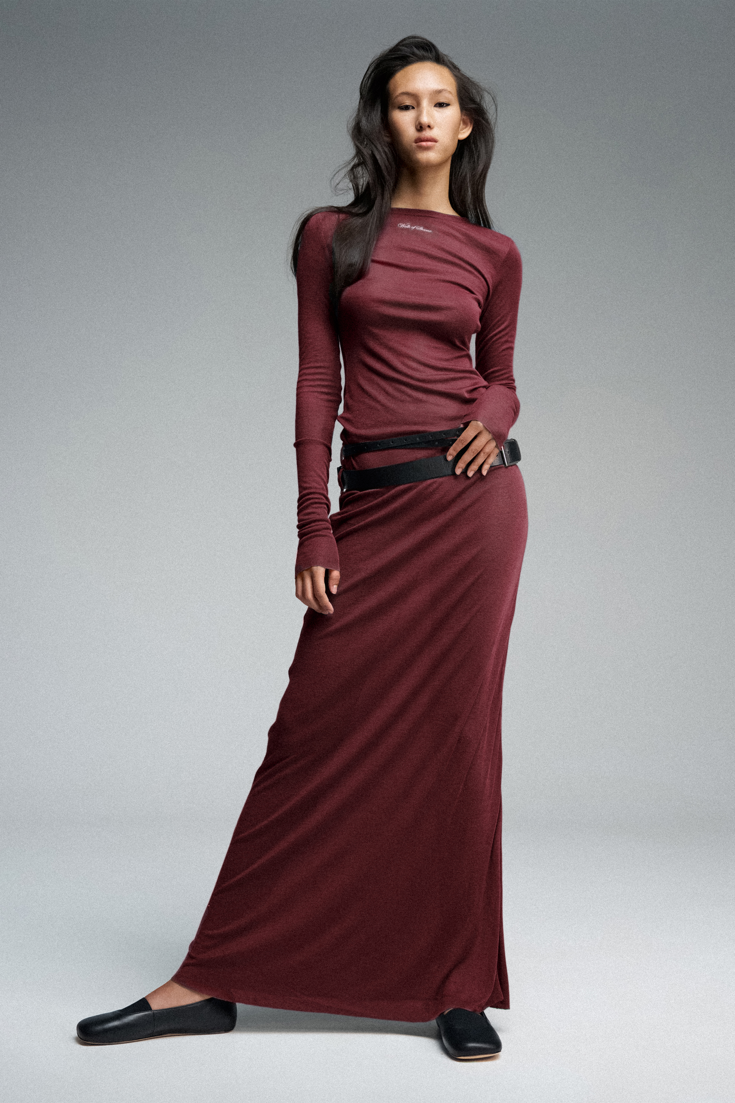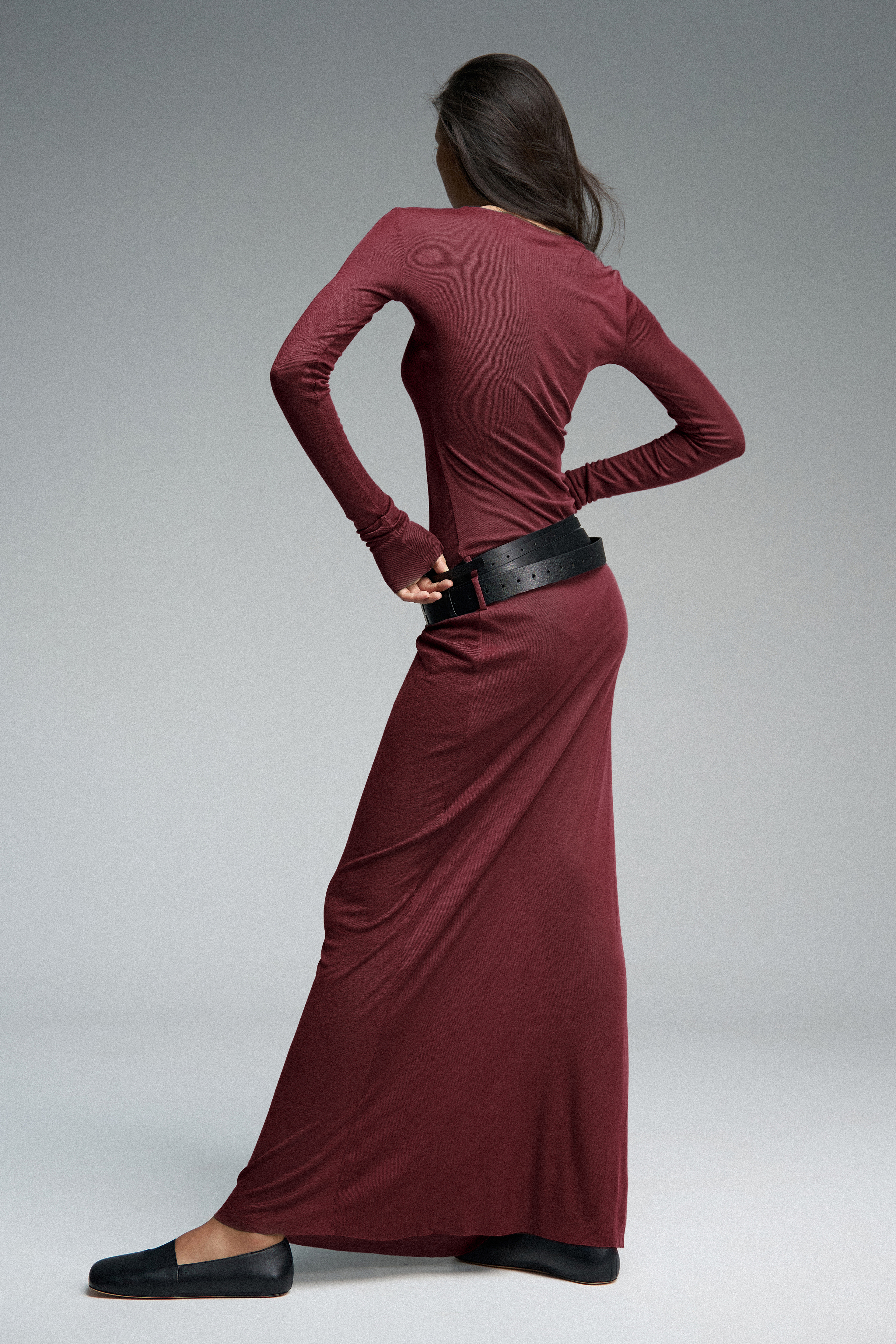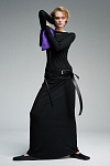 Платье длины макси из тонкого трикотажа, дополненное двойным рядом шлевок.