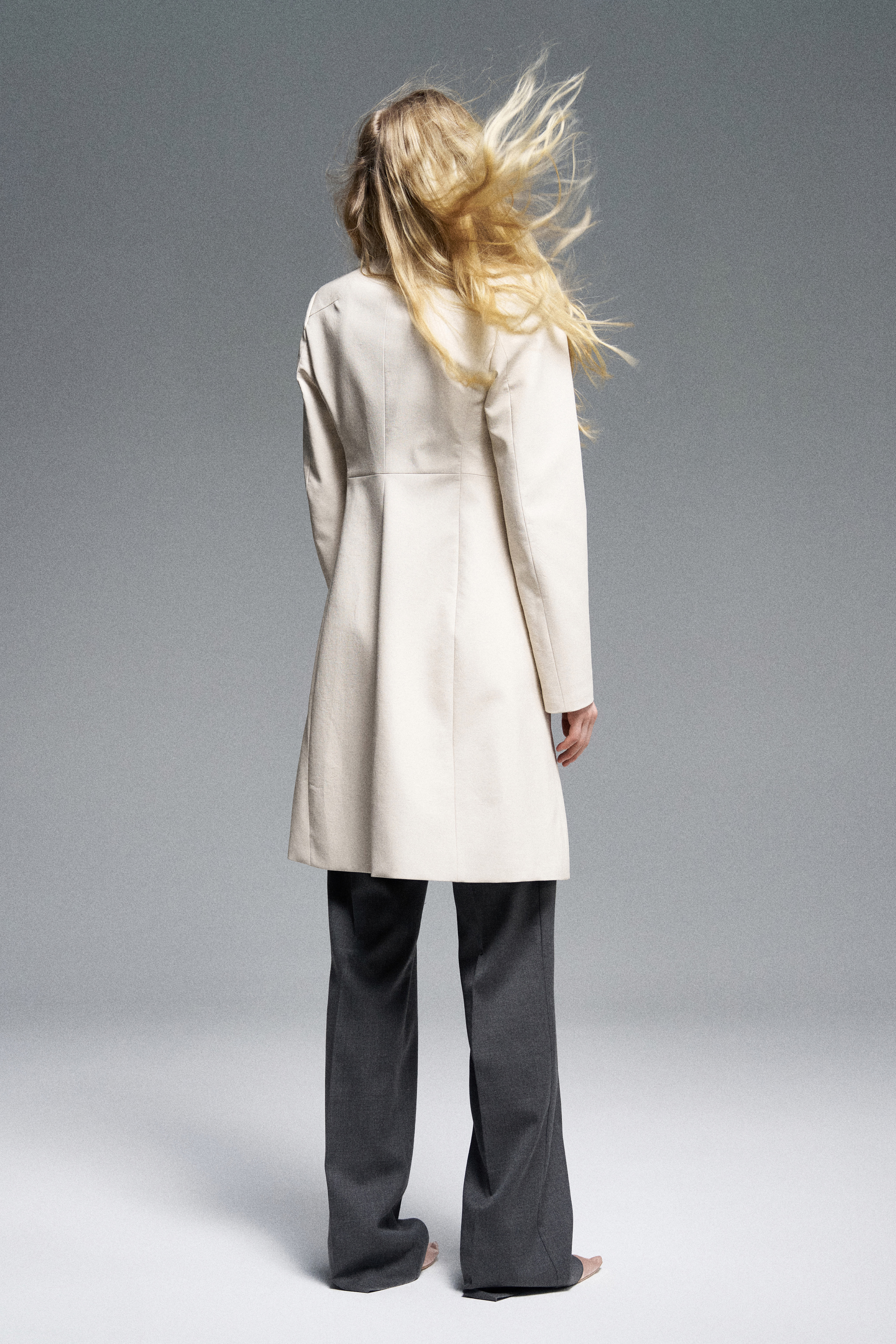 Удлиненный приталенный жакет из экокожи. Модель с шалевым воротником и обтянутыми пуговицами в тон. Горизонтальный шов на линии пояса проходит через петлю, подчеркивая талию.