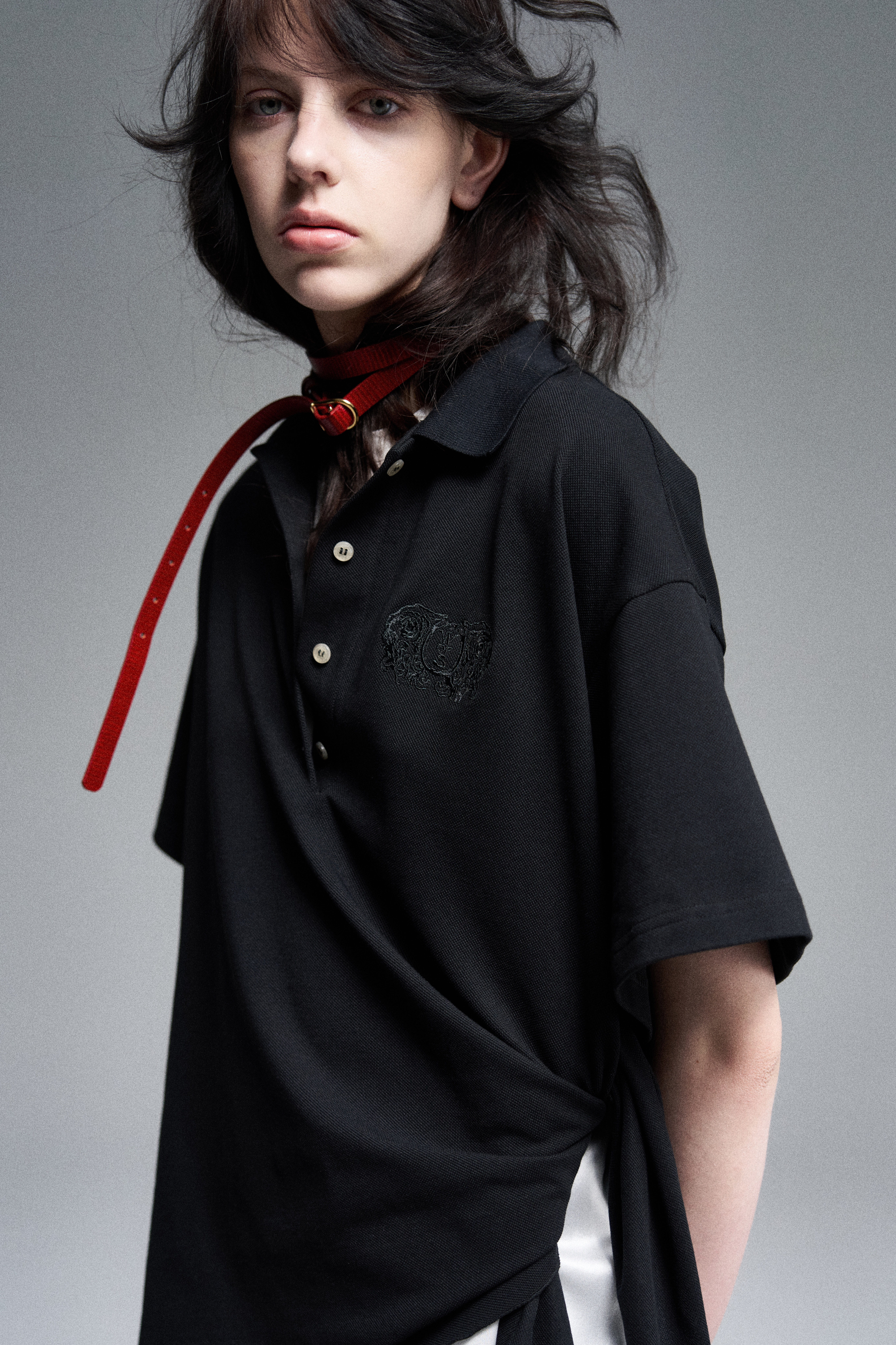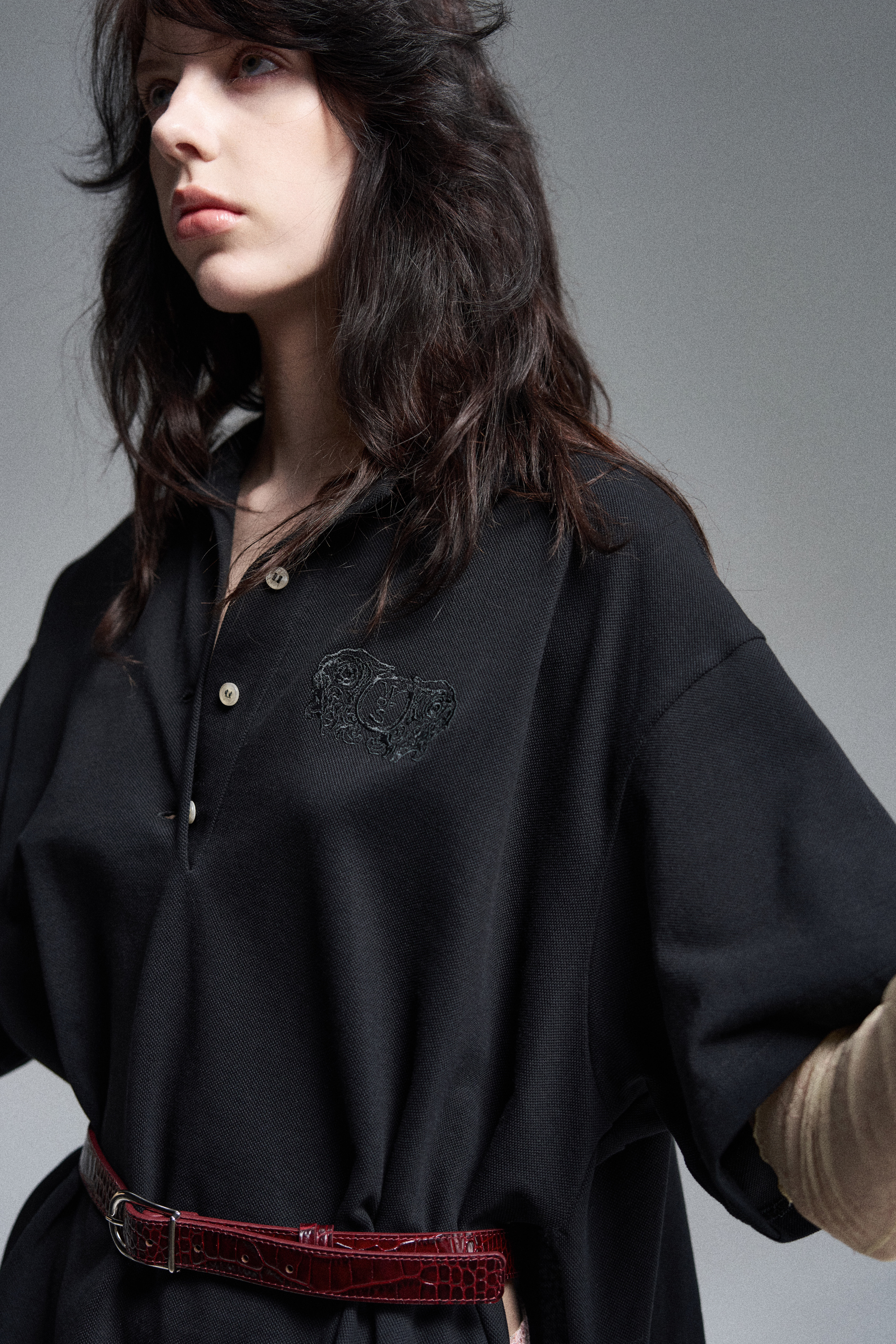 Объёмное поло свободного силуэта с завязками, дополненное вышивкой герба Walk of Shame. Модель имеет шлевки для ремня. Отложной воротник. Короткие рукава. Застежка пуговицами на планке.