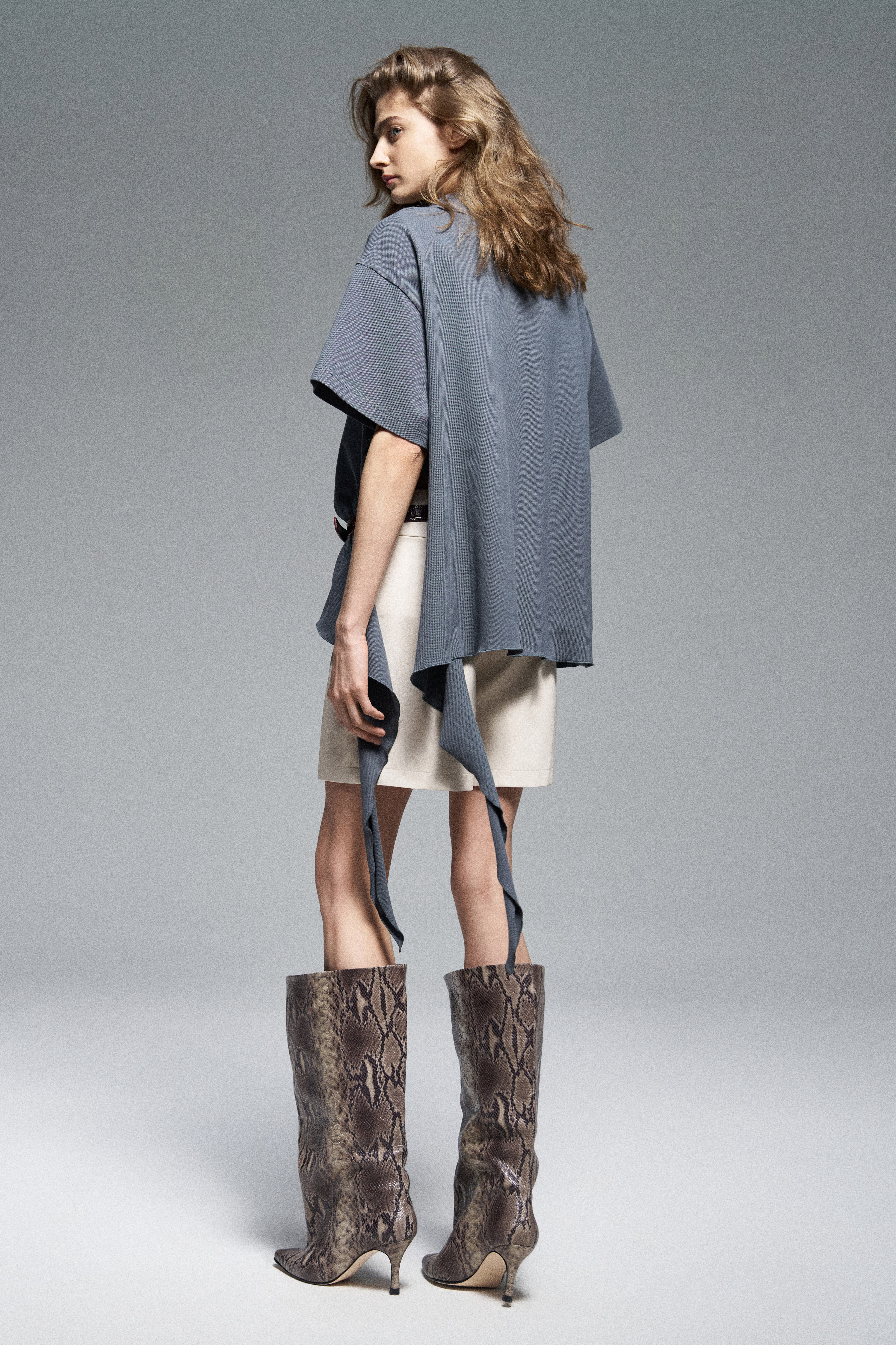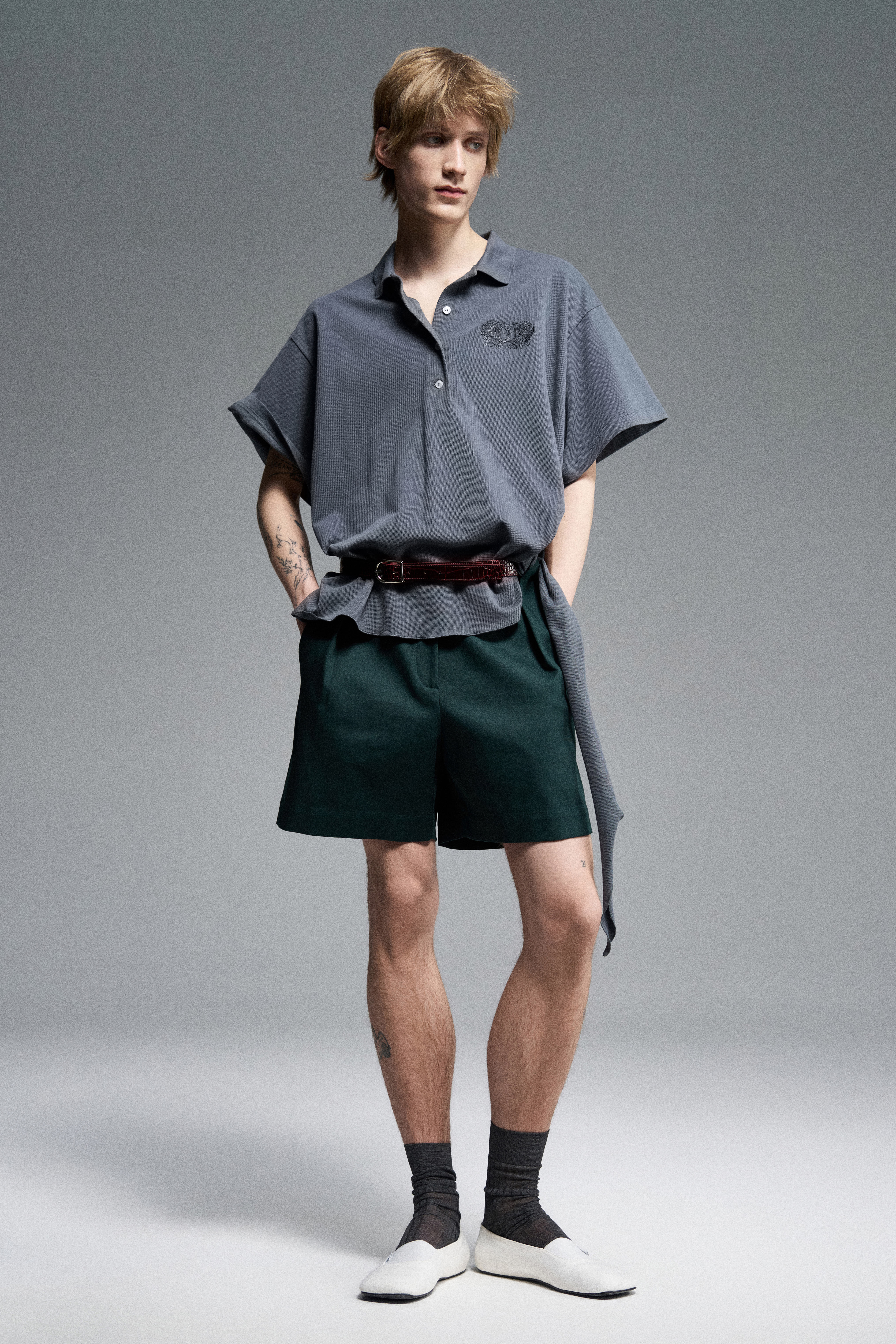 Объёмное поло свободного силуэта с завязками, дополненное вышивкой герба Walk of Shame. Модель имеет шлевки для ремня. Отложной воротник. Короткие рукава. Застежка пуговицами на планке.