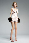 Платье-комбинация из струящейся ткани, украшенное вставками из французских шёлковых кружевных тесьм. Верхняя часть изделия выполнена в виде сложной конструкции двойного лифа: его вторую часть можно носить как декоративную деталь, ниспадающую вниз, или поднять наверх, завязав ленты в бантики. Вся шёлковая отделка вручную накалывалась мастером, чтобы подчеркнуть изгибы тела.