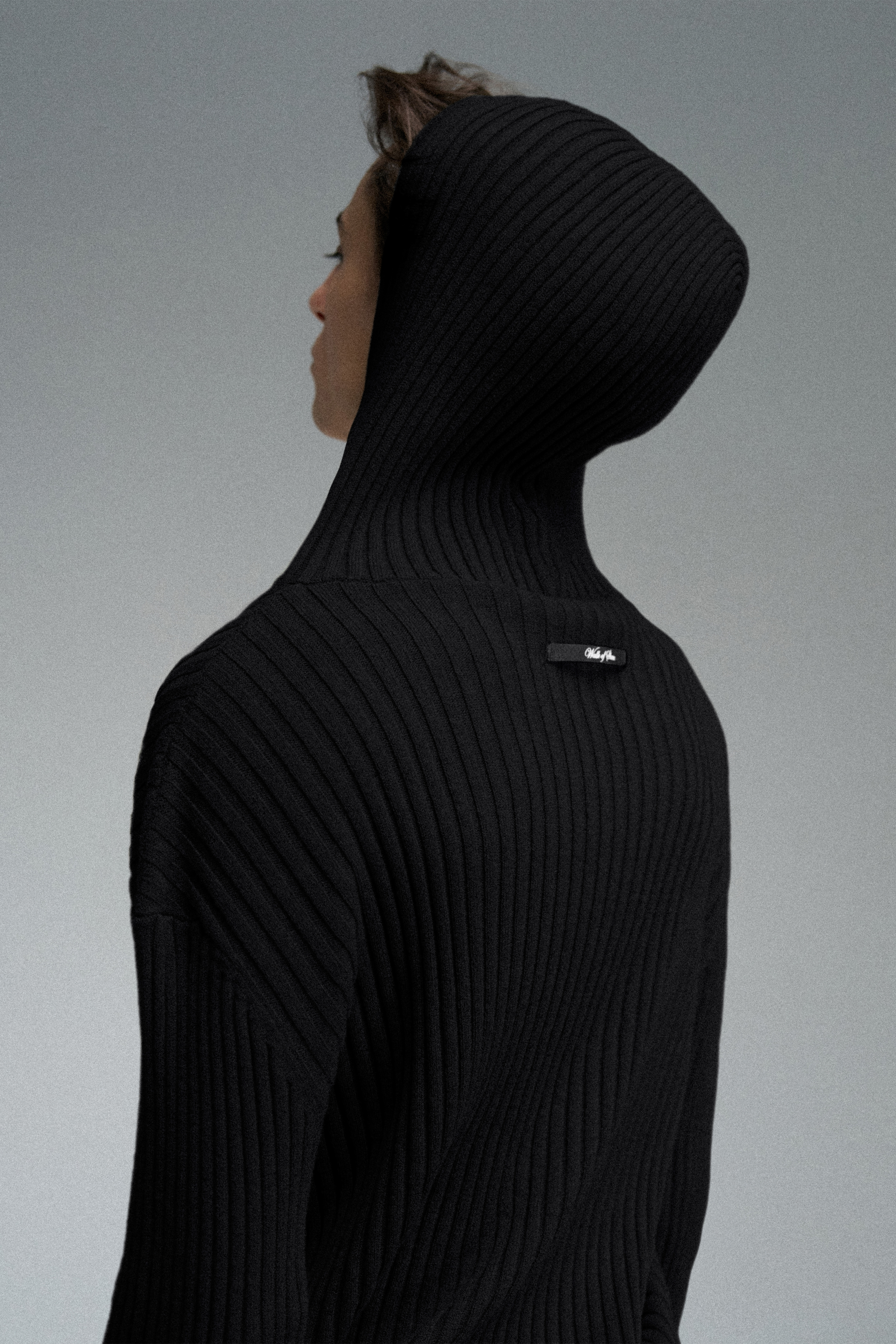 Трикотажный кардиган черного цвета прилегающего силуэта с капюшоном. Двусторонняя молния позволяет регулировать застёжку сверху и снизу, обеспечивая комфорт и вариативность посадки. Молнии Riri брендированные, декоративную деталь завершает репсовая лента с логотипом бренда.