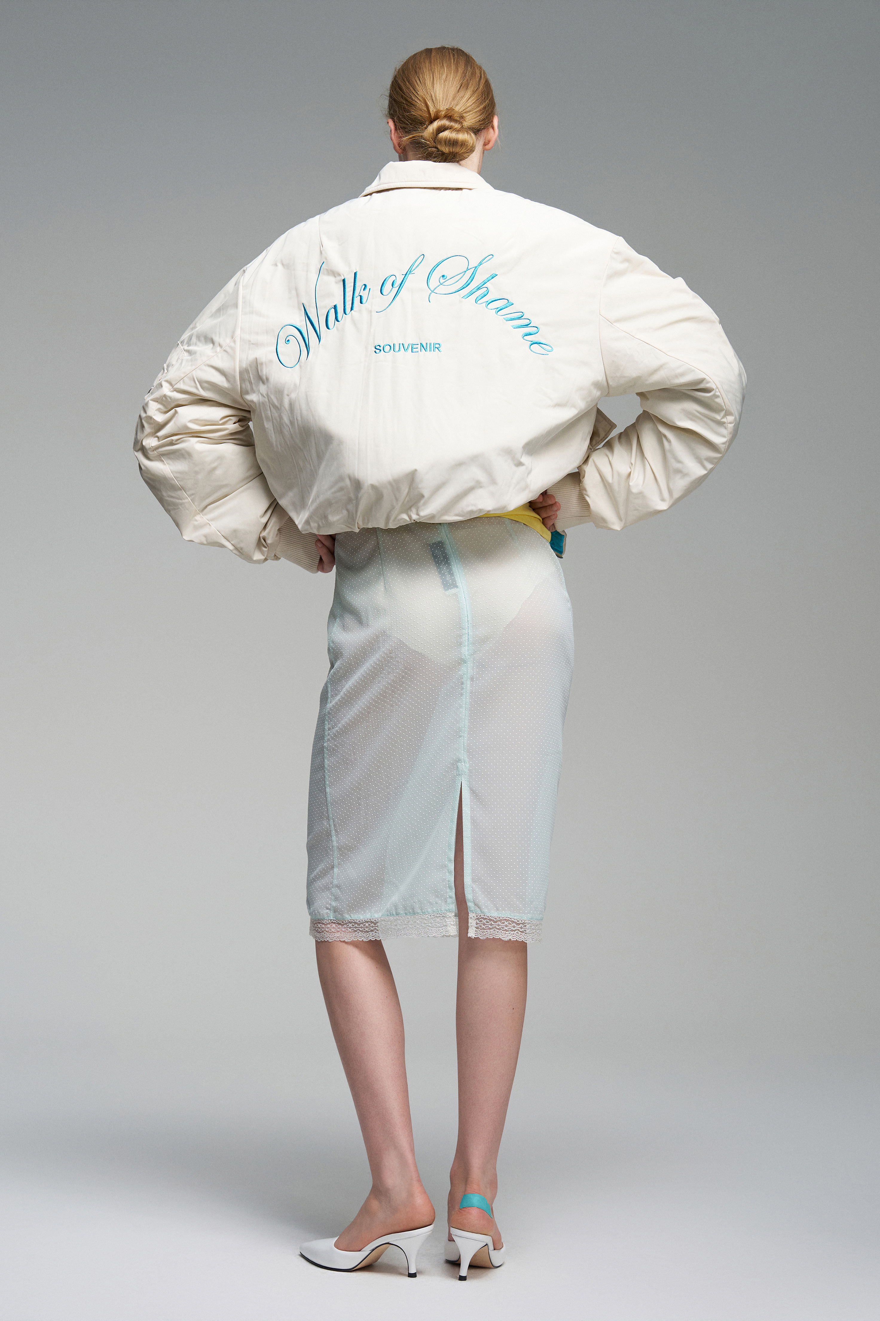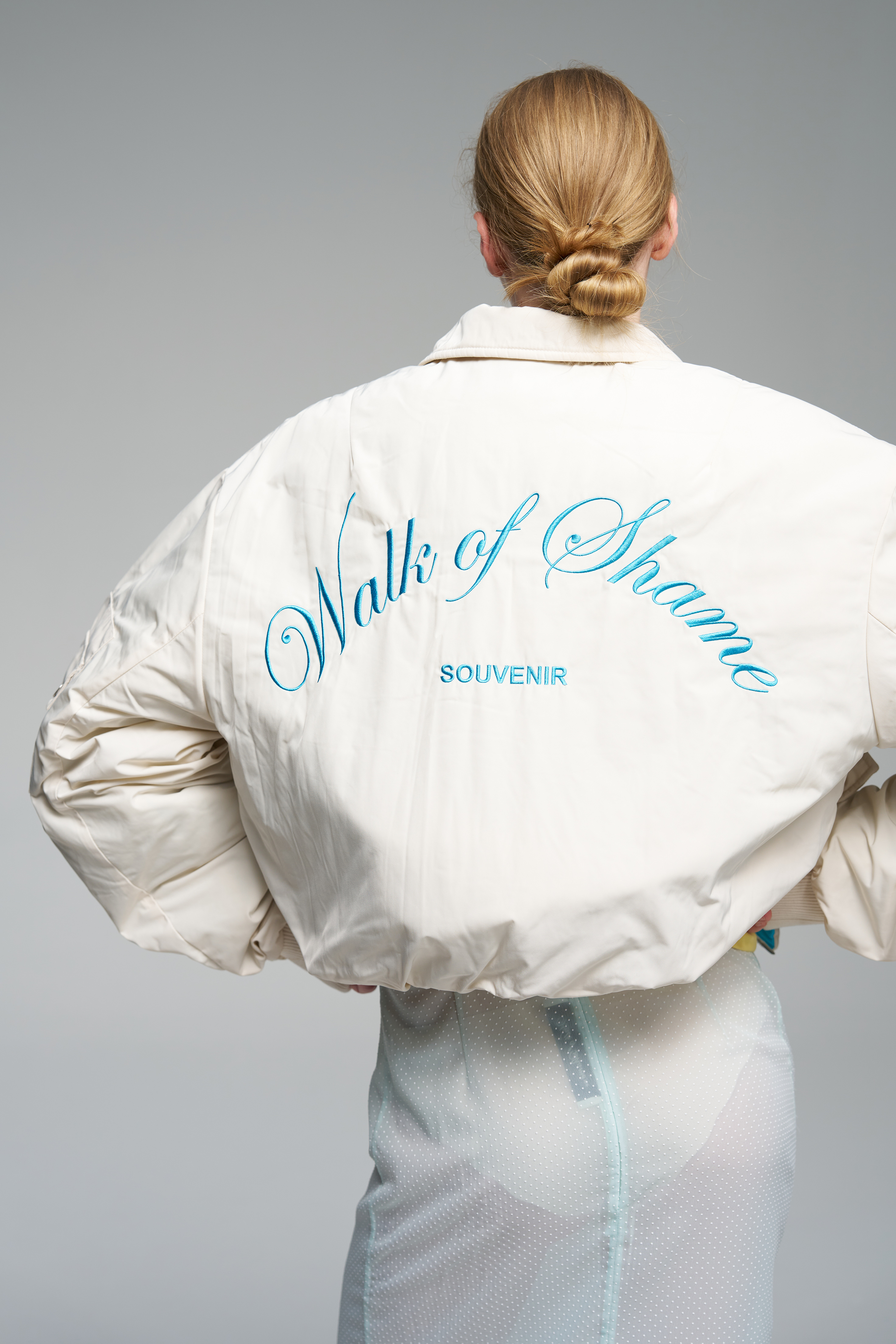 Два кармана на передней части застегиваются на кнопки, карман на рукаве — на молнию, также, имеется потайной карман. Застежки на молниях дополнены лентами с логотипом бренда — Walk of Shame. Изделие выполнено из плотной ткани и имеет подкладку.