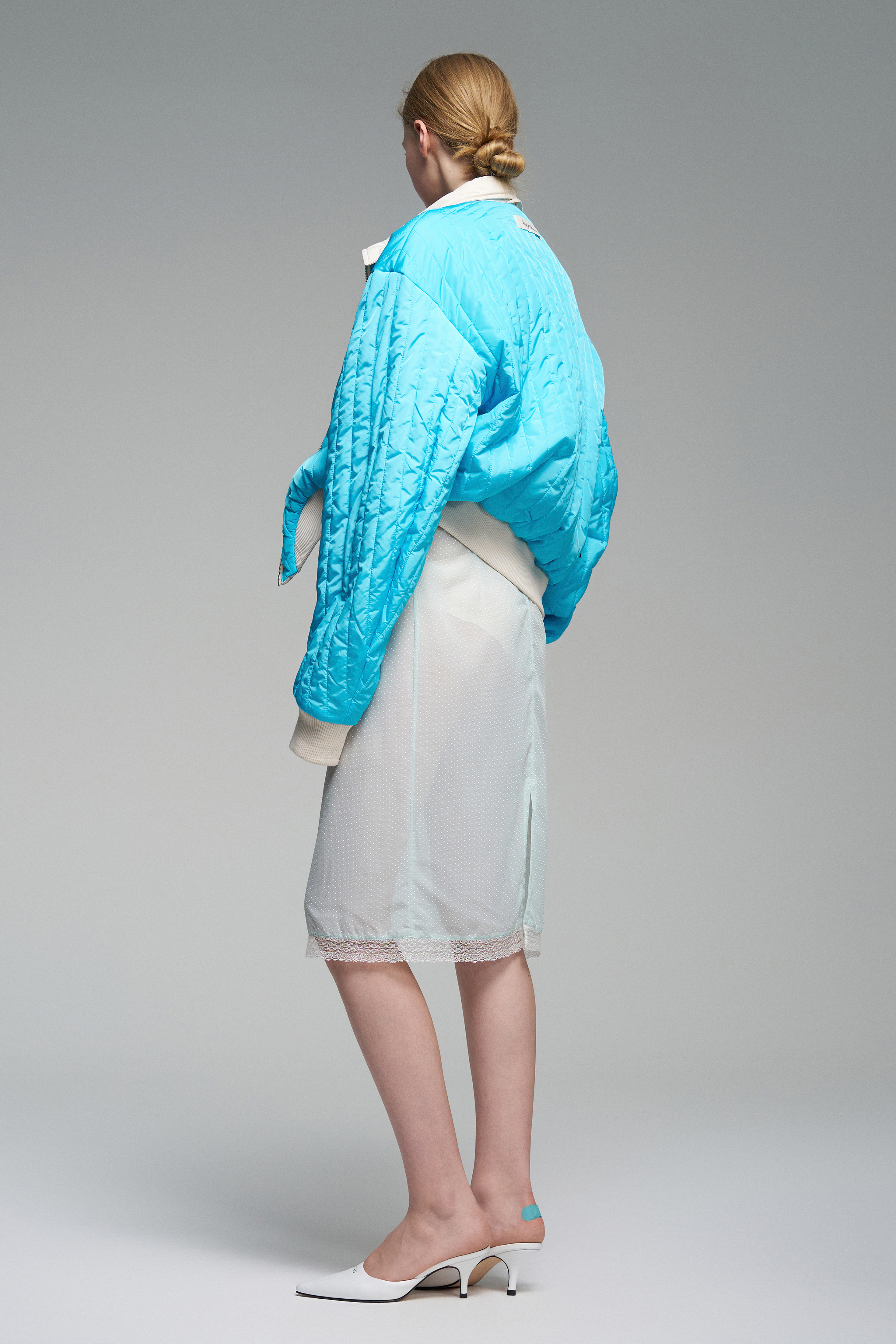 Объемный бомбер молочного цвета с вышивкой бренда на груди и на спине изделия. Манжеты и вставки на бедрах выполнены из трикотажа, а швы на рукавах присборены.