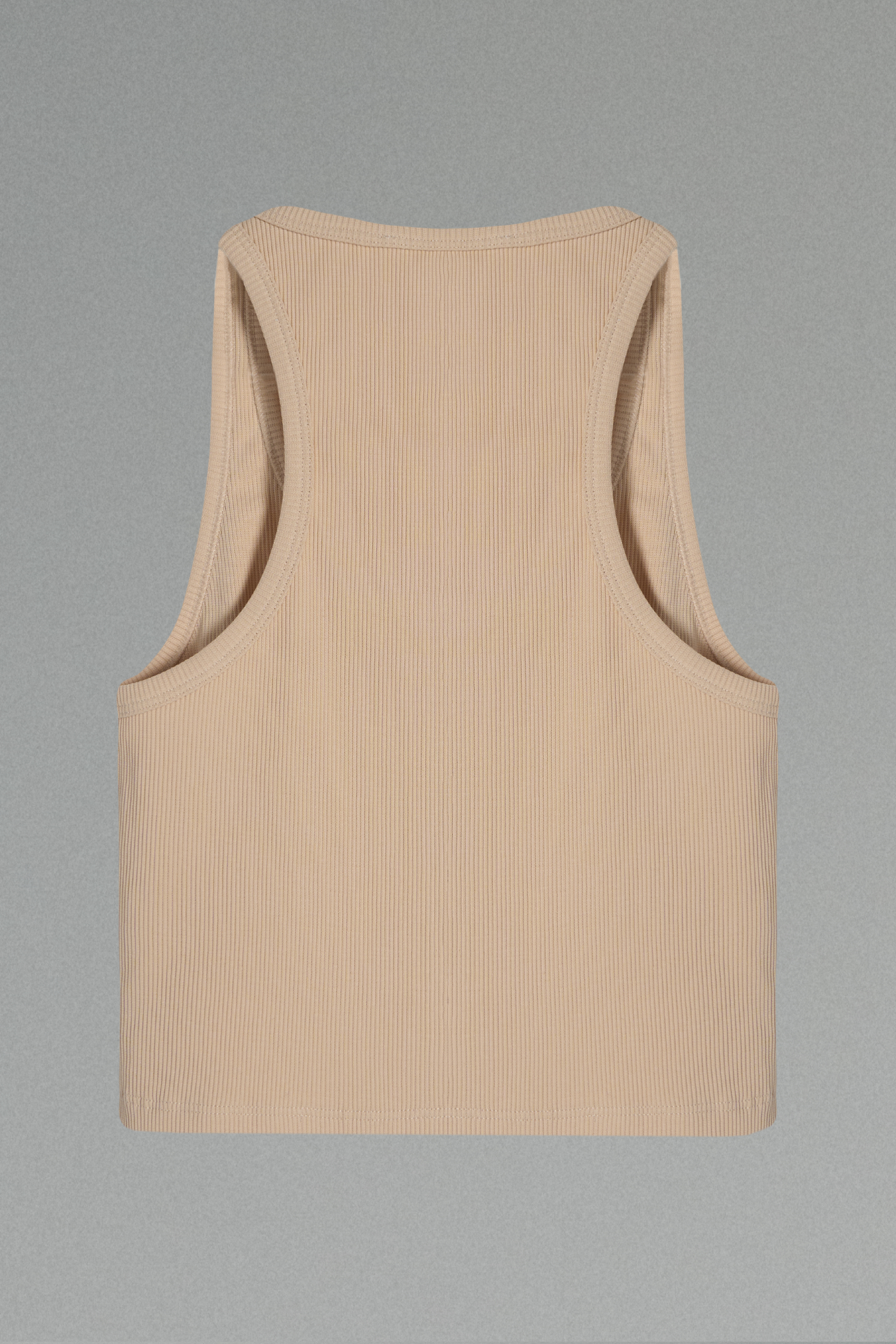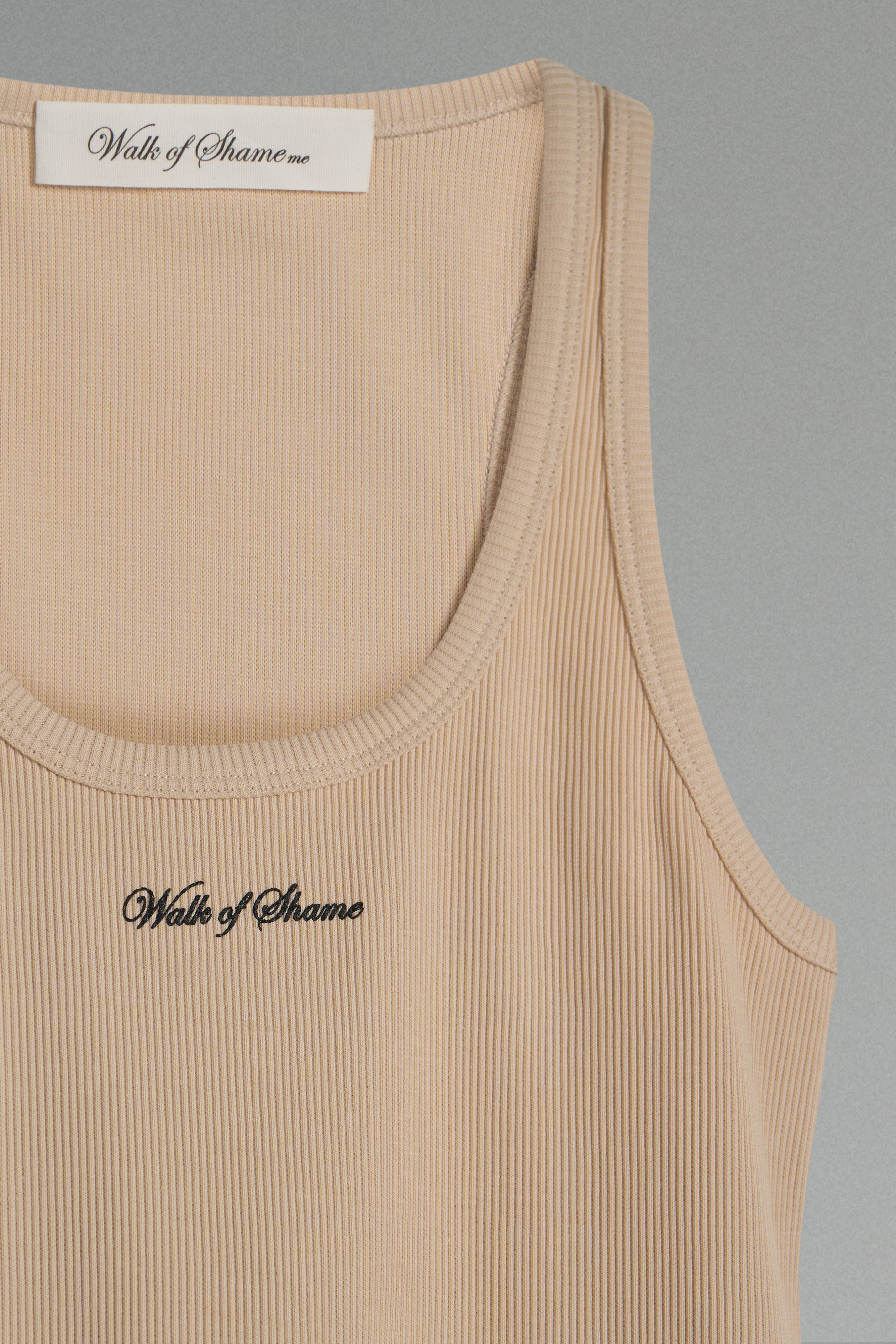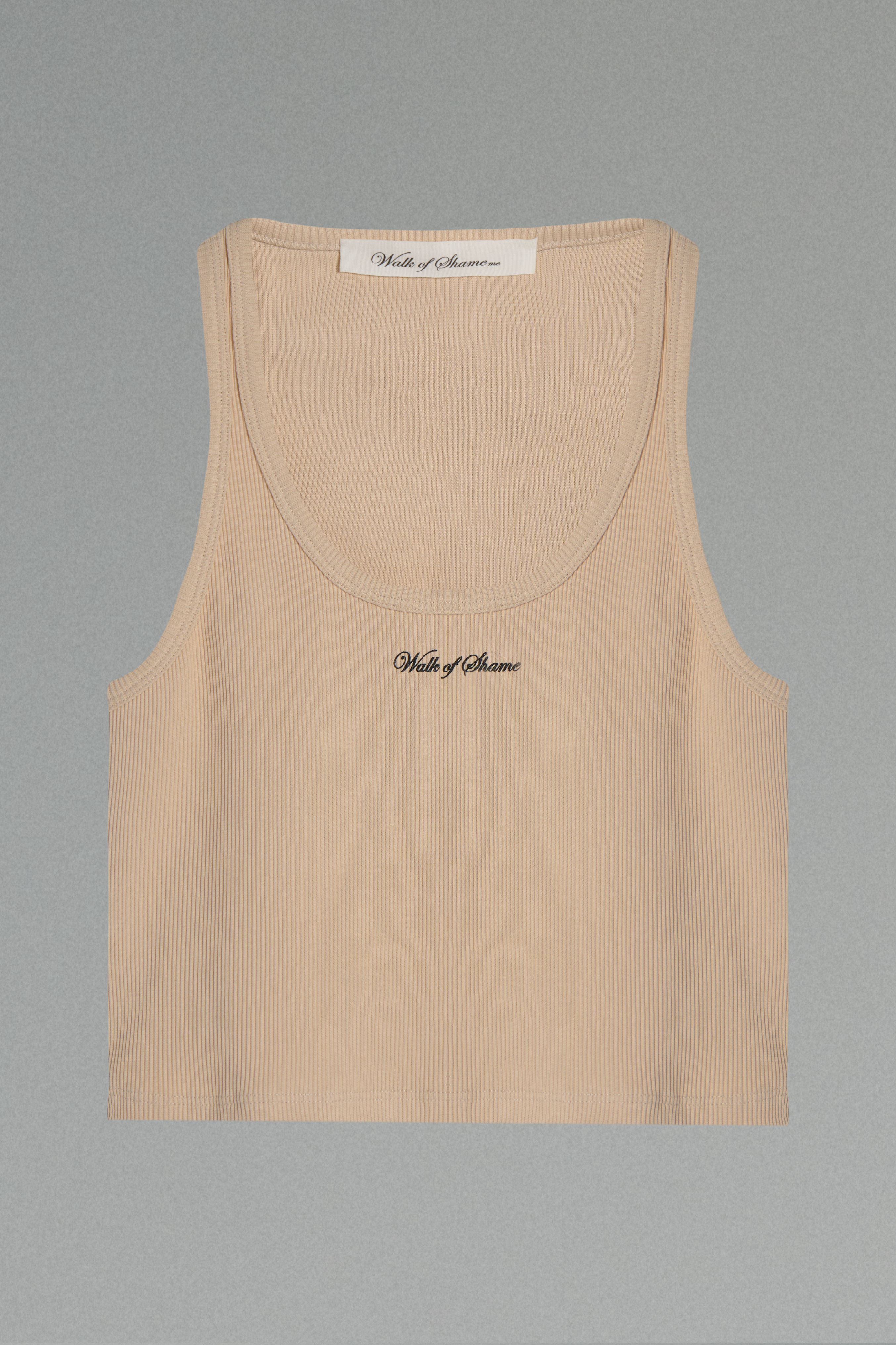 Бежевый кроп-топ c логотипом бренда Walk of Shame. Модель приталенного кроя.