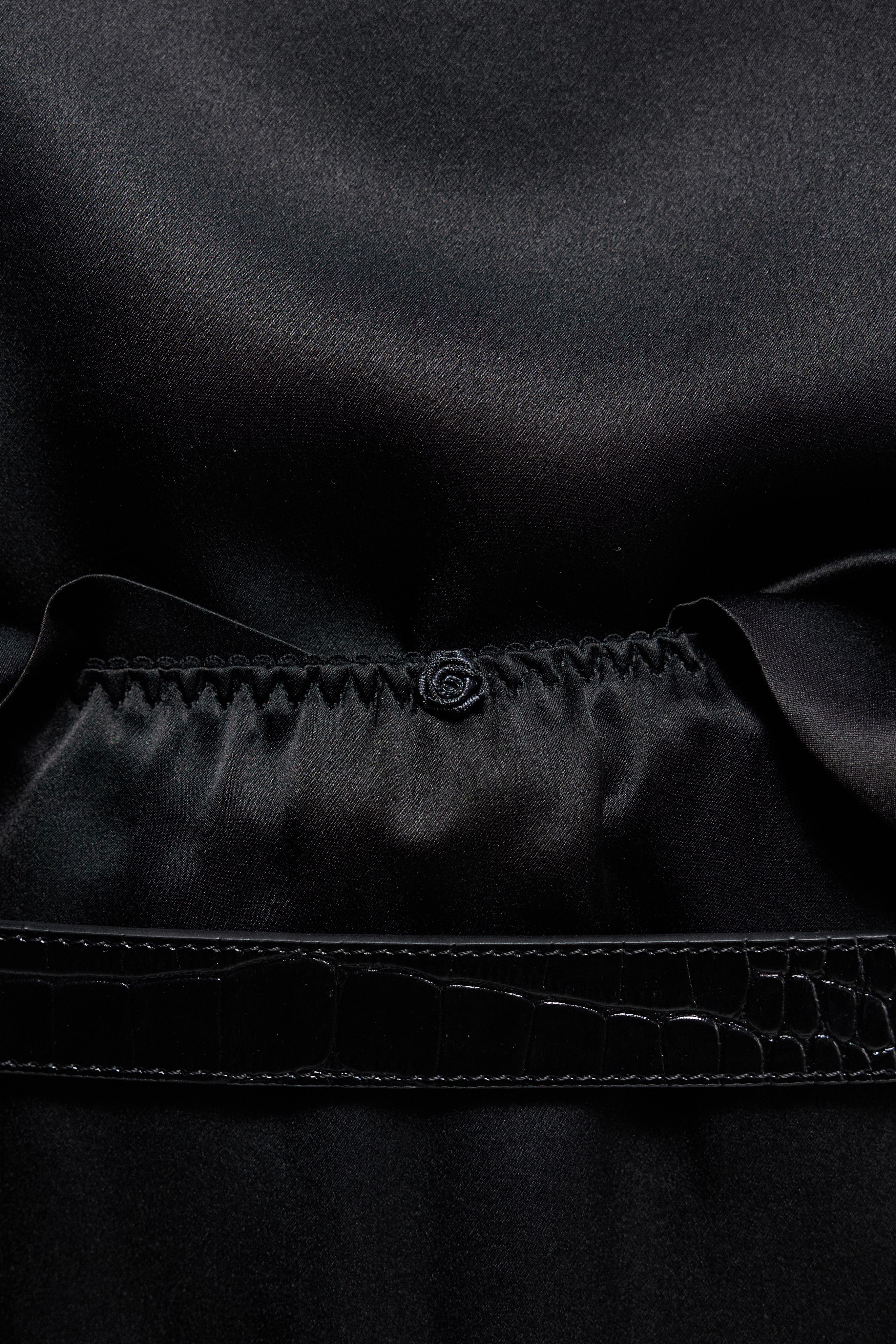 Юбка миди из натурального английского шёлка черного цвета. Изделие на бельевой резинке, дополненное спереди декоративной розой. Сзади — шлица и скрытая застёжка на молнию. Можно носить как самостоятельно, так и в качестве второго слоя под платье или юбку.