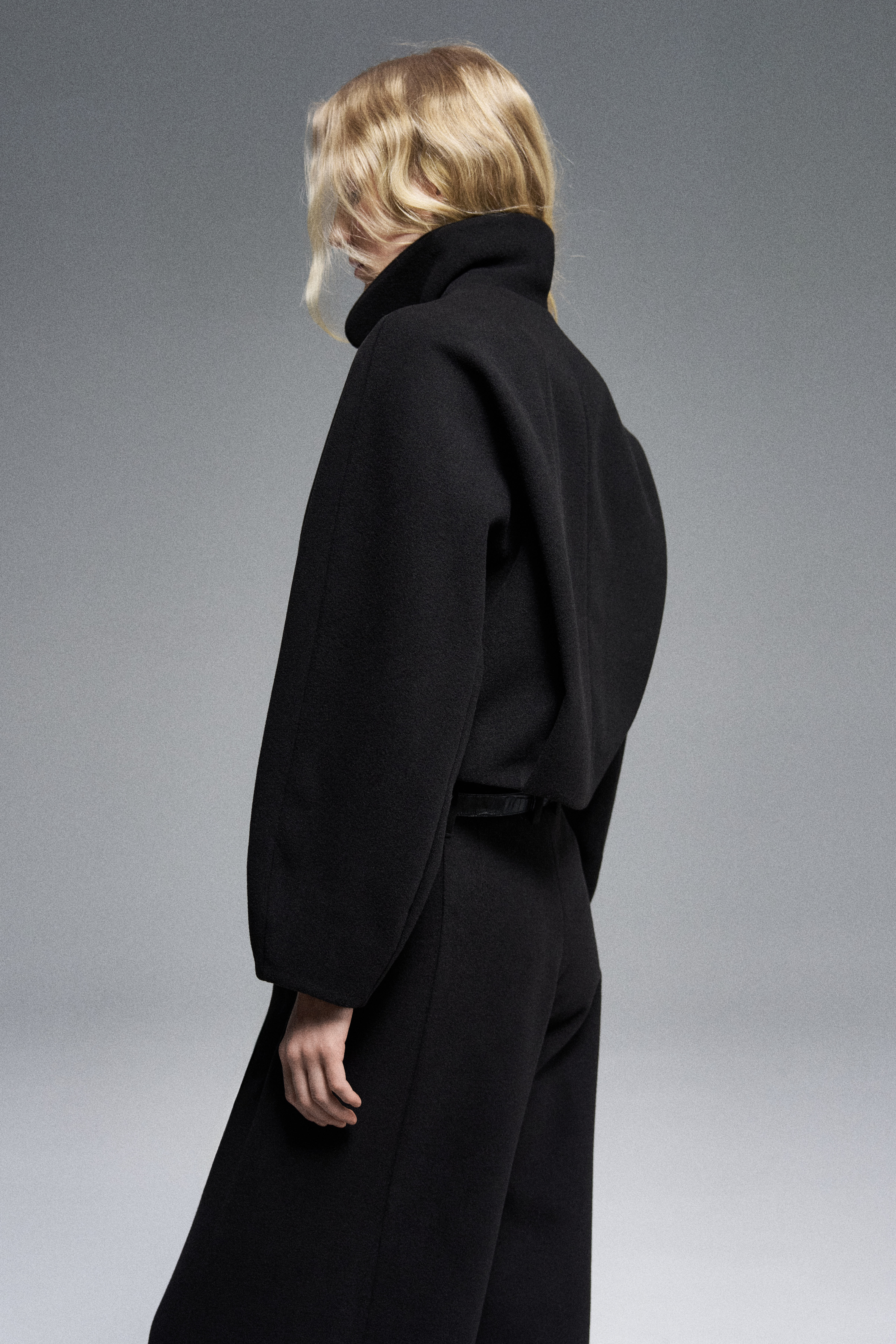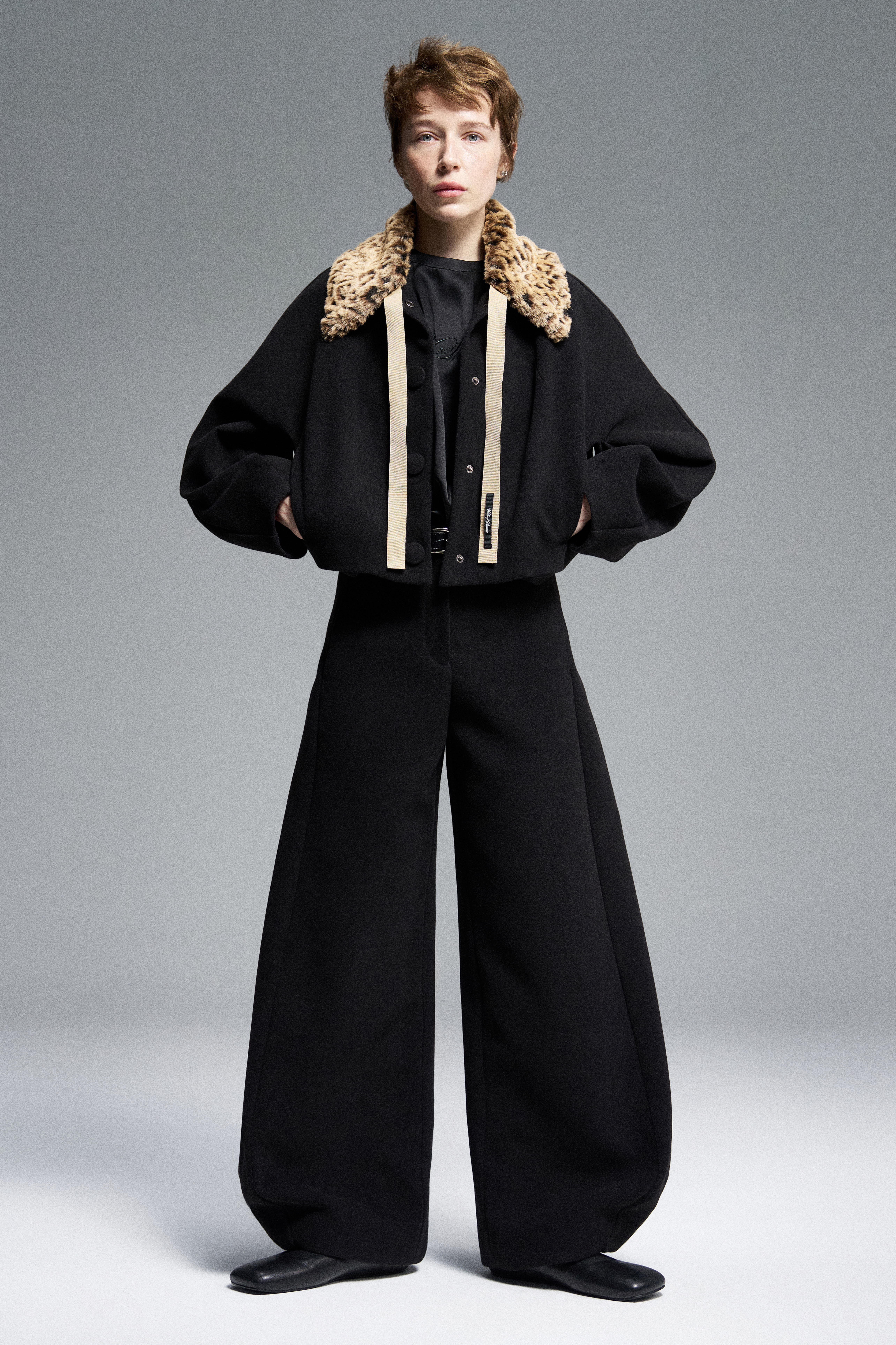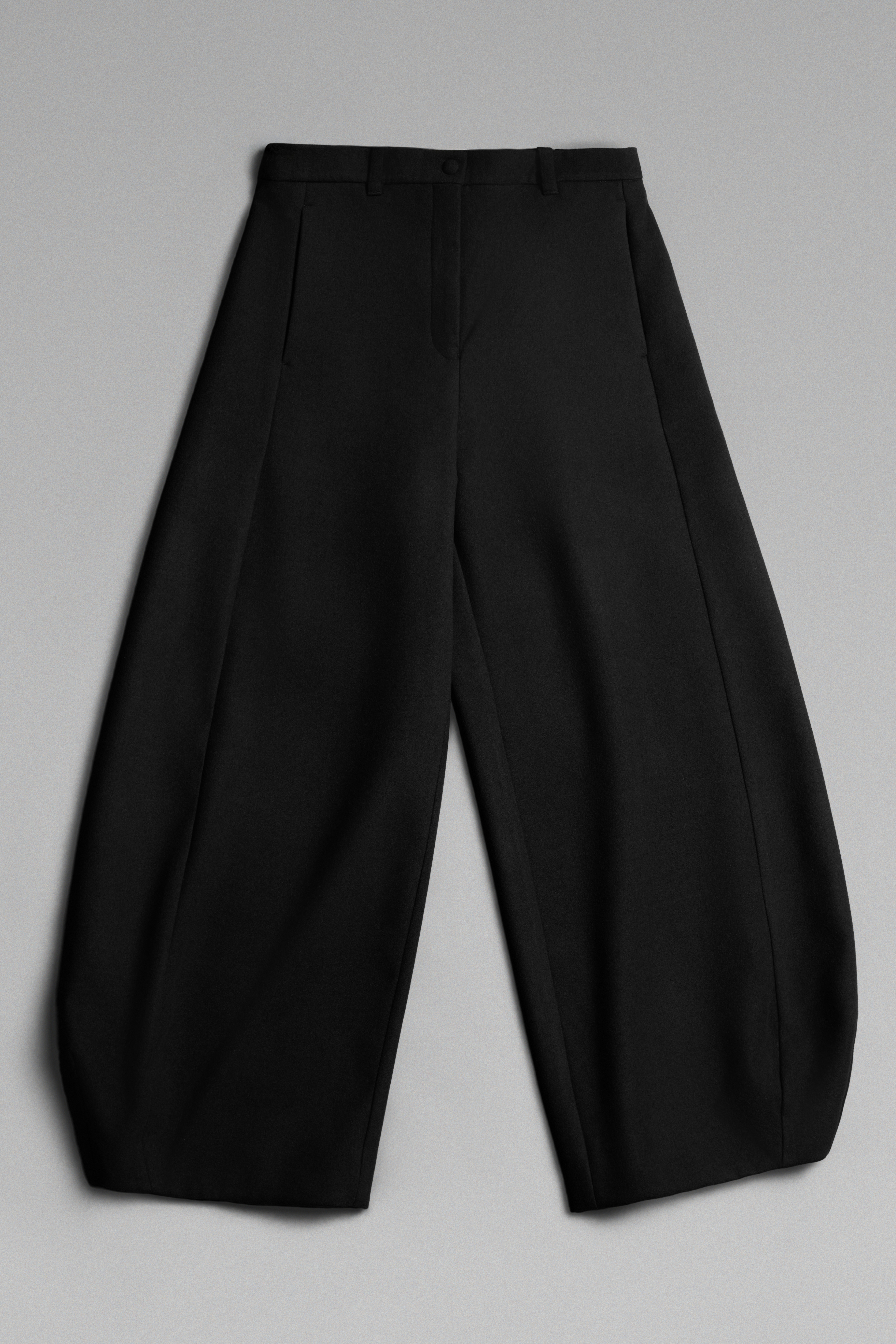 Объемные брюки из мягкого флиса силуэта «bubble», резко сужающиеся к низу. Пояс брюк обработан корсажной лентой, застежка на молнию и обтянутую кнопку. Акцентированы диагональными швами спереди. Шлейки для ремня.