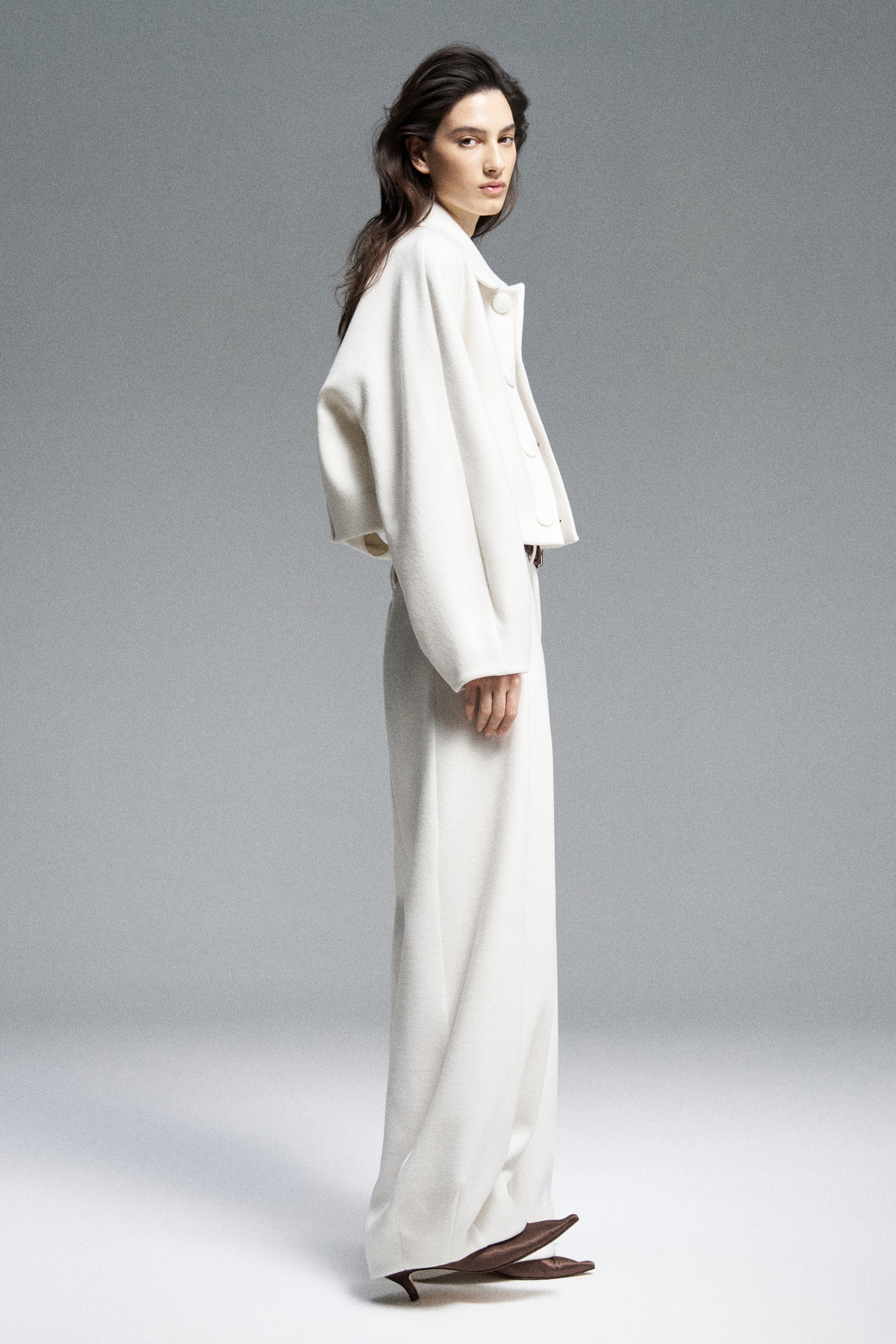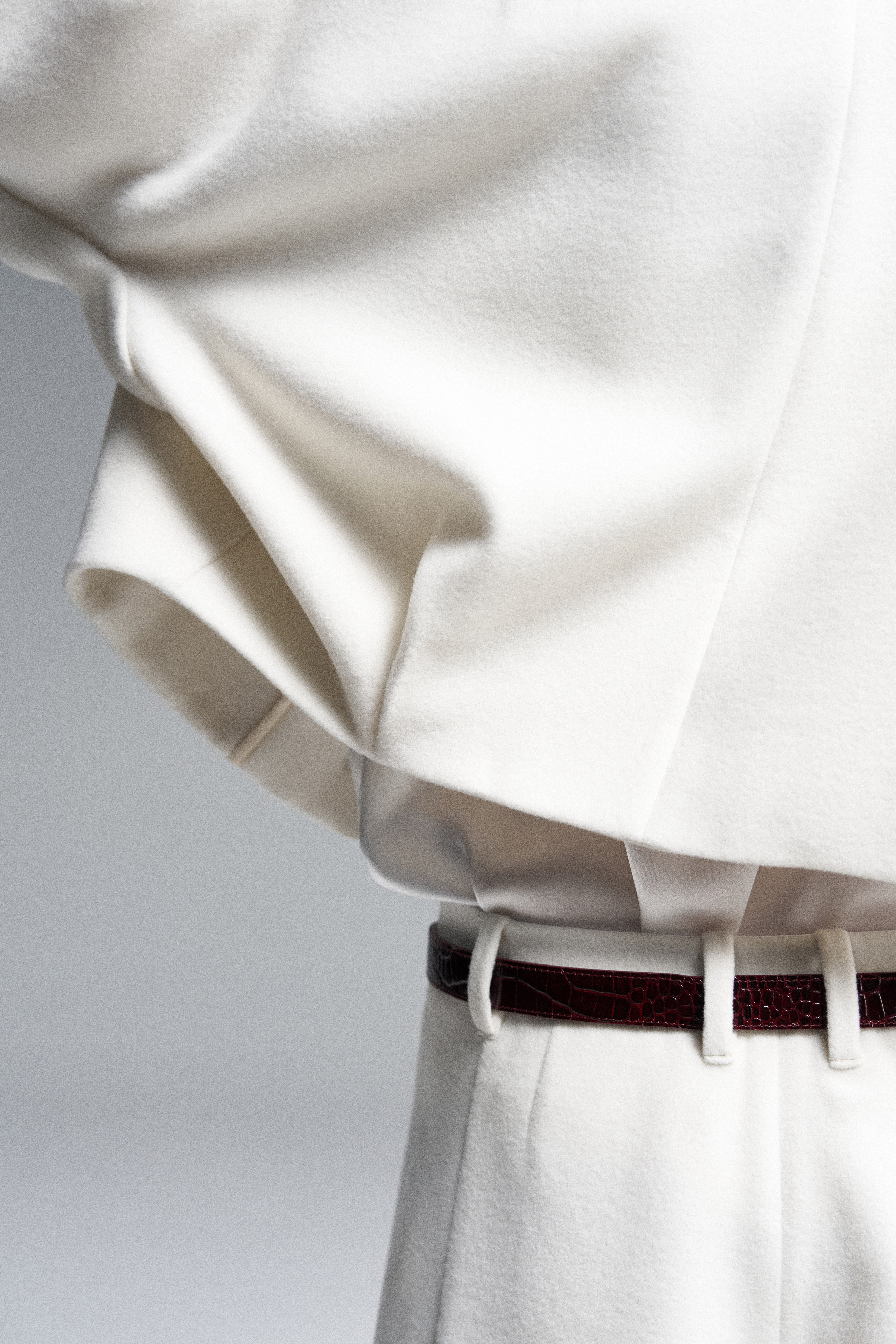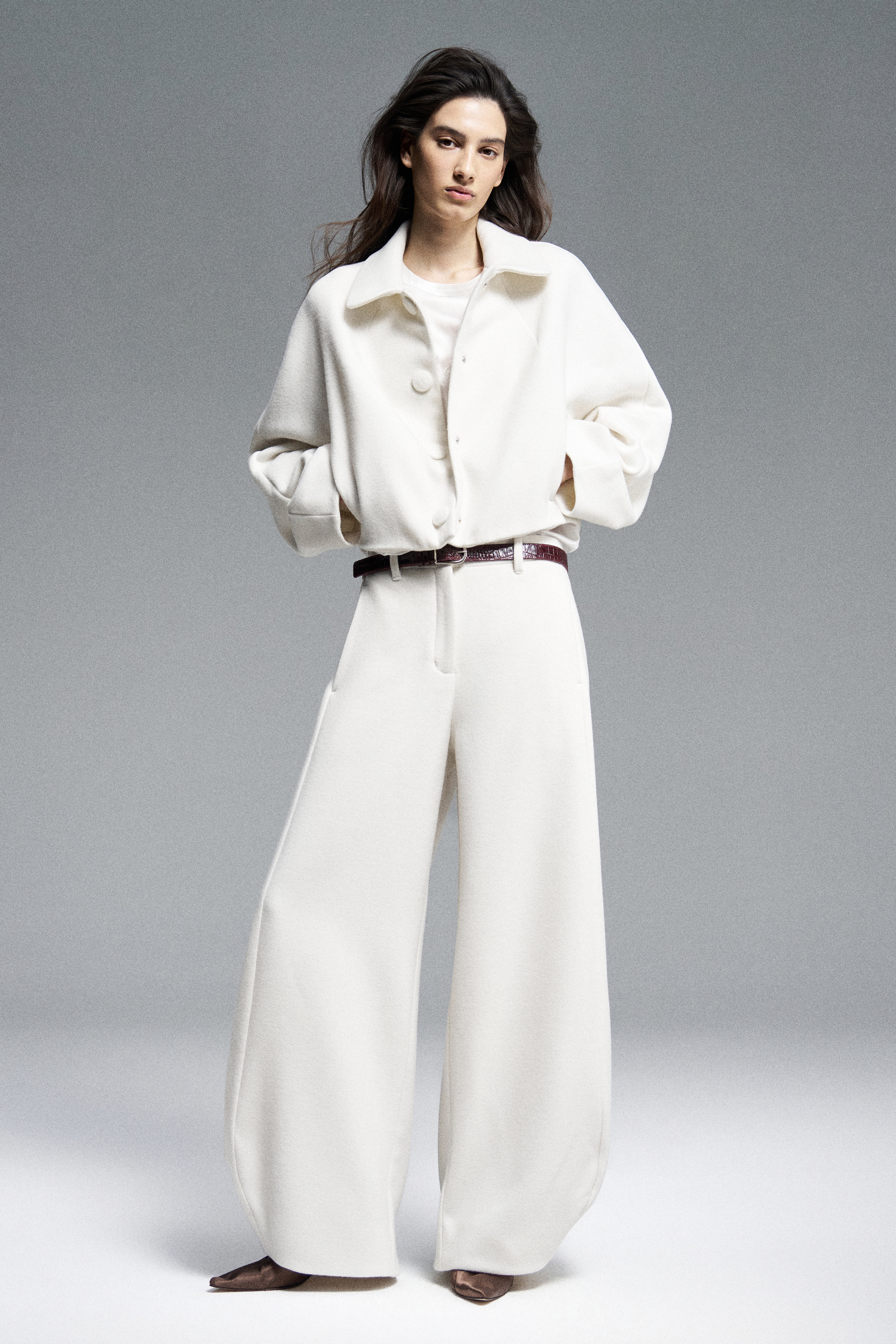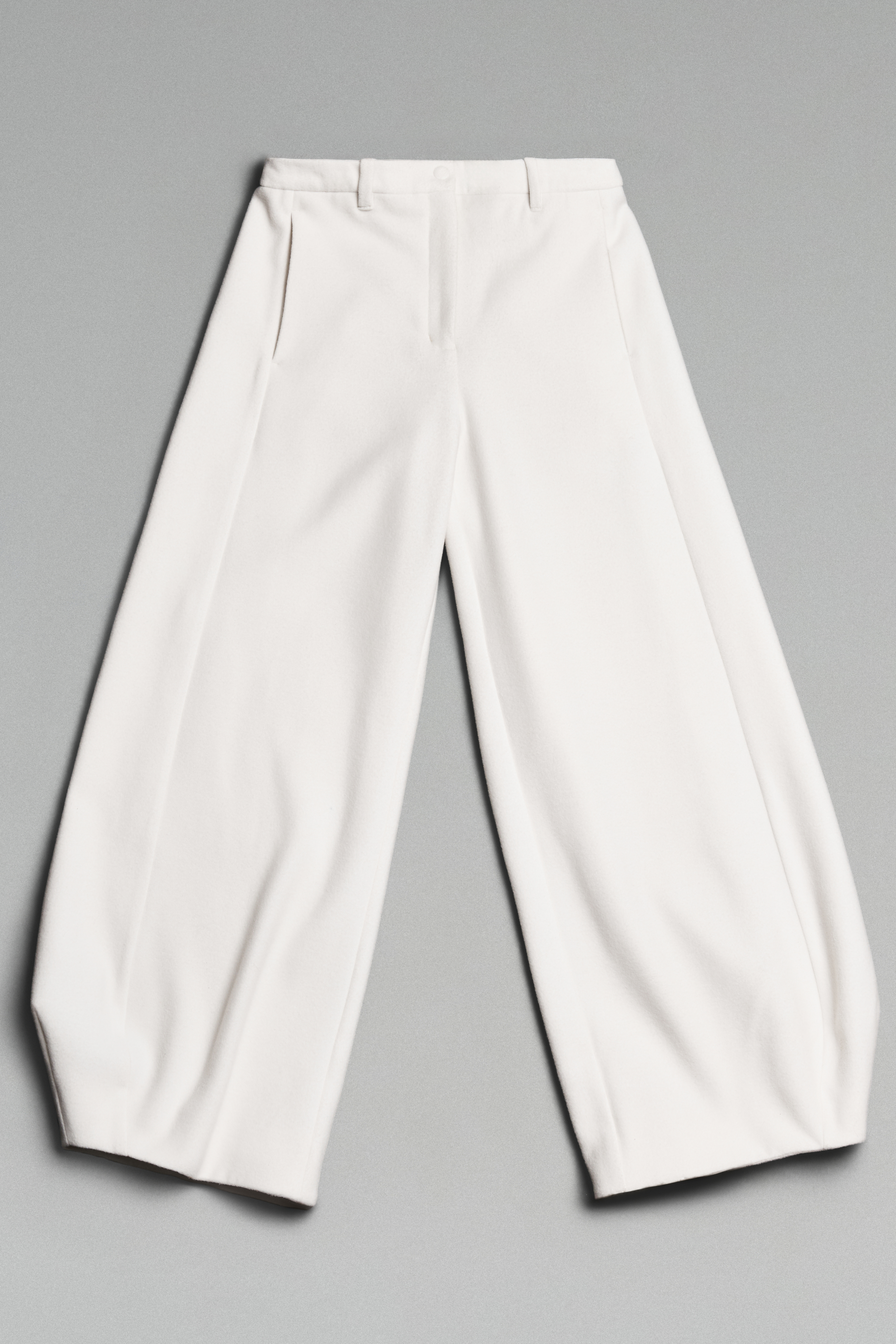 Объемные брюки из мягкого флиса силуэта «bubble», резко сужающиеся к низу. Пояс брюк обработан корсажной лентой, застежка на молнию и обтянутую кнопку. Акцентированы диагональными швами спереди. Шлейки для ремня.