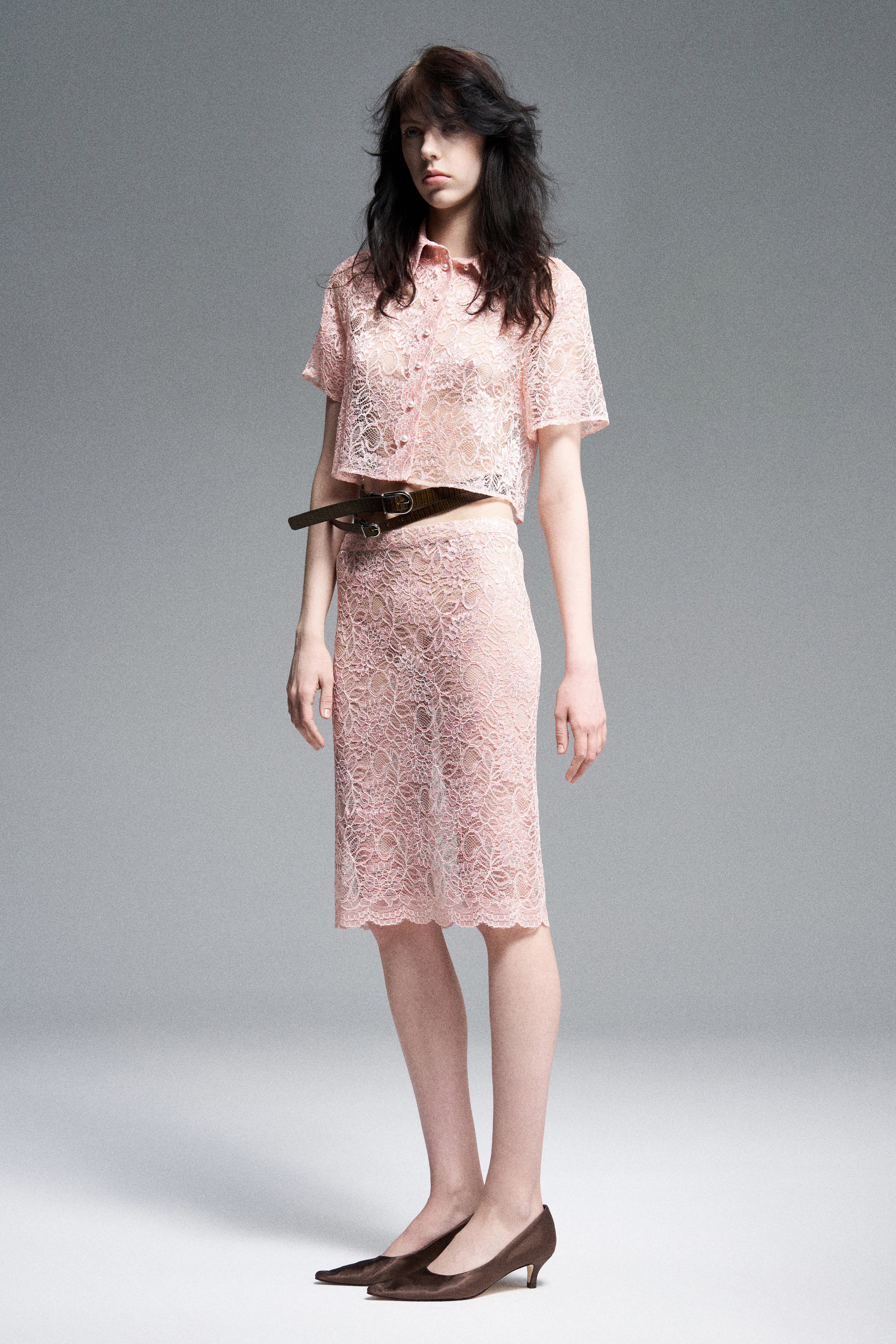 Укороченная блуза из японского кружева. При создании полотна используются нити разной толщины, что придает рисунку объем и фактурно подчеркивает орнамент. Модель с классическими лацканами. Планка декорирована тесьмой из кружева и жемчужными пуговицами.