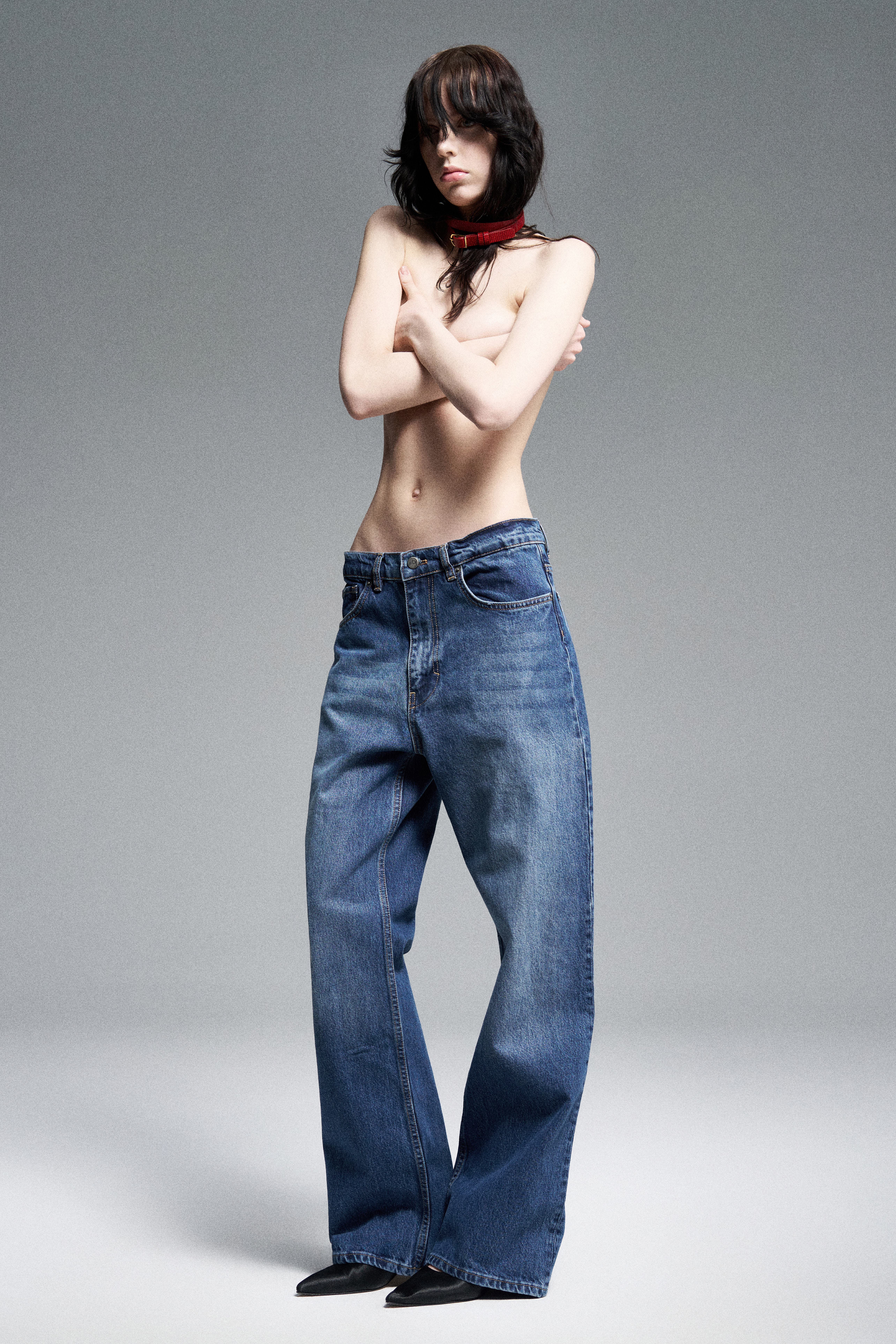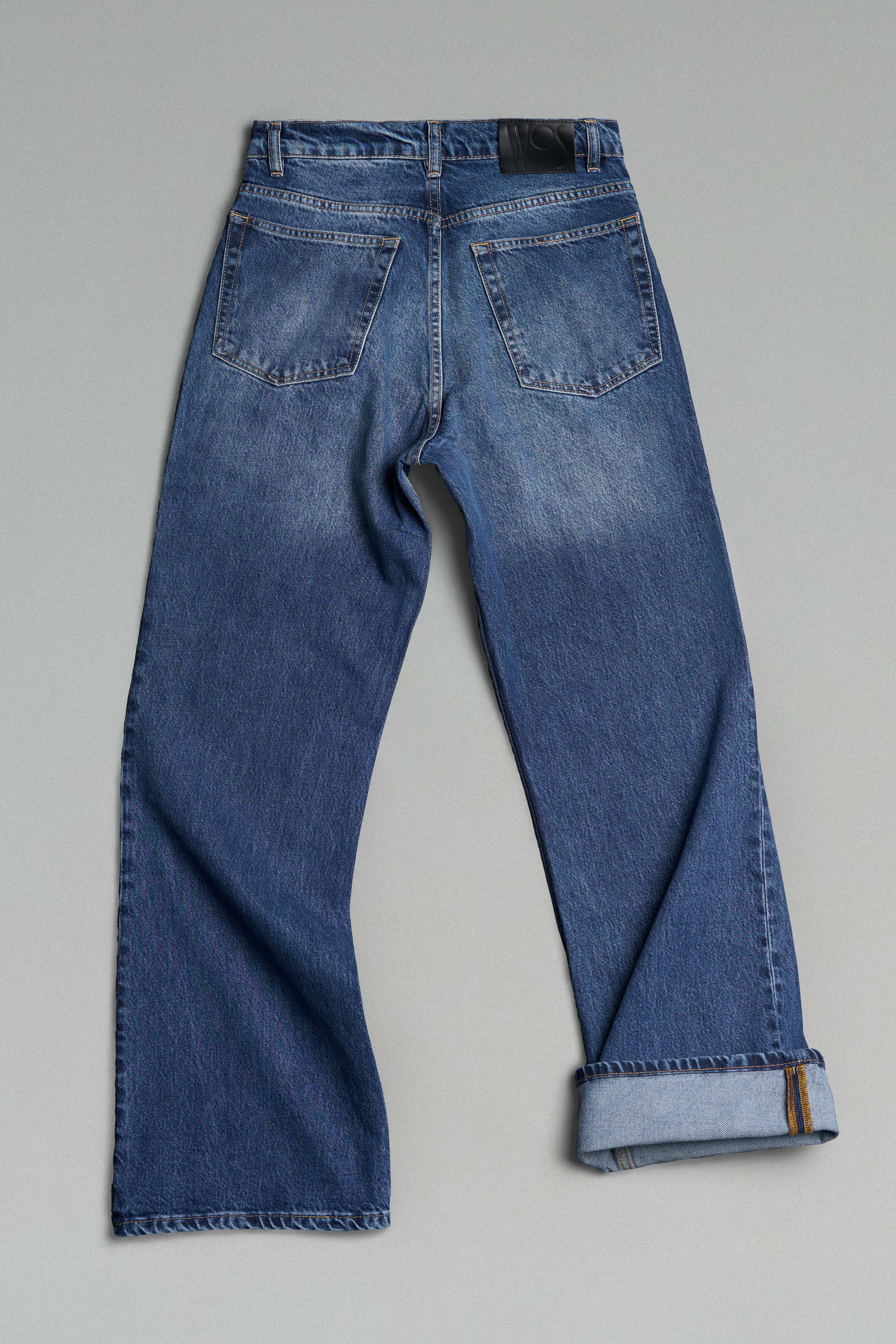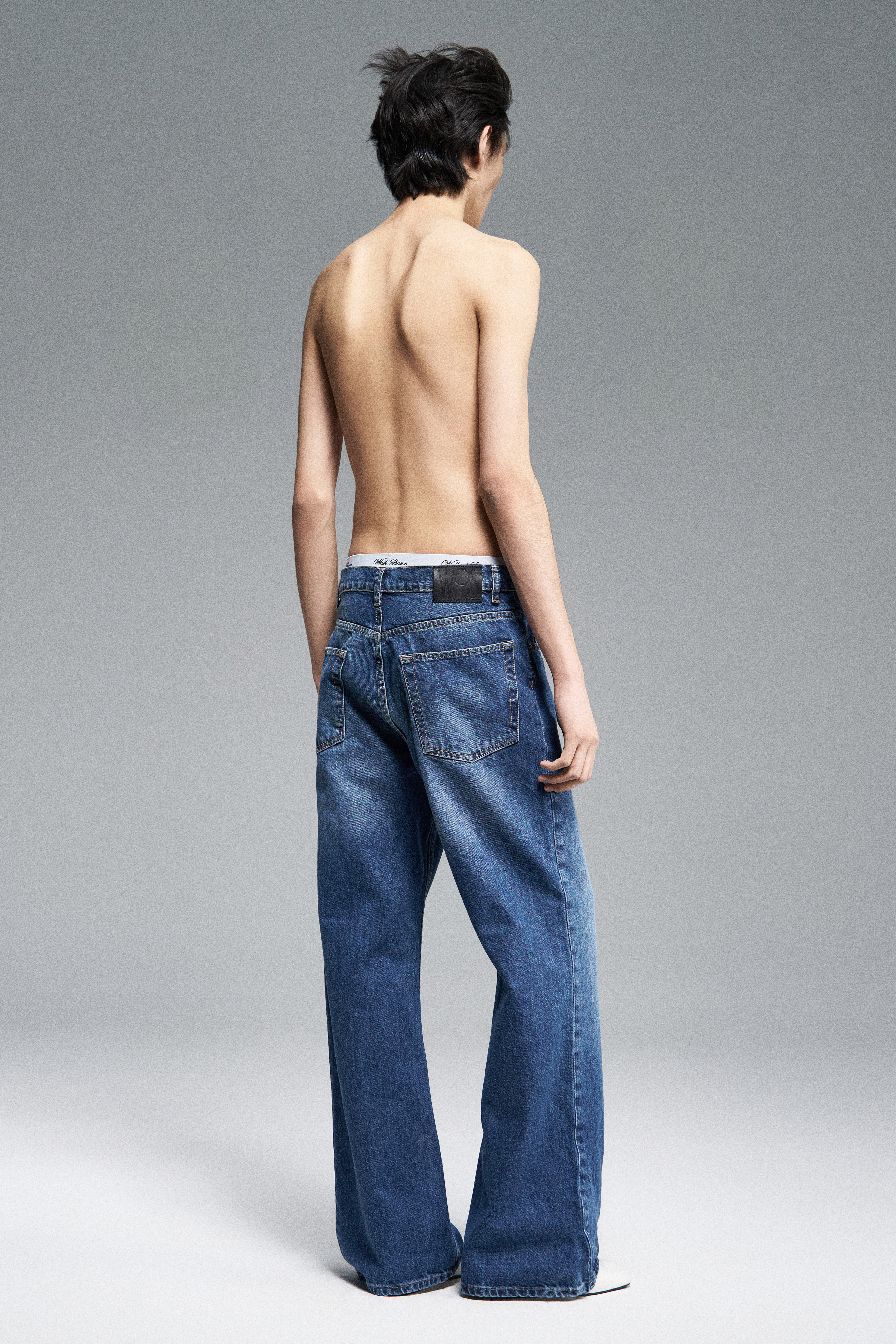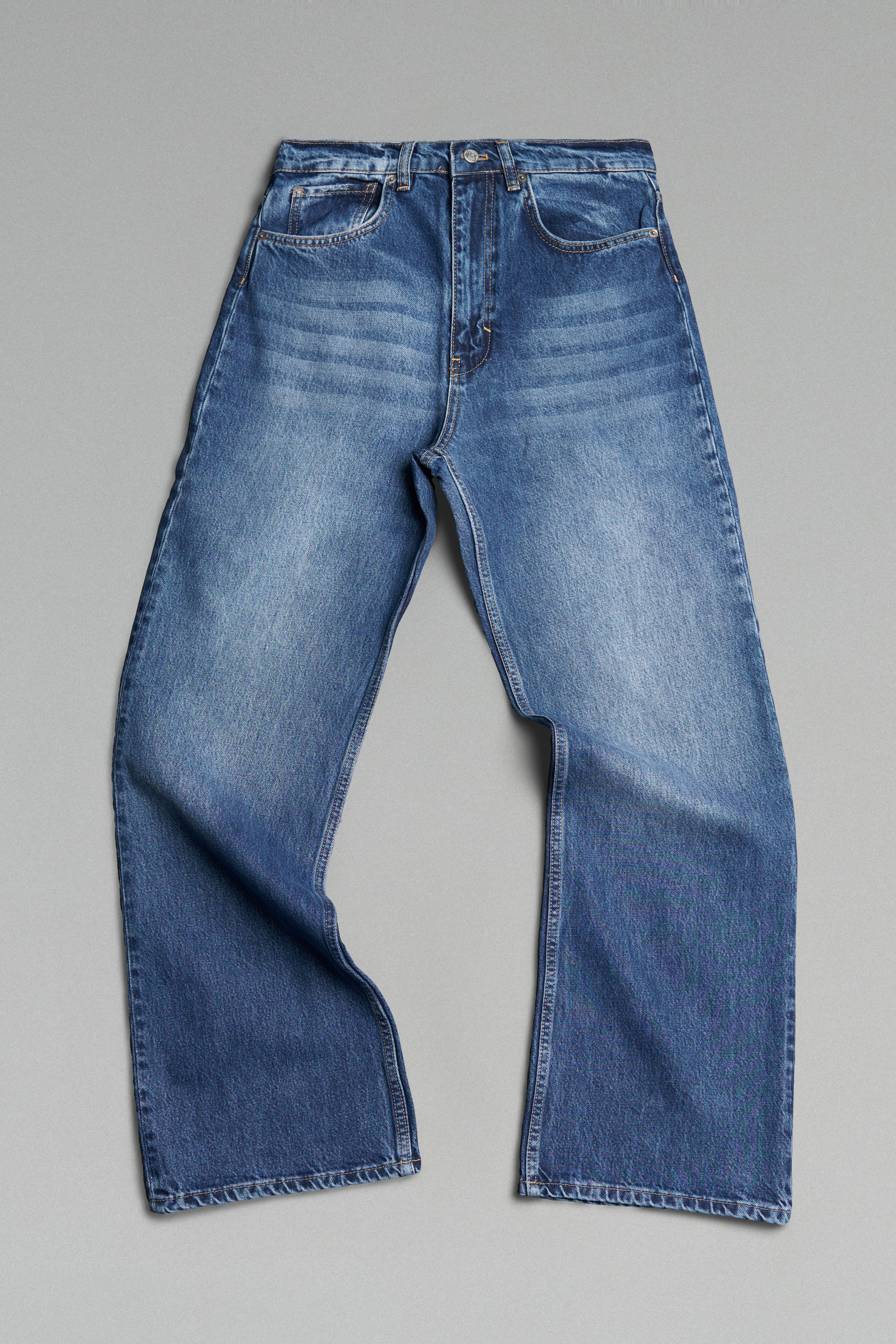 Прямые джинсы свободного кроя со средней посадкой. Пять карманов. Застежка на молнию и металлическую брендированную пуговицу.