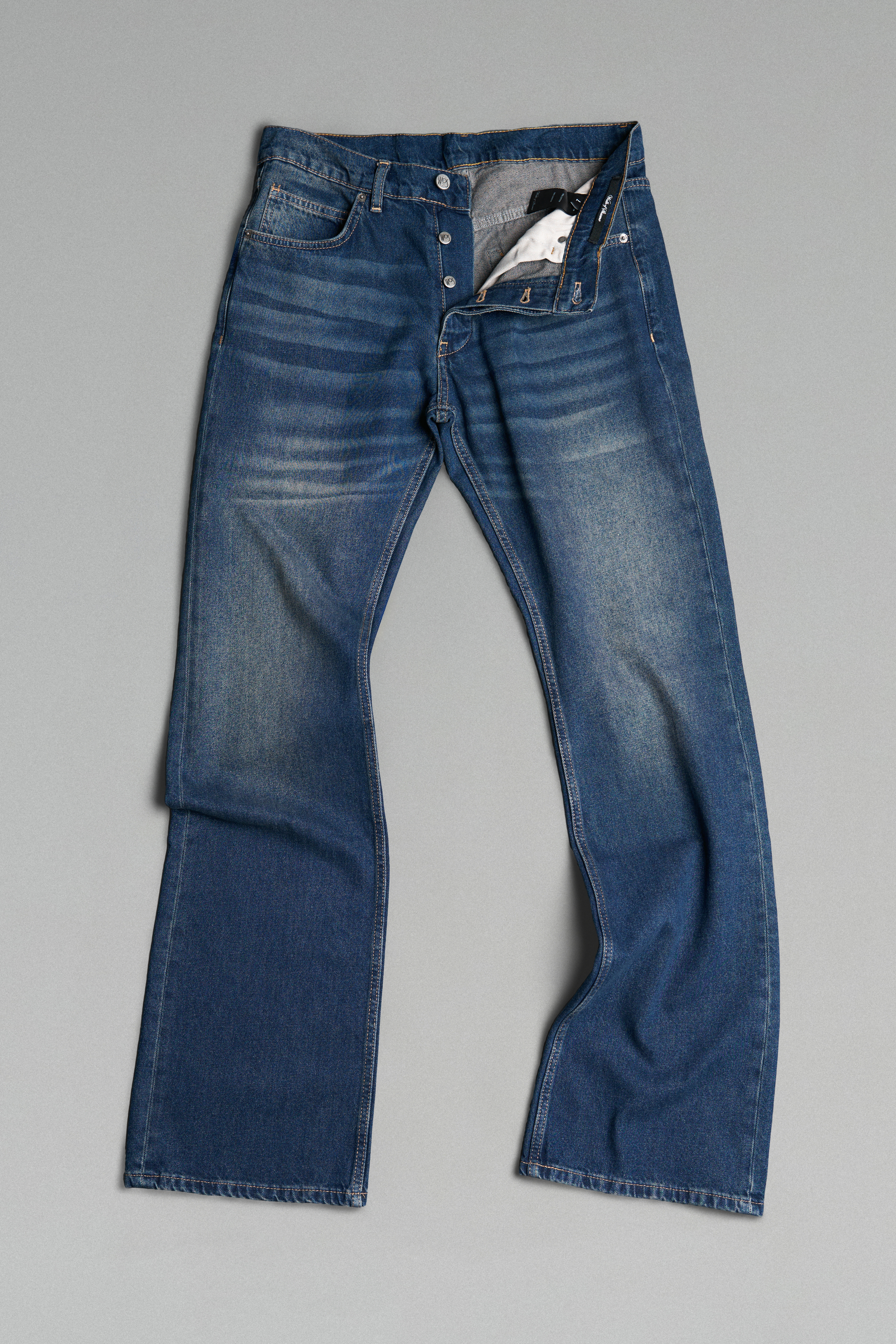 Расклешенные от колена джинсы со средней посадкой. Пять карманов. Застежка на ряд металлических брендированных пуговиц.