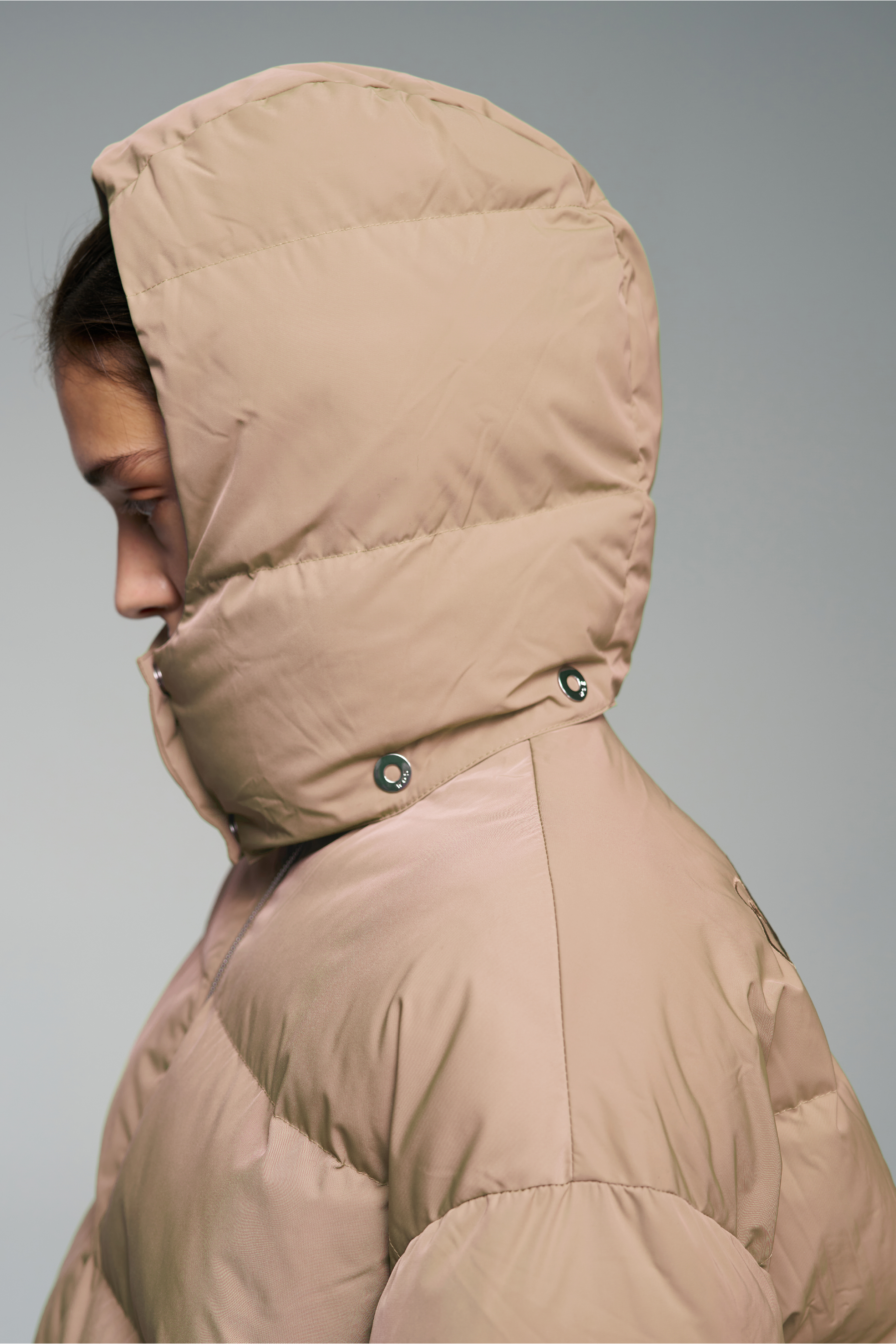 Объемный пуховик бежевого цвета с вышивкой — Walk of Shame на спине. Съемный капюшон, воротник стойка, два передних кармана и возможность регулировки прилегания по низу изделия.