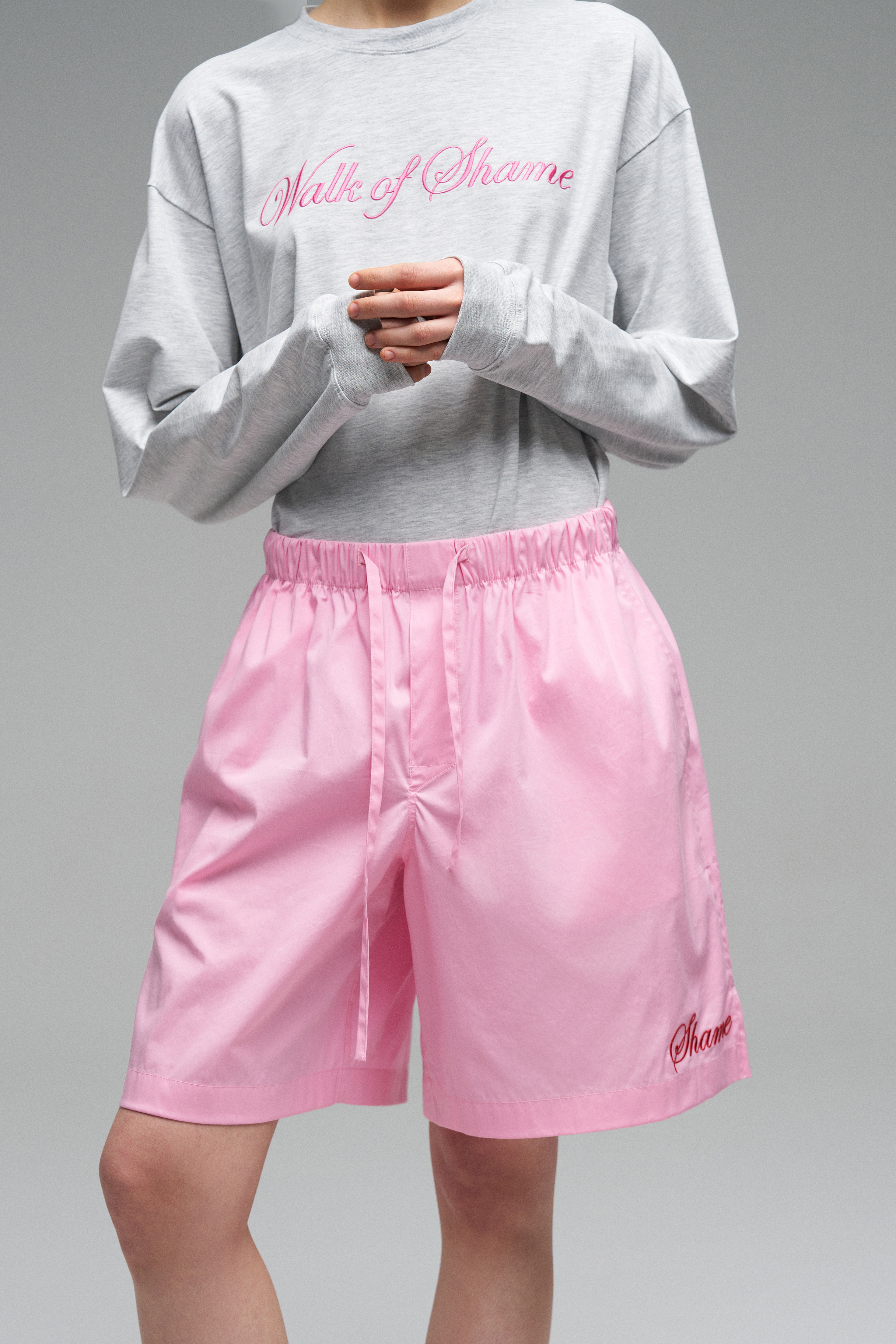 Пижамные шорты из мягкой и приятной к телу хлопковой ткани. Модель с регулируемым поясом и вышивкой бренда по бокам изделия.