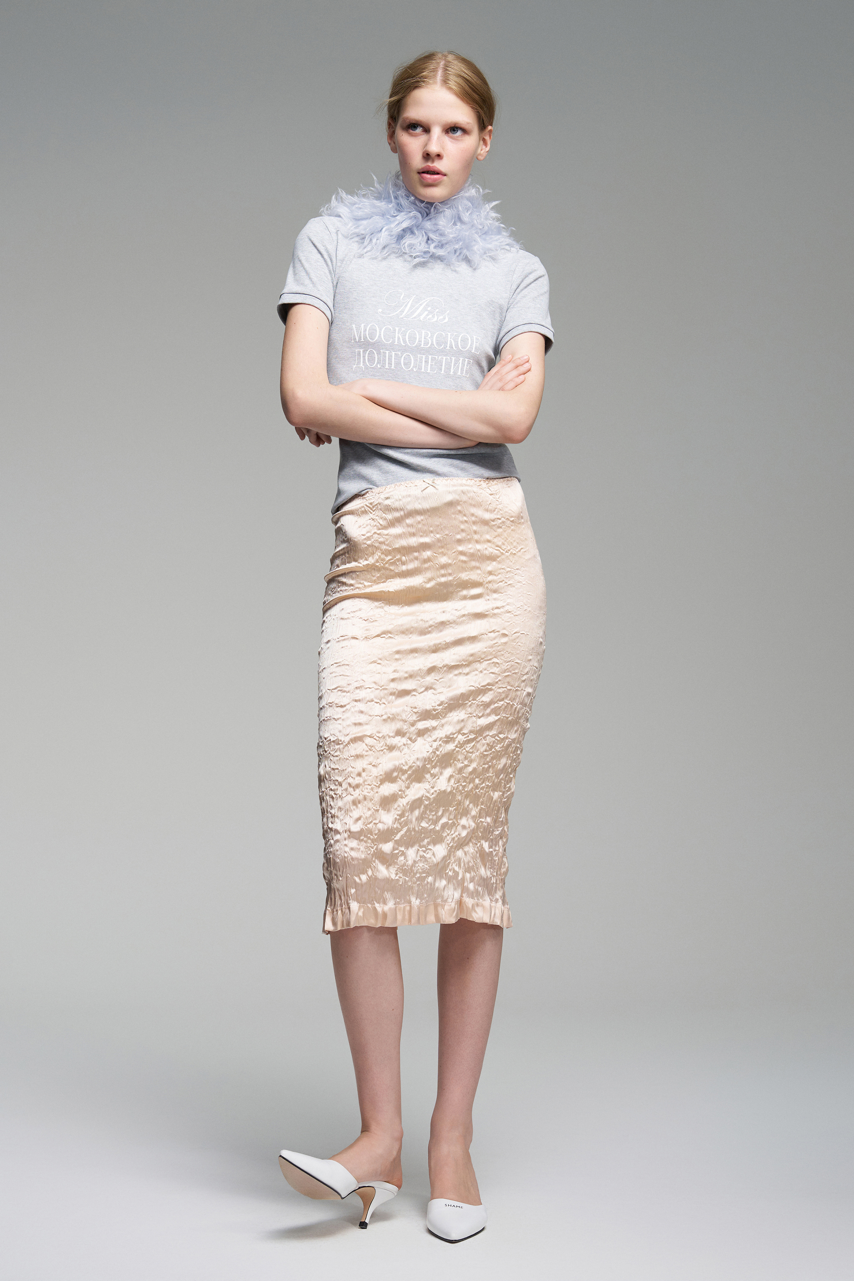 Приталенная футболка из эластичного рибана с круглым вырезом и короткими рукавами. На груди — ироничная надпись «Miss Московское долголетие».
