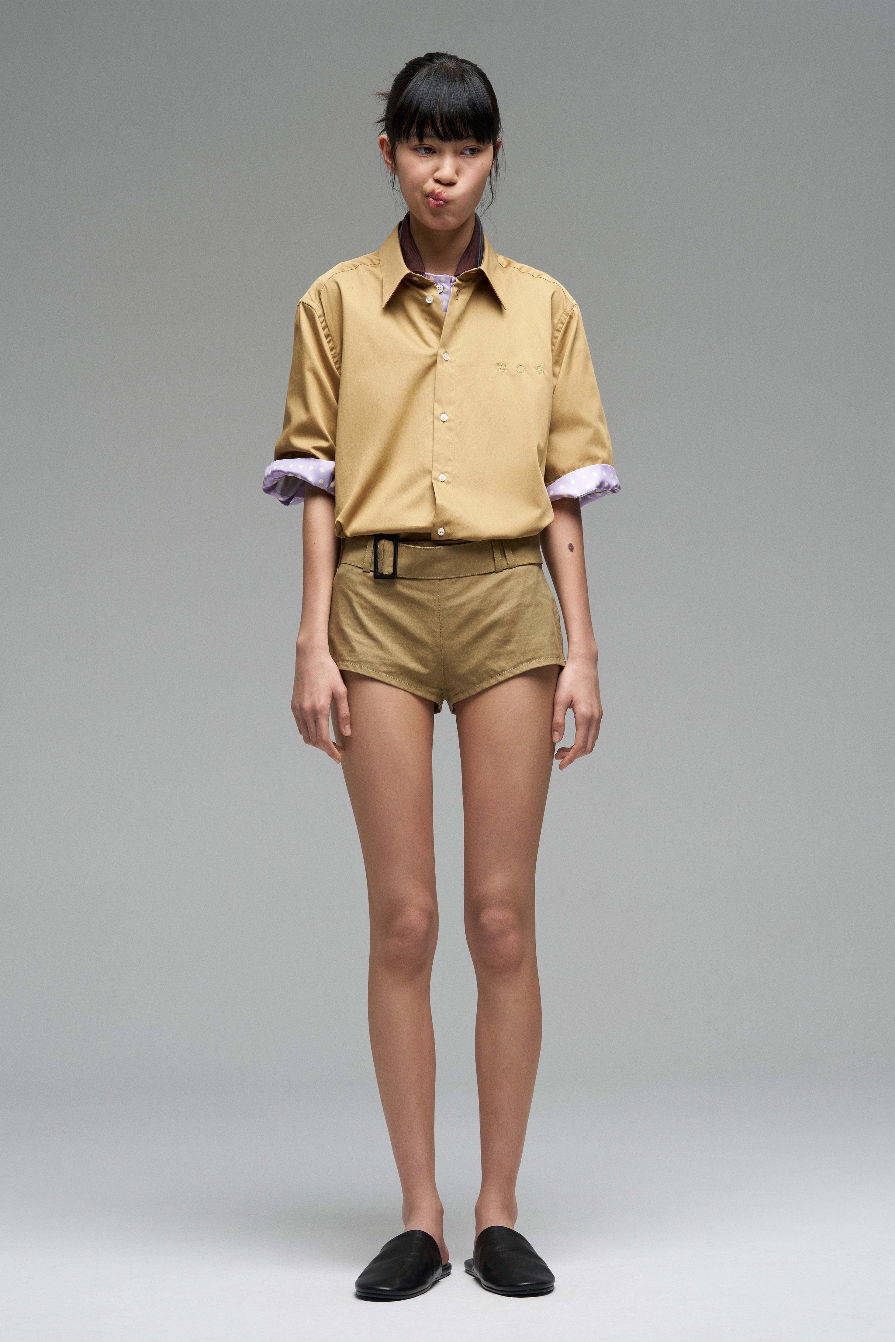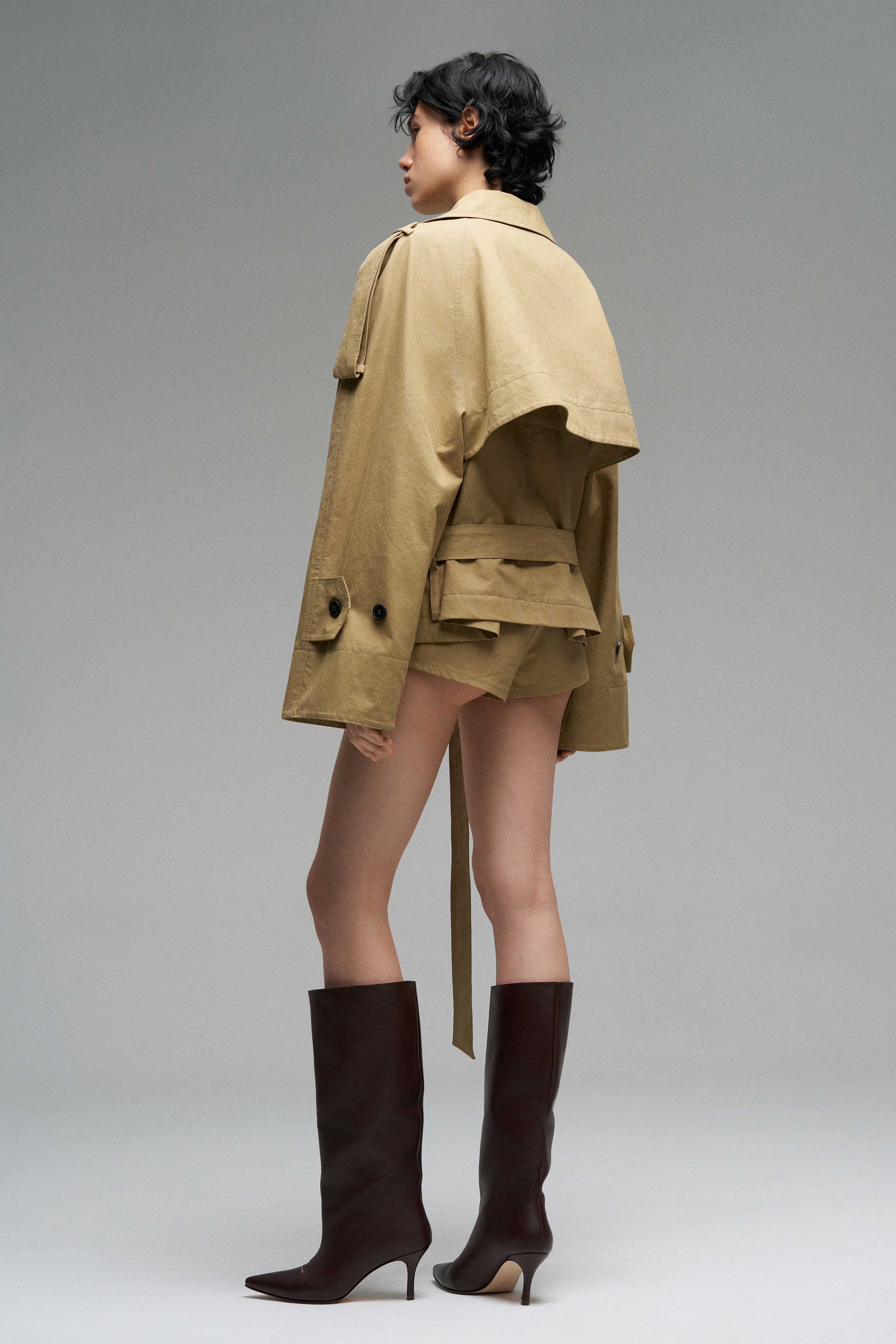 Короткие шорты из плотного брезента со средней посадкой. Оснащены поясом и шлёвками для него, прямой крой.