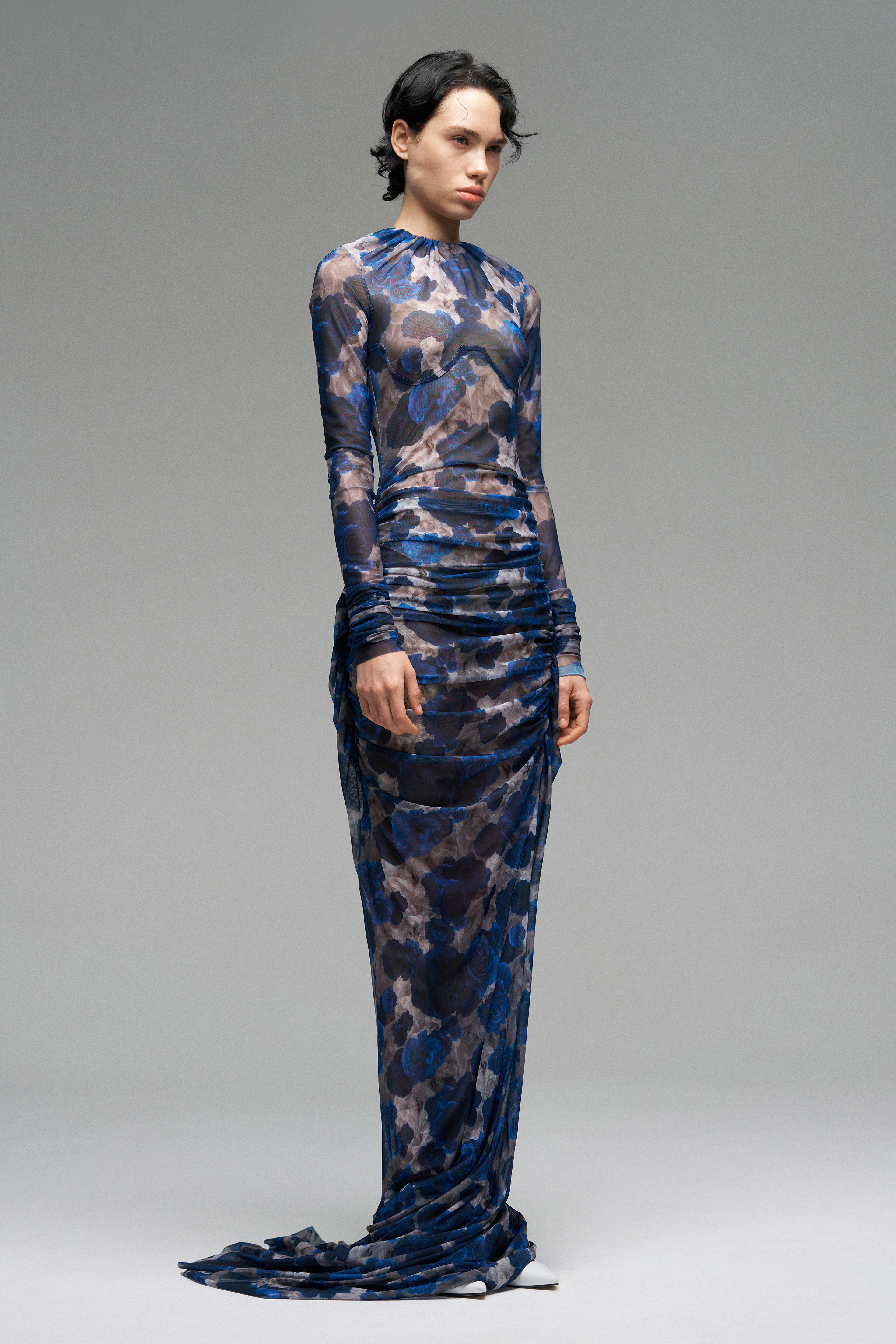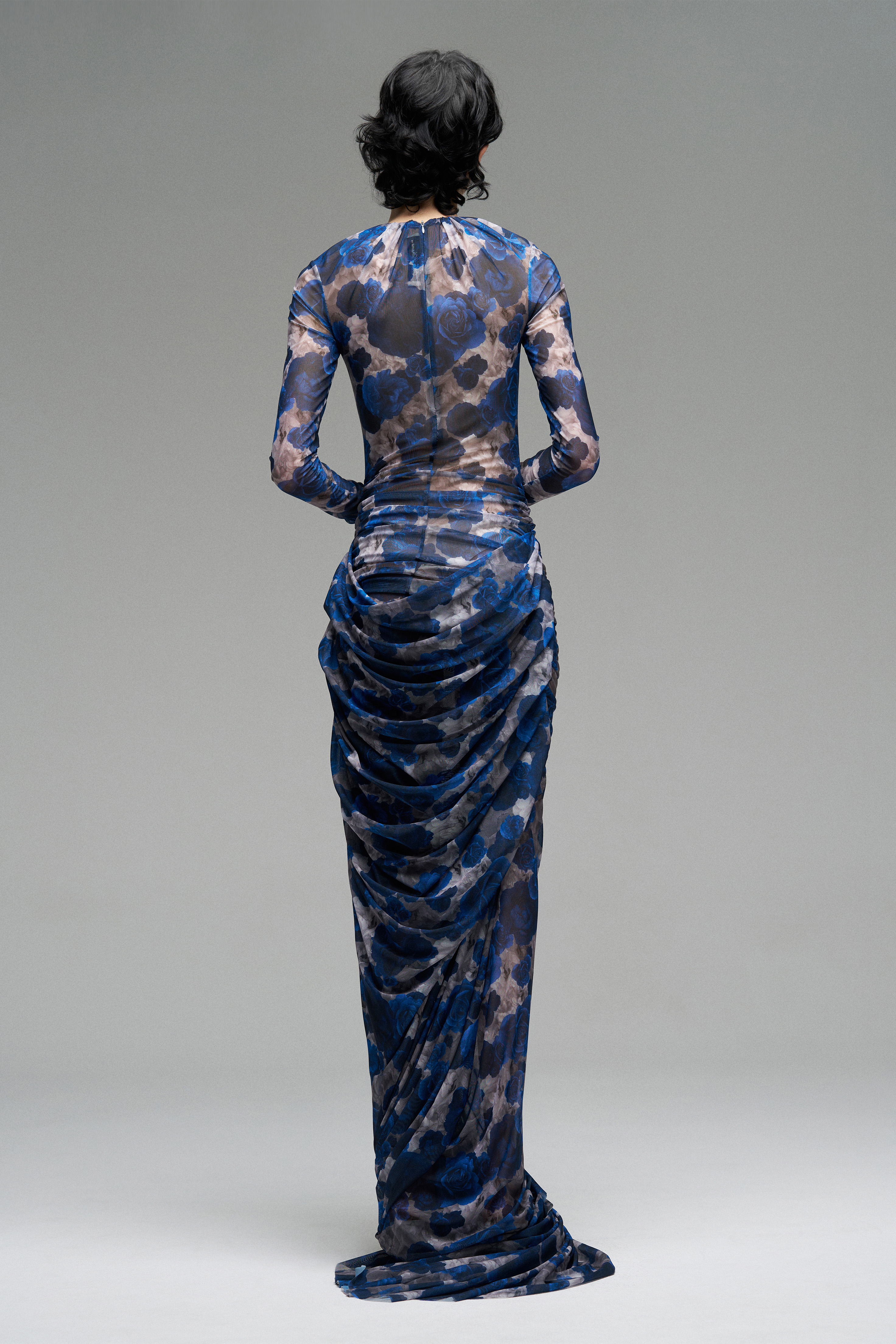 Платье из эластичной сетки с принтом роз. Полупрозрачная ткань мягко драпируется по телу, создавая акцент на силуэте. В конструкции — имитация косточек под грудью. Сзади — турнюр и удлинённый шлейф, придающие объём и движение.