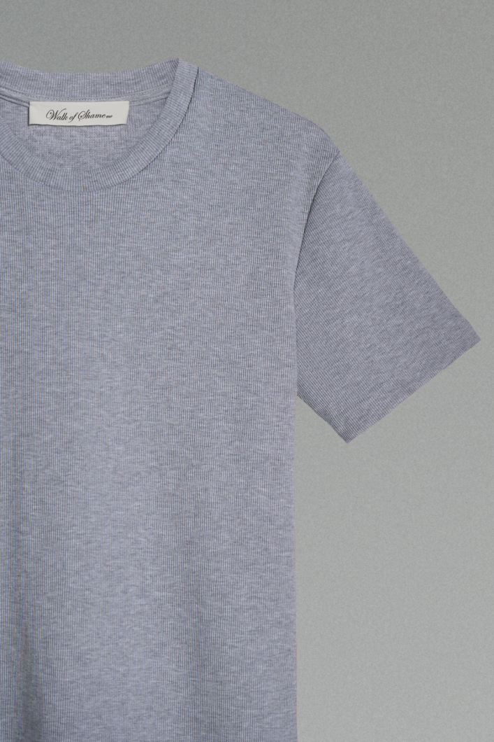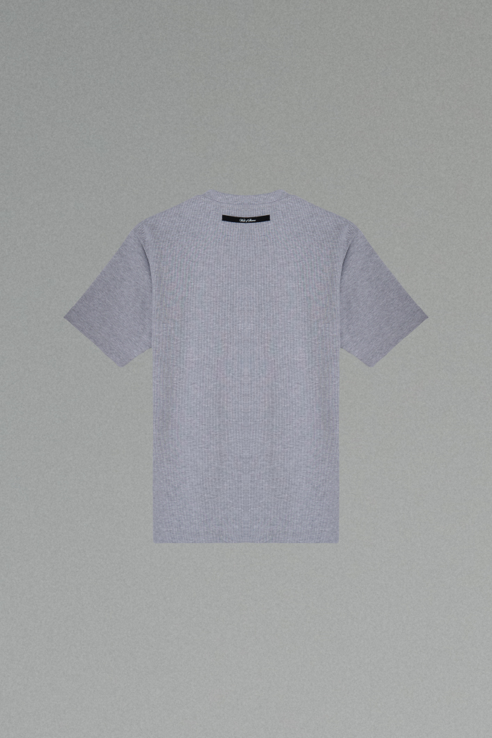 Футболка серого цвета с отделкой из рифлёного канта Ribbed по вороту и рукавам. Прямой силуэт, классическая посадка. Сзади нашивка с логотипом бренда.