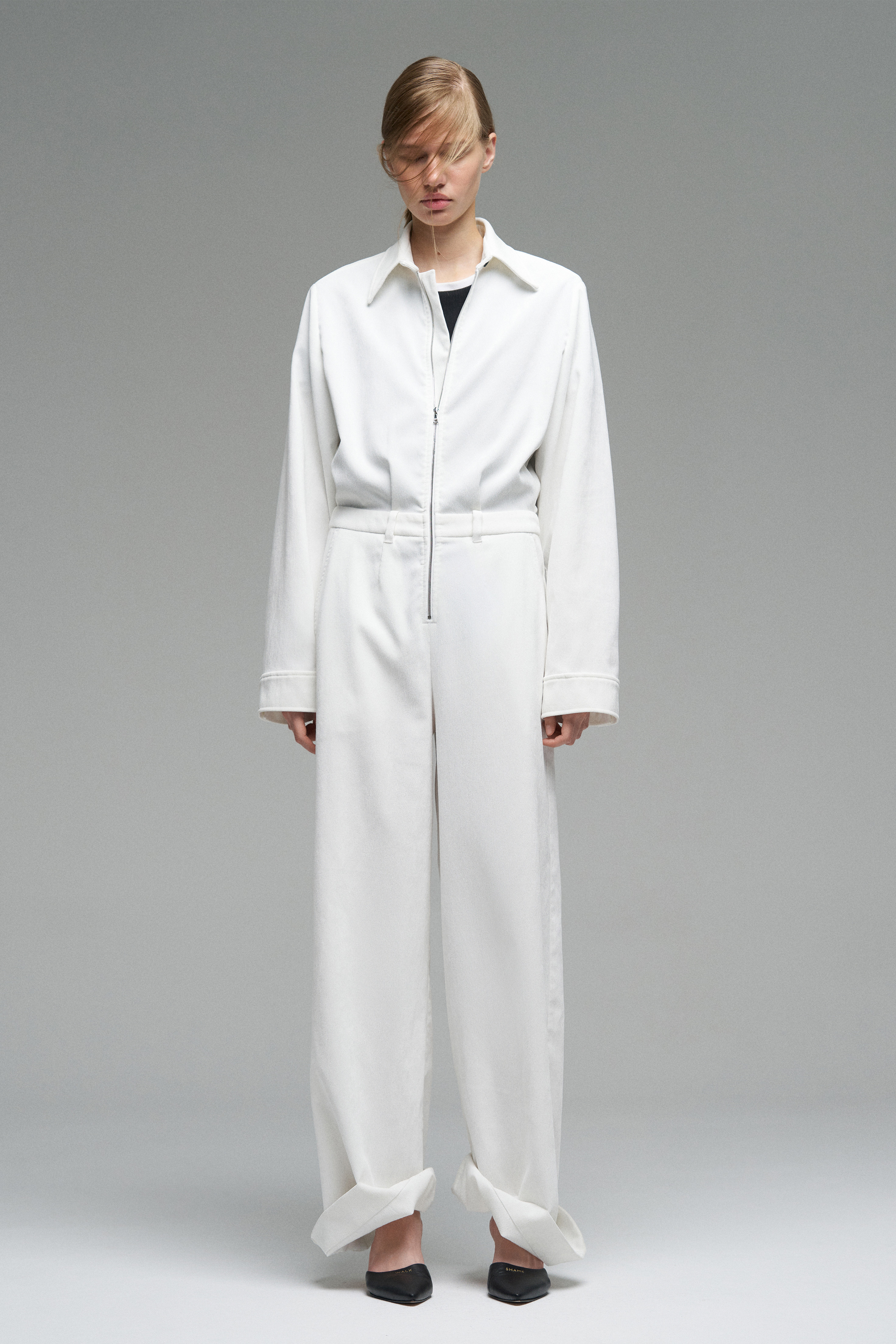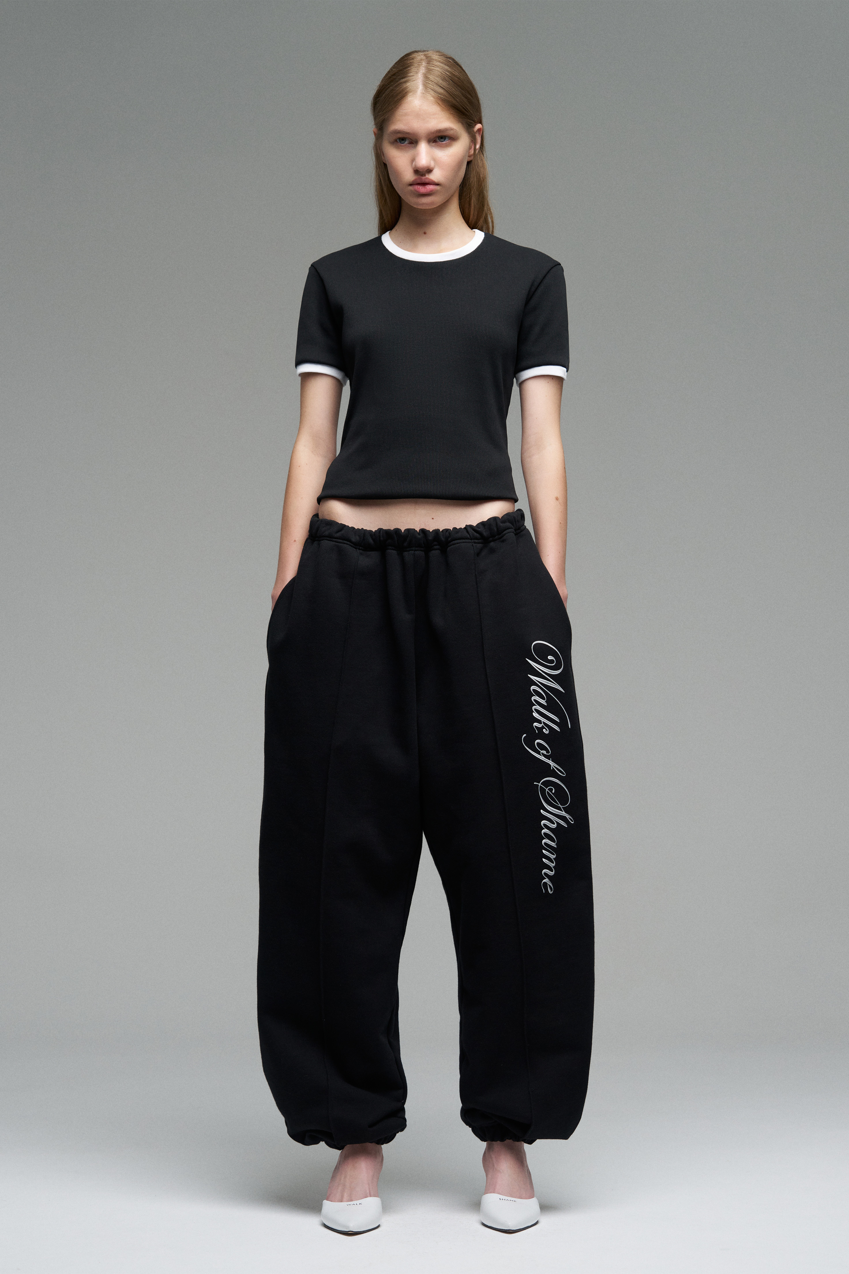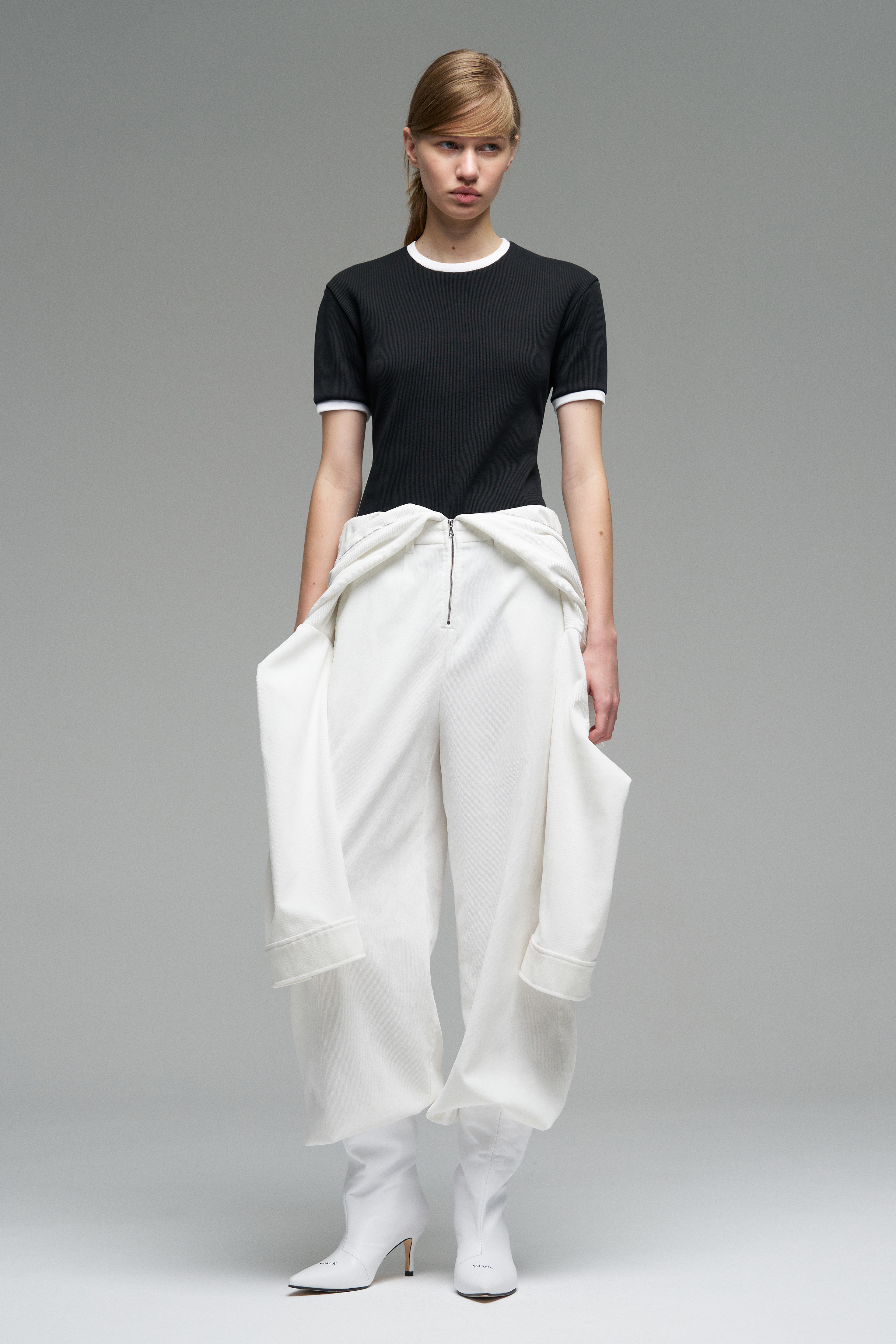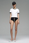 Футболка чёрного цвета с контрастной отделкой из белого рифлёного канта Ribbed по вороту и рукавам. Прямой силуэт, классическая посадка.