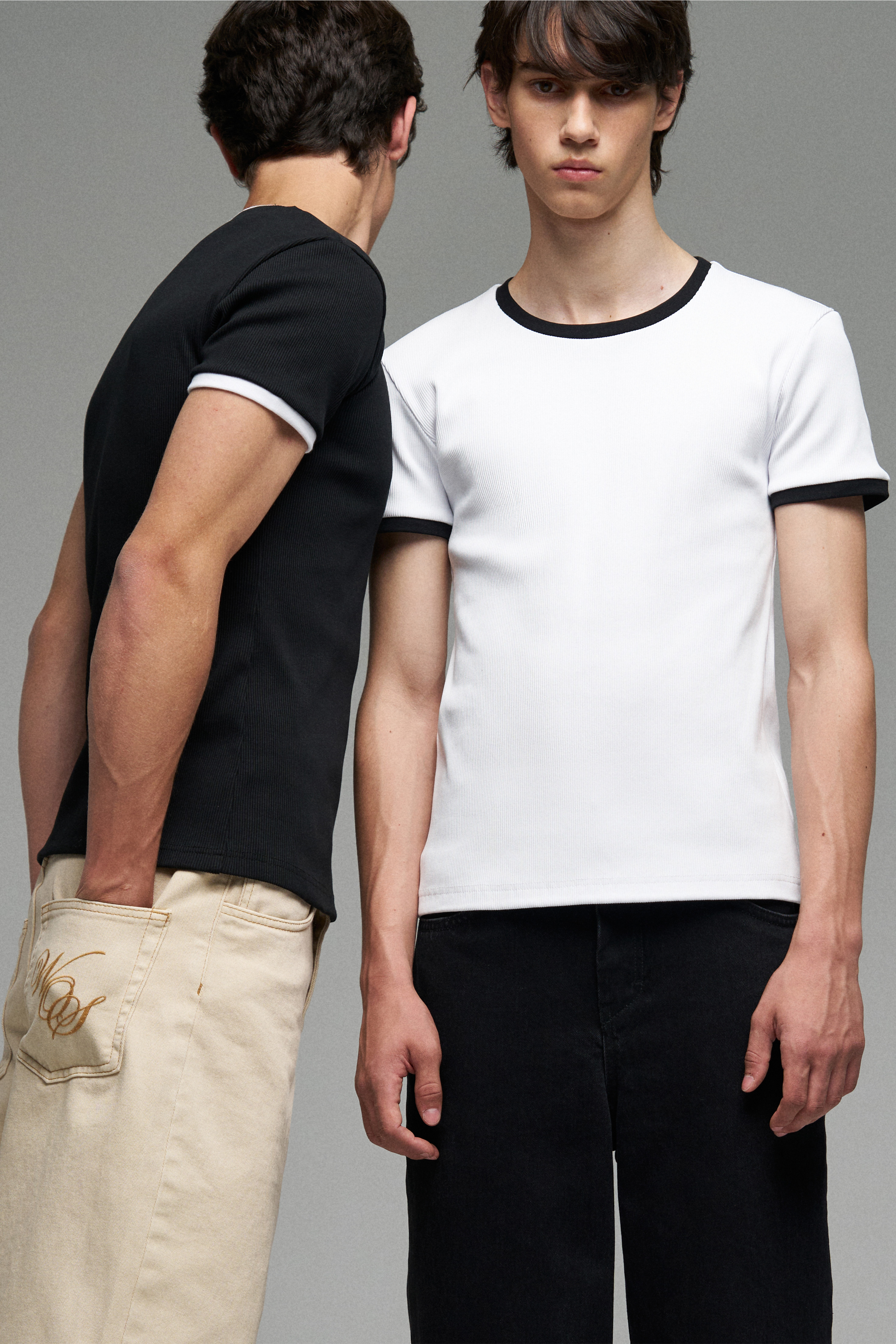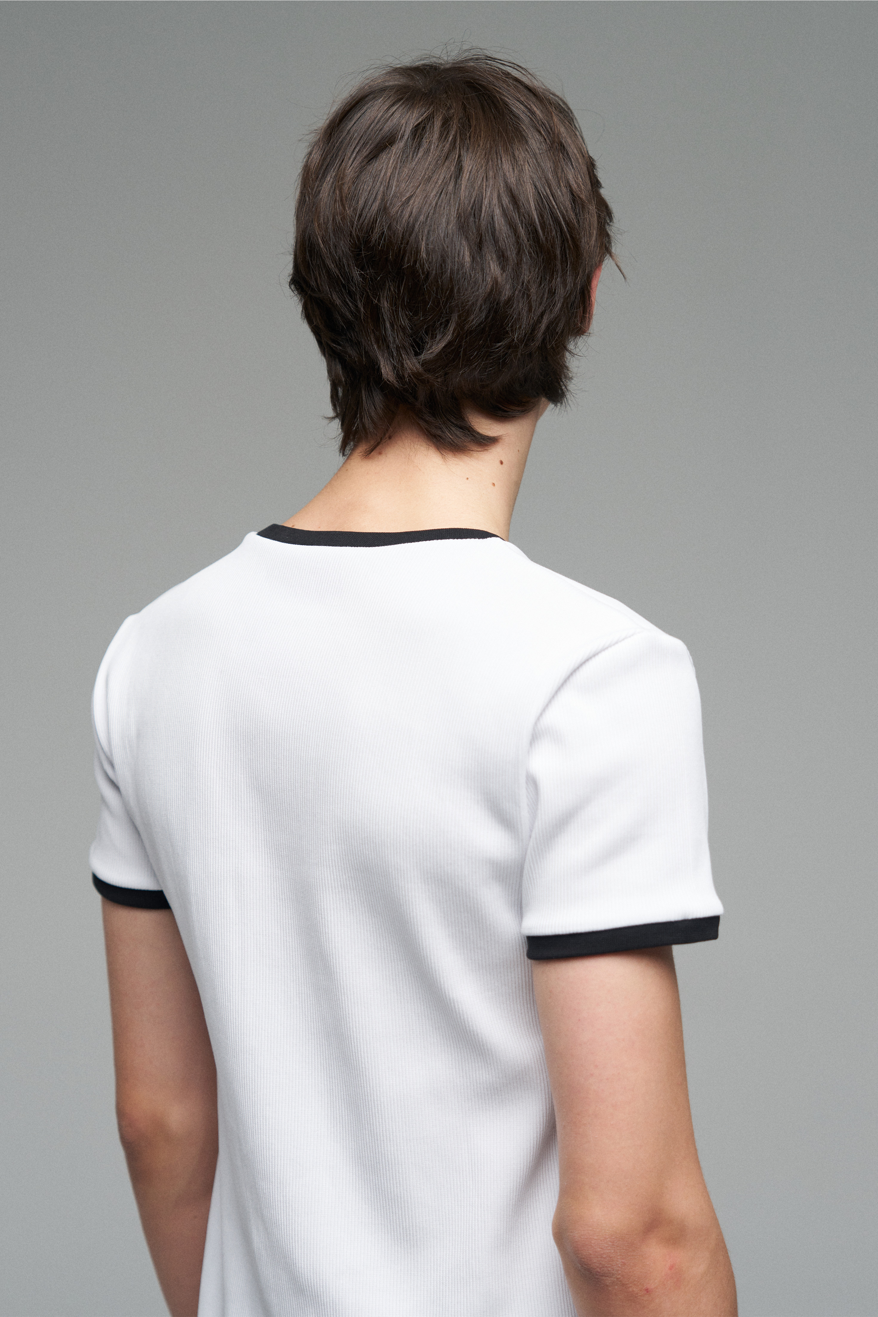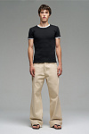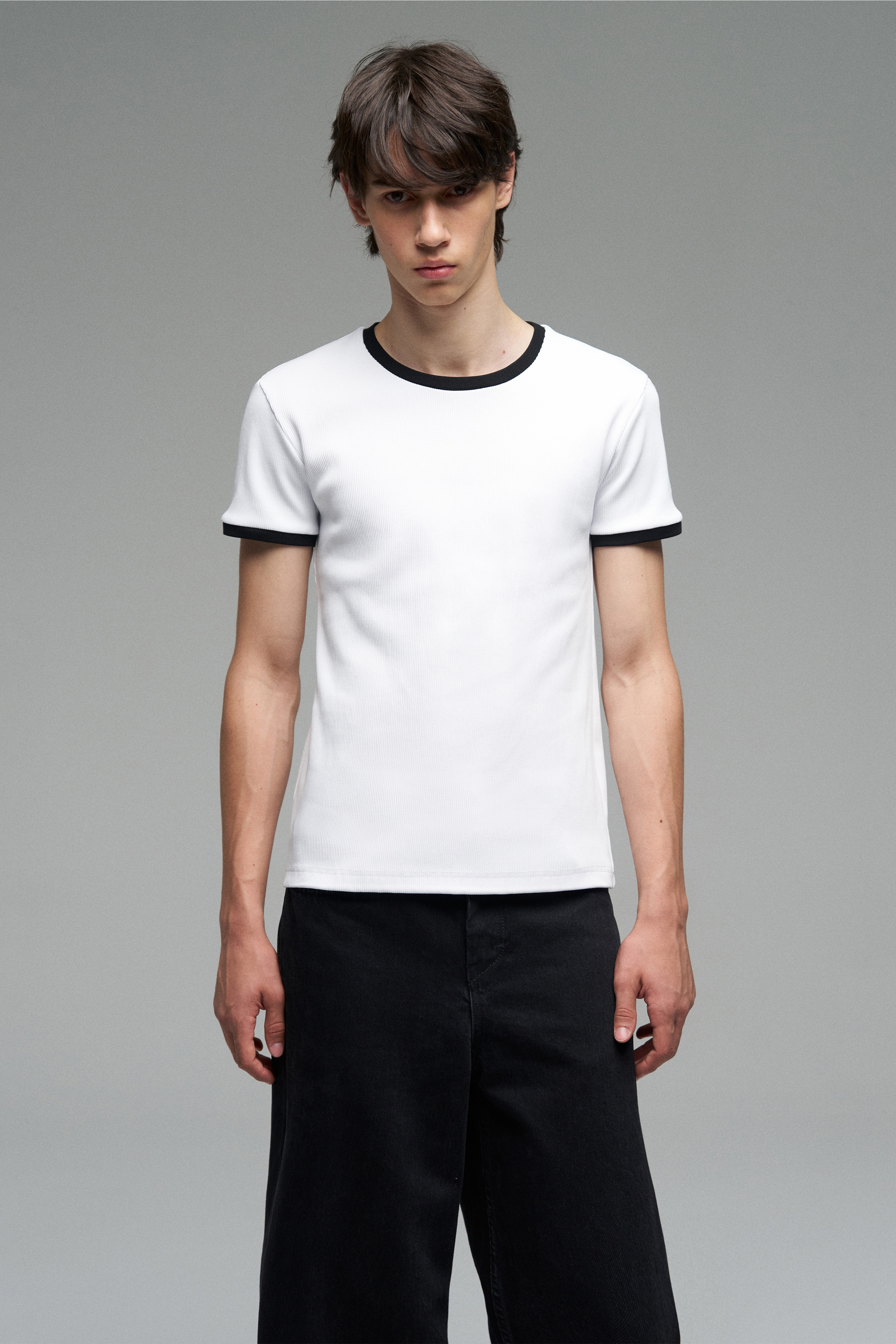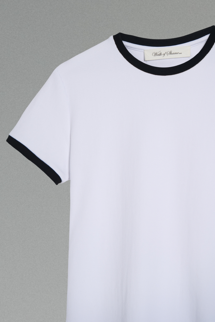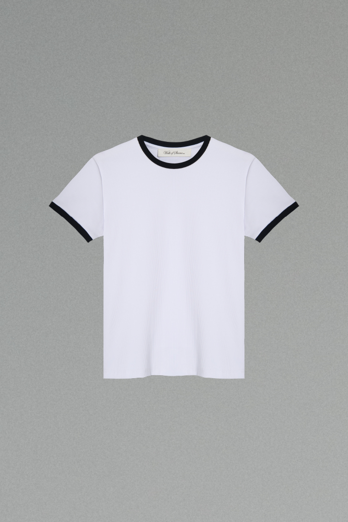 Футболка белого цвета с контрастной отделкой из черного рифлёного канта Ribbed по вороту и рукавам. Прямой силуэт, классическая посадка.