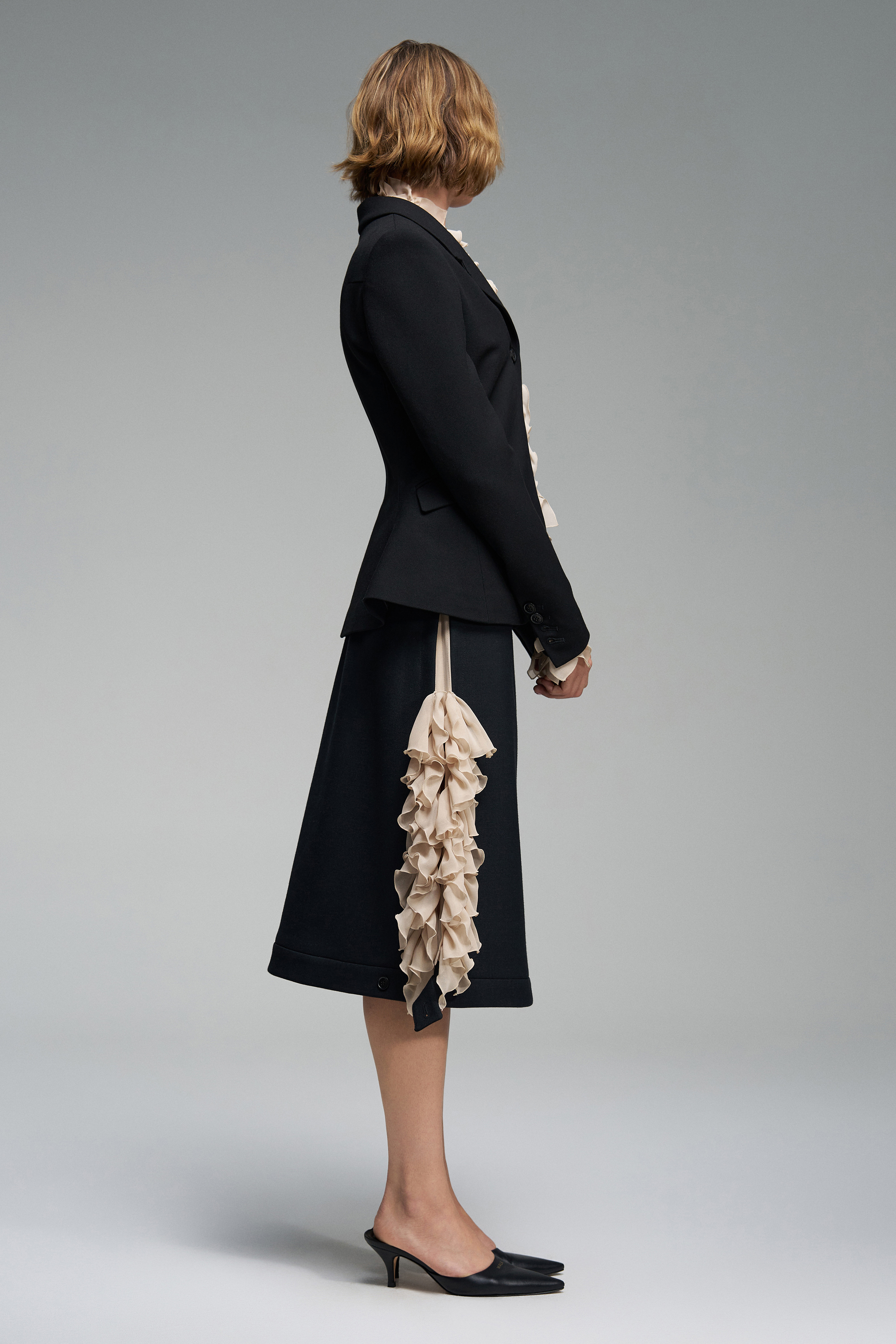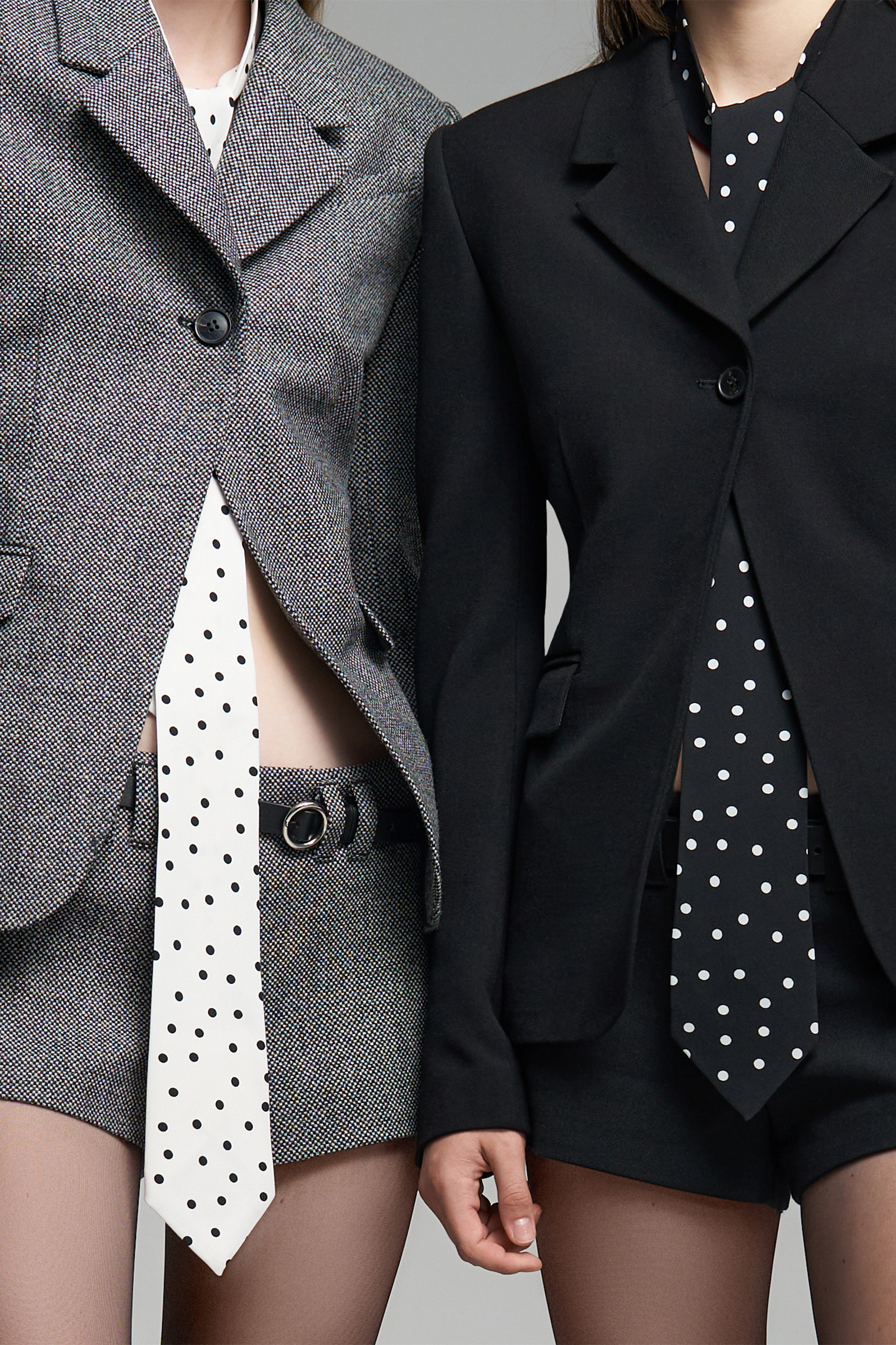 Однобортный жакет приталенного силуэта выполнен из смесовой костюмной шерсти. Изделие с увеличенной линией плеча, карманы в рамку с клапаном и нагрудной листочкой.