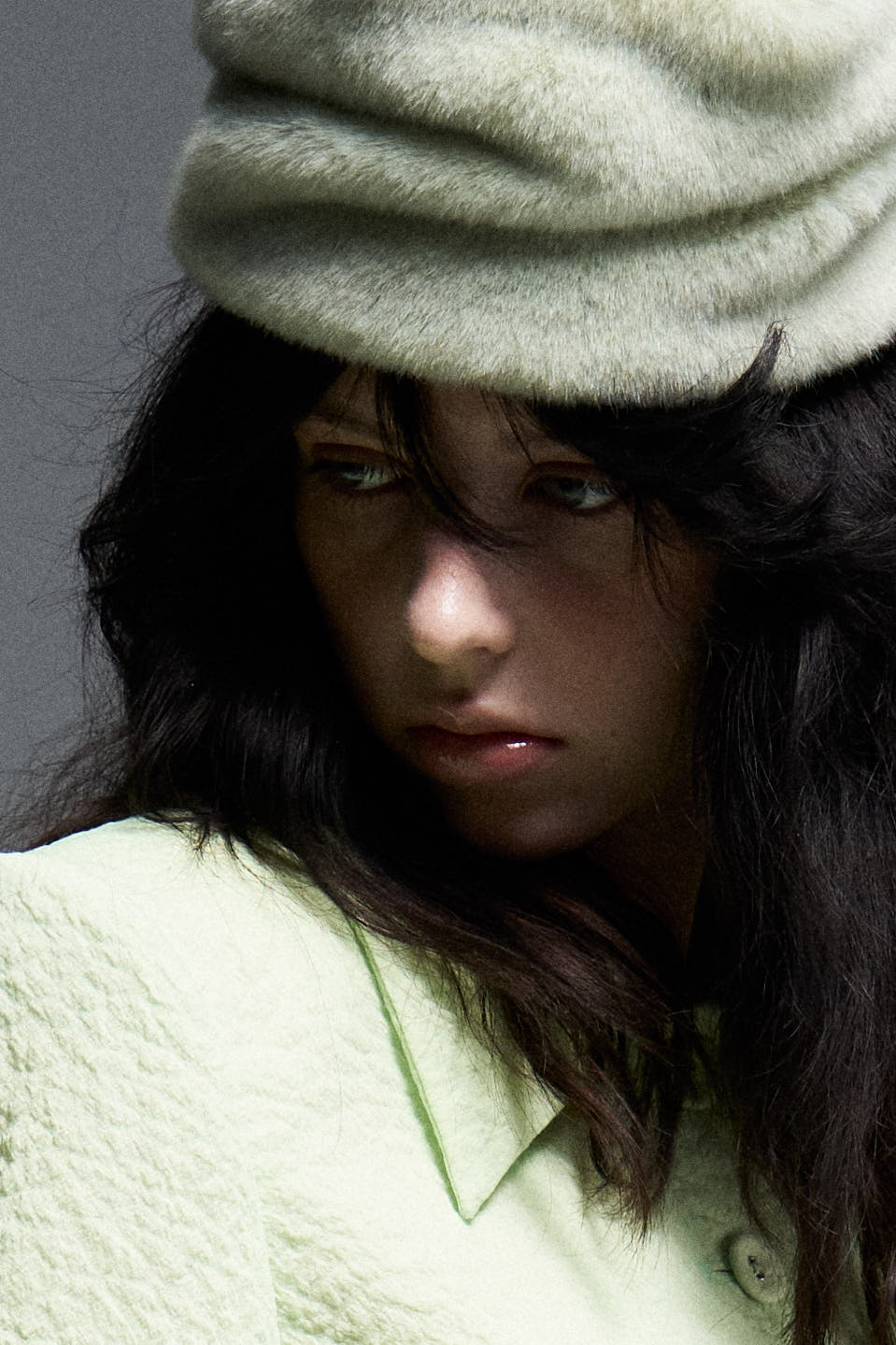Кроп-жакет из фактурного жаккарда. Изделие выполнено без боковых швов. Сзади — объемная складка, украшенная лентой с бантом. Отложной воротник. Потайная застежка.