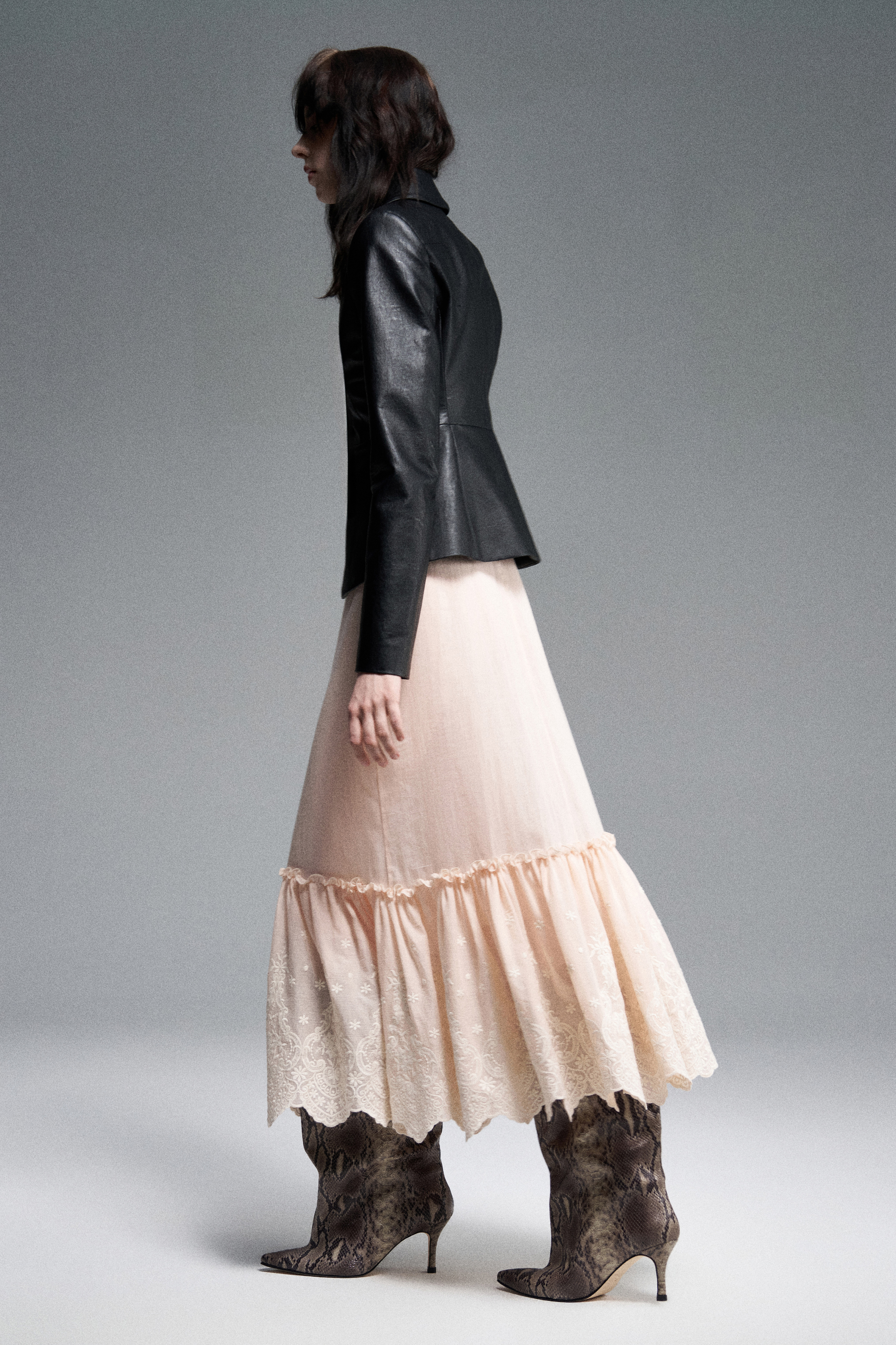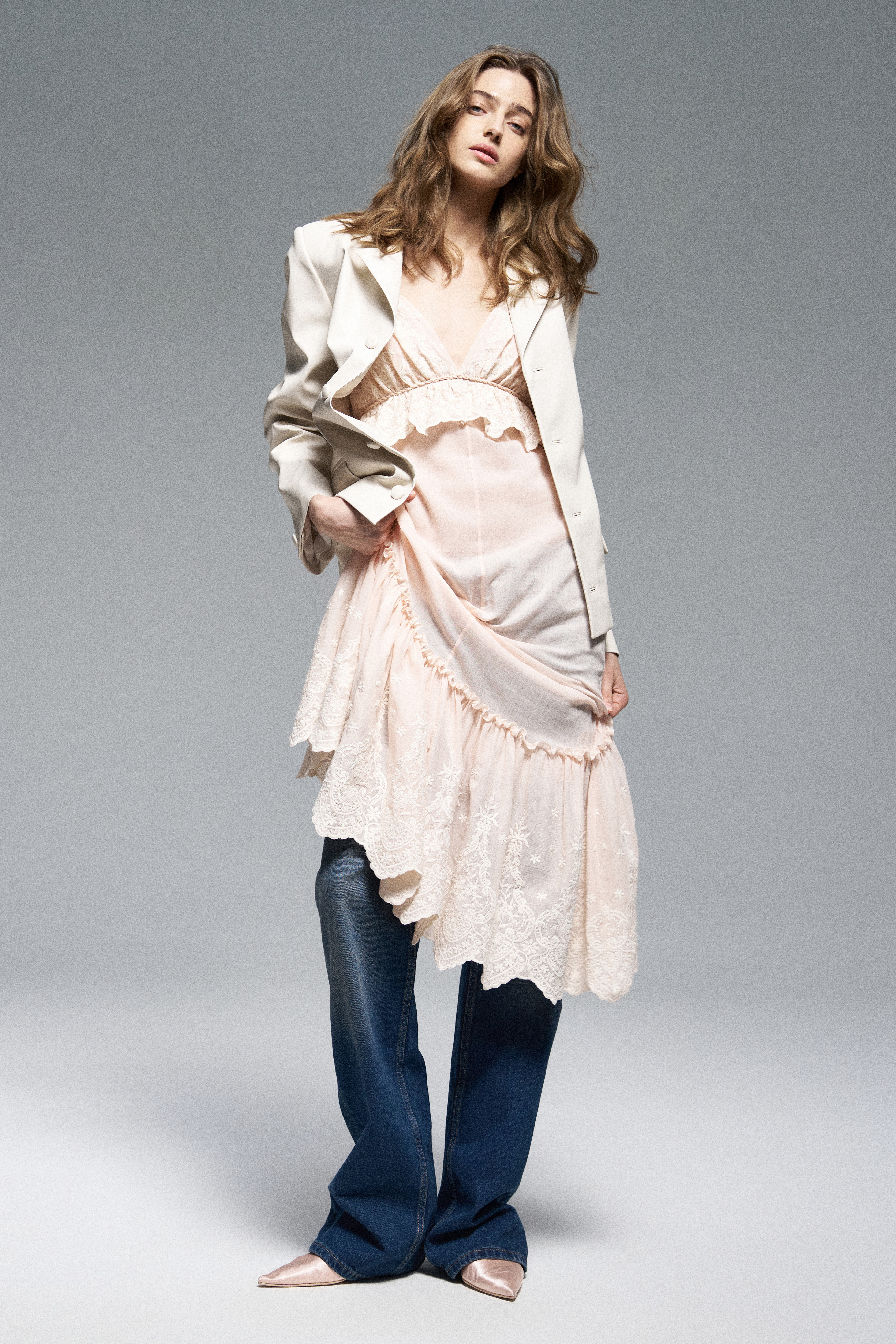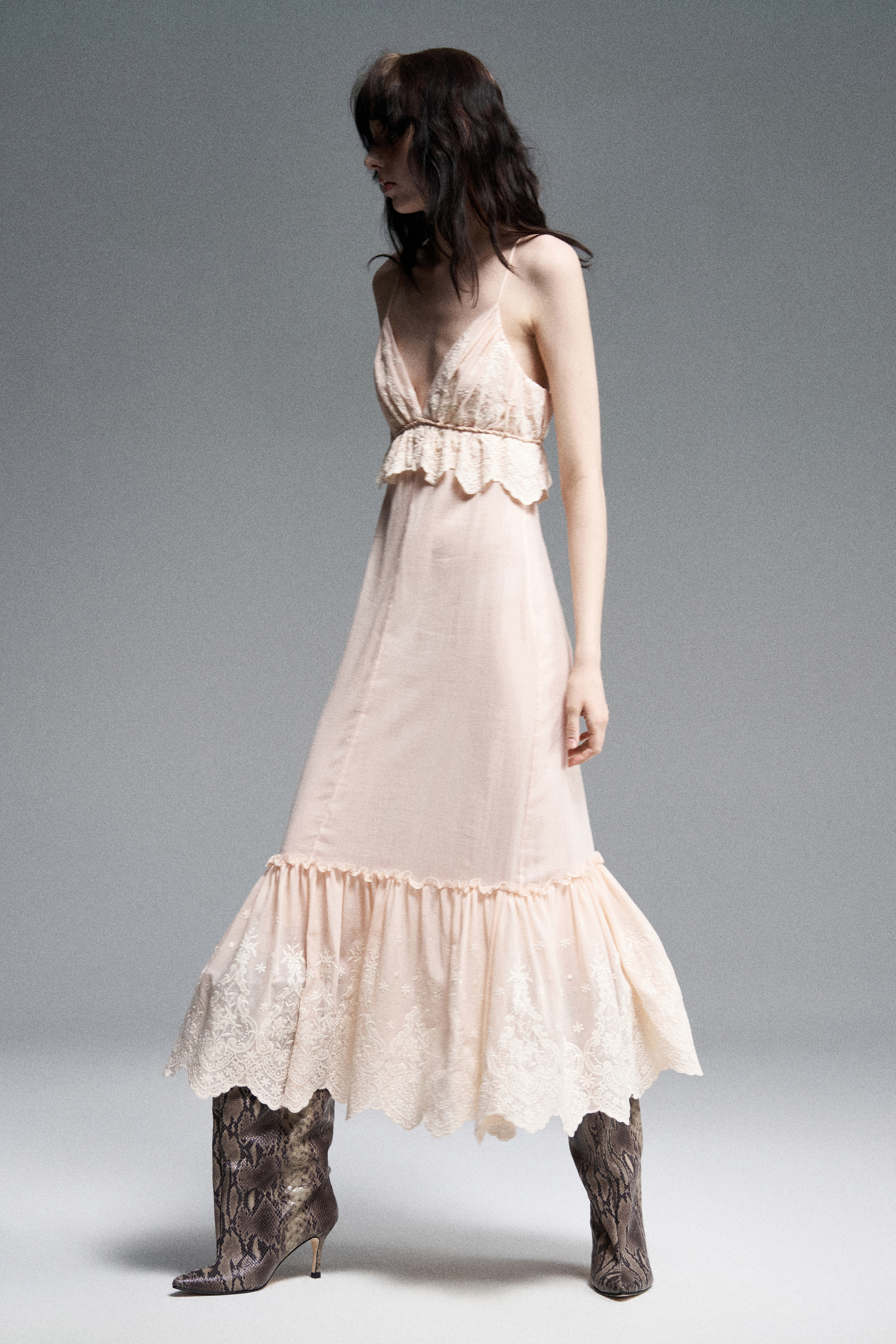 Платье из хлопкового батиста с вышивкой ришелье на тонких бретелях. Модель с подрезной чашечкой под грудью. По лифу выложена мягкая драпировка, дополненная фестоном, направленным вниз и затягивающимся на шелковые ленты, сплетенные в косичку. По низу платье оформлено высоким притачным воланом с фестоном.