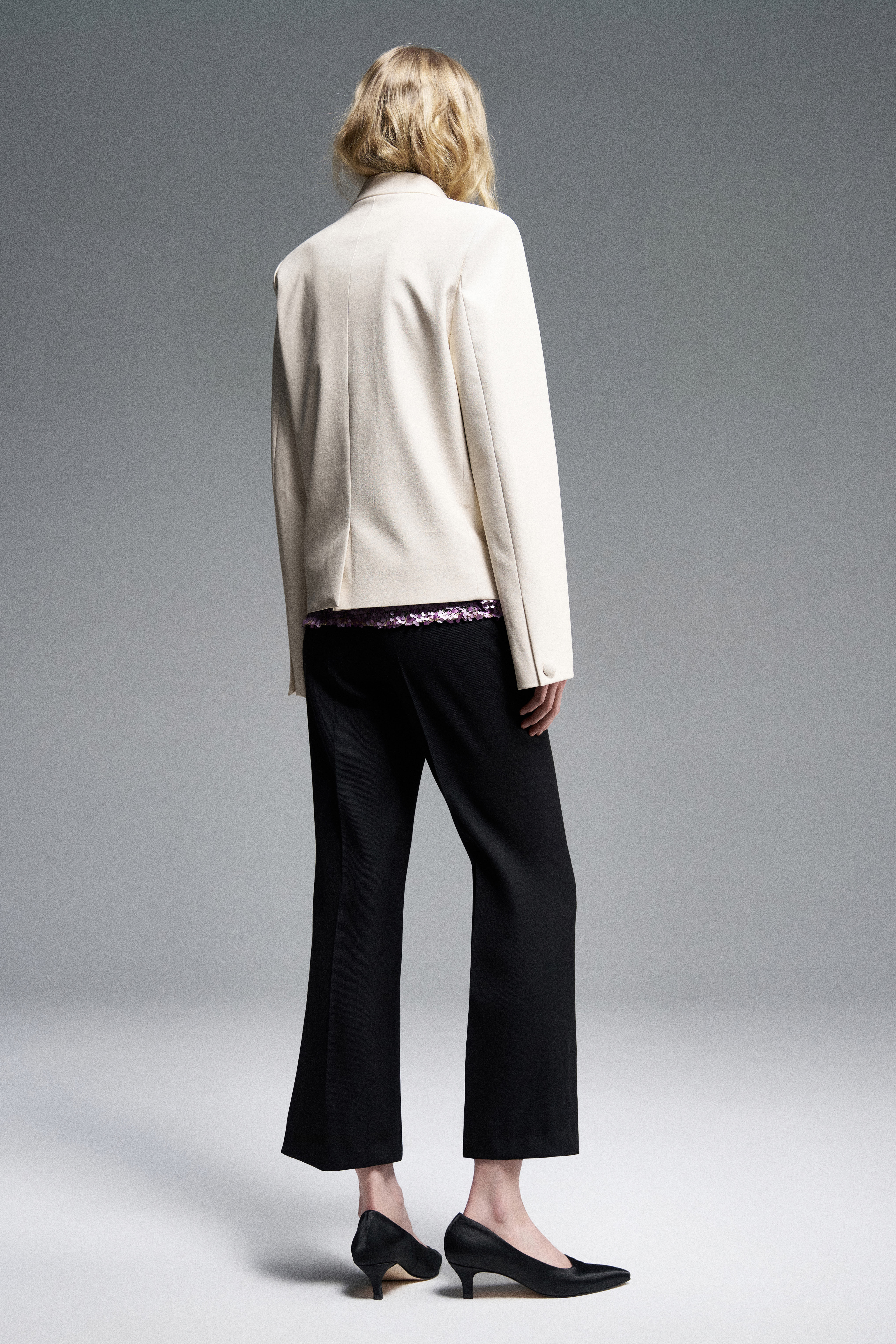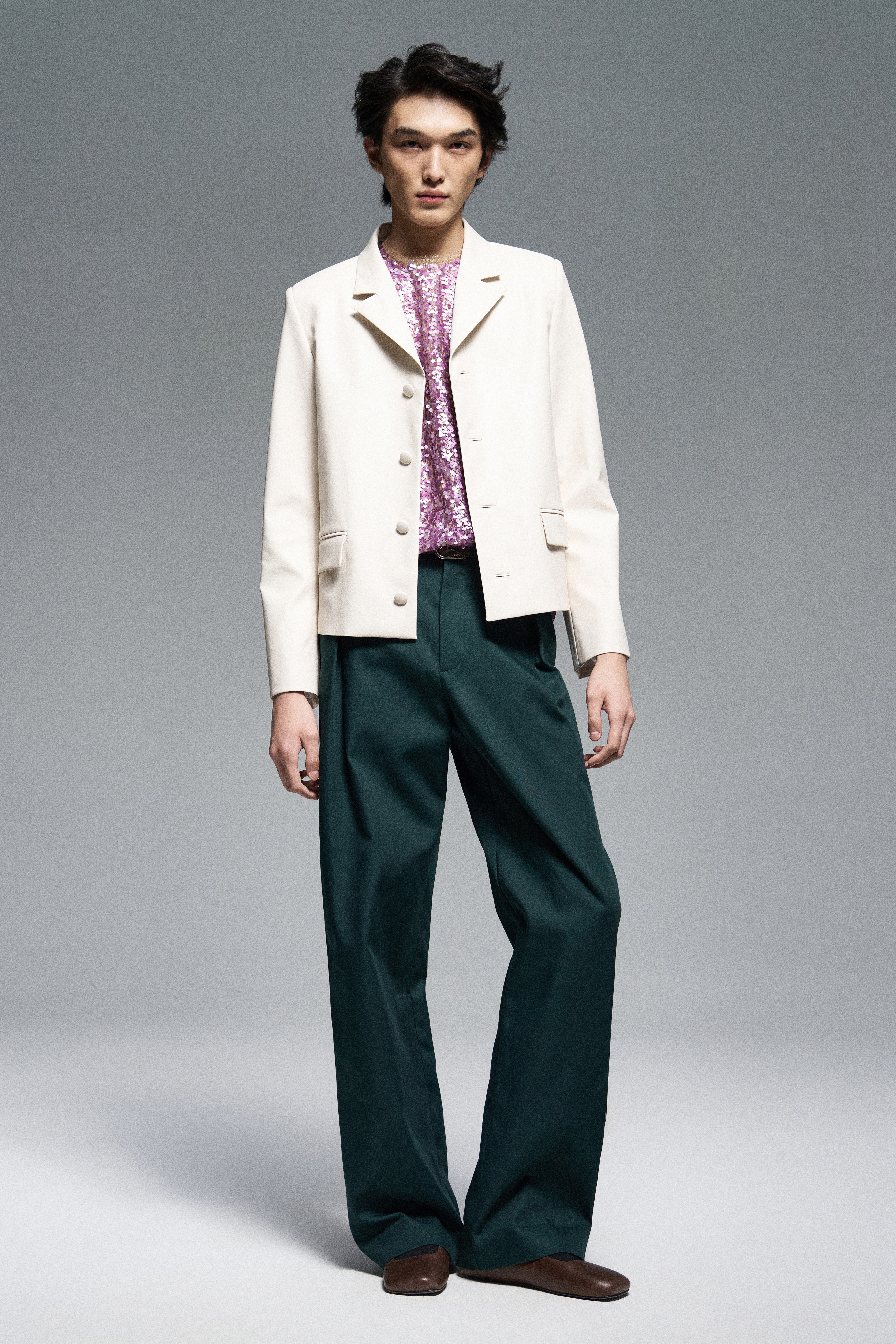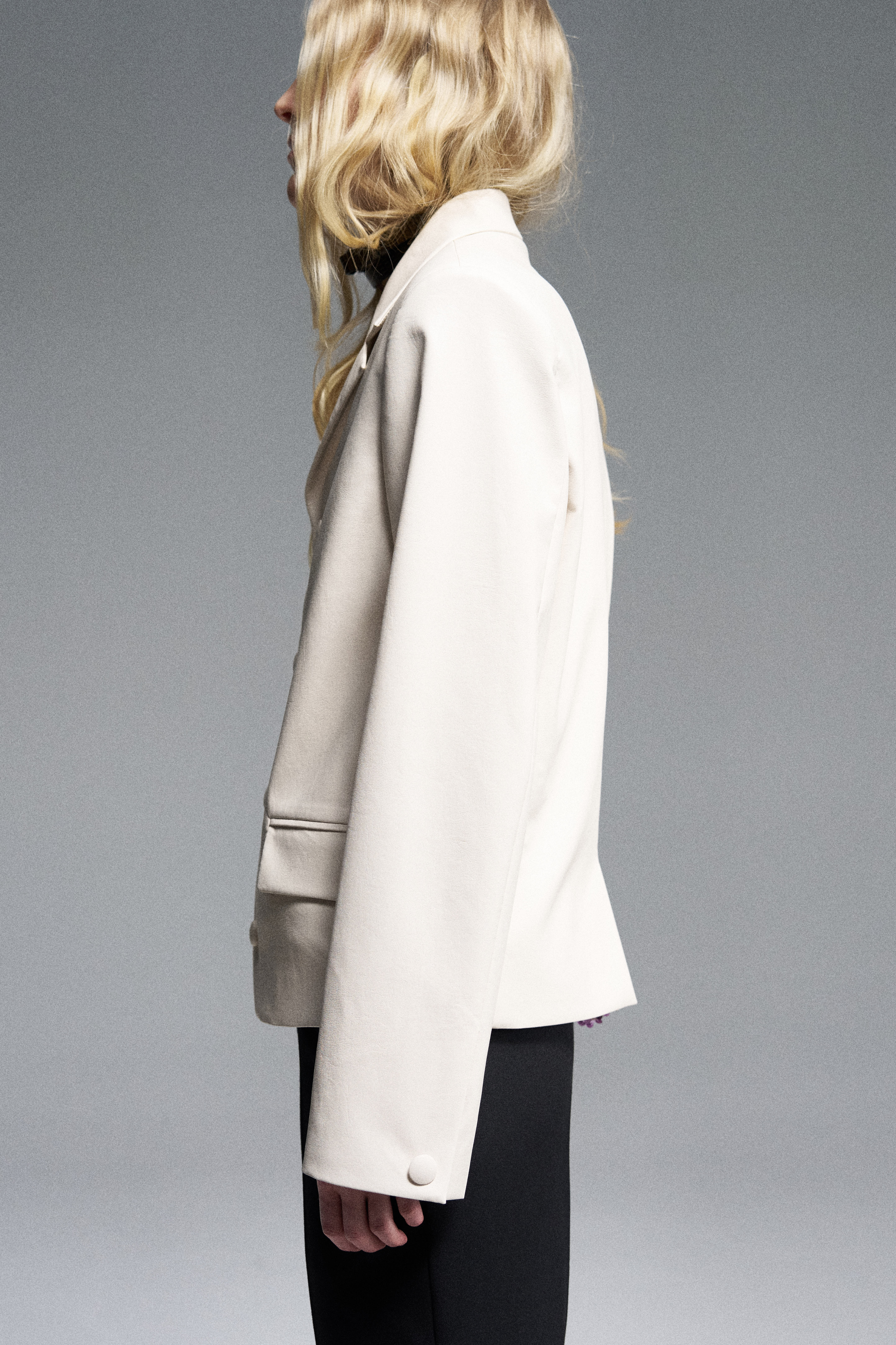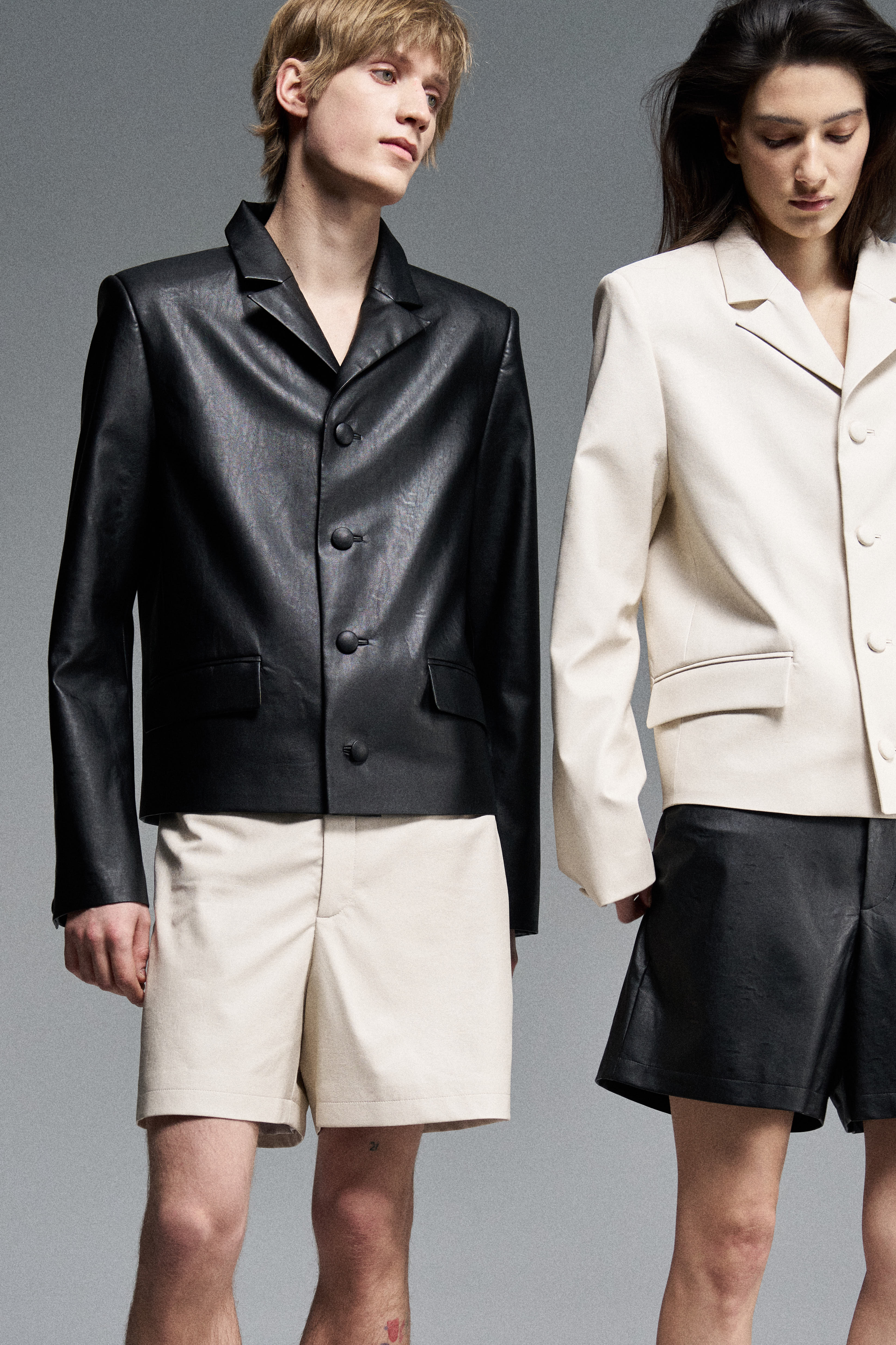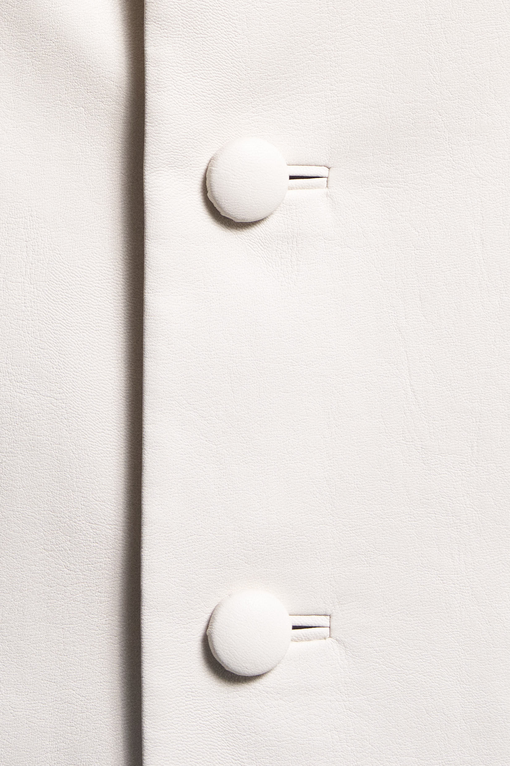 Однобортный пиджак прямого кроя из экокожи. Прямоугольные лацканы. Передние накладные карманы. Застегивается на обтяжные пуговицы. На подкладке из атласа.