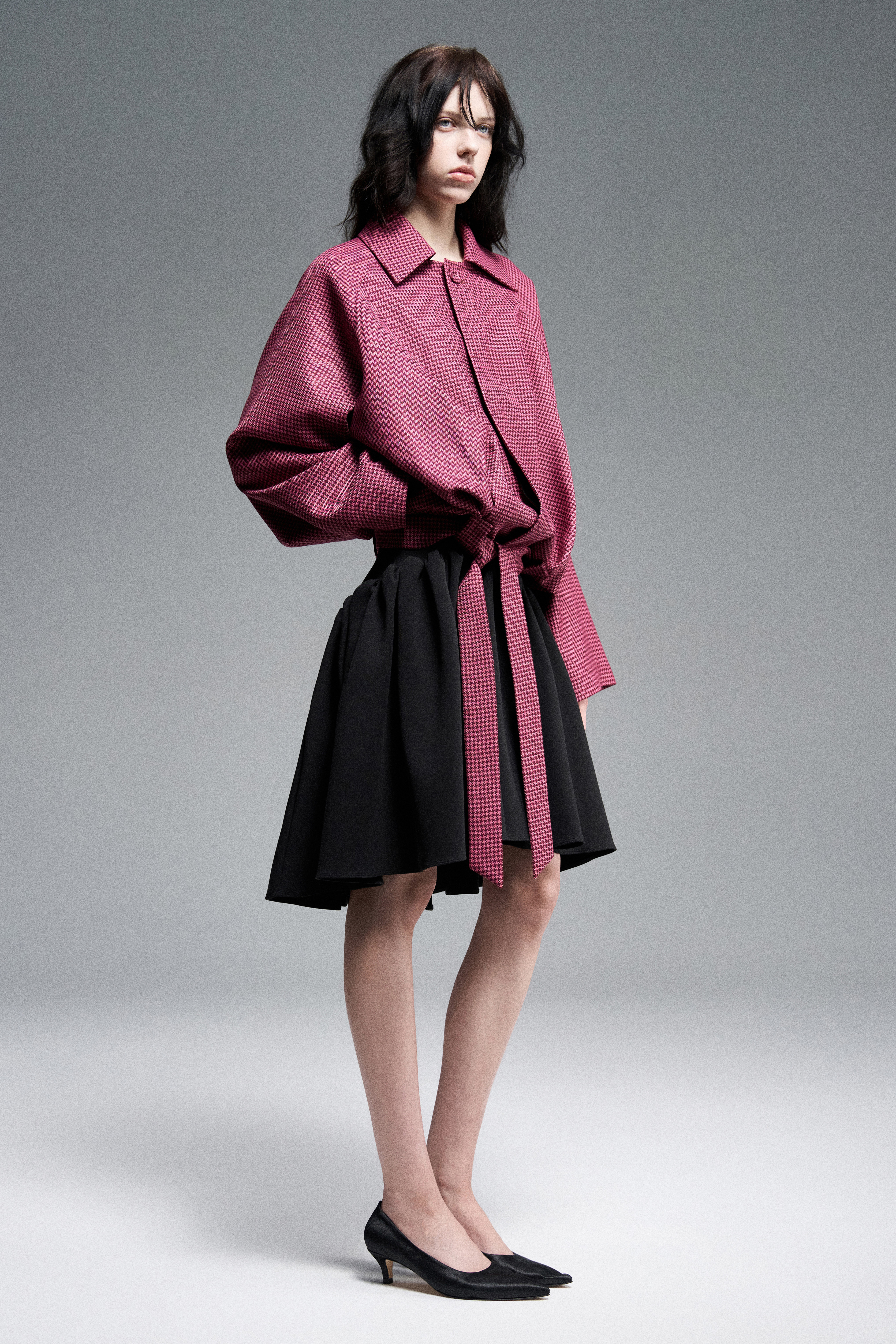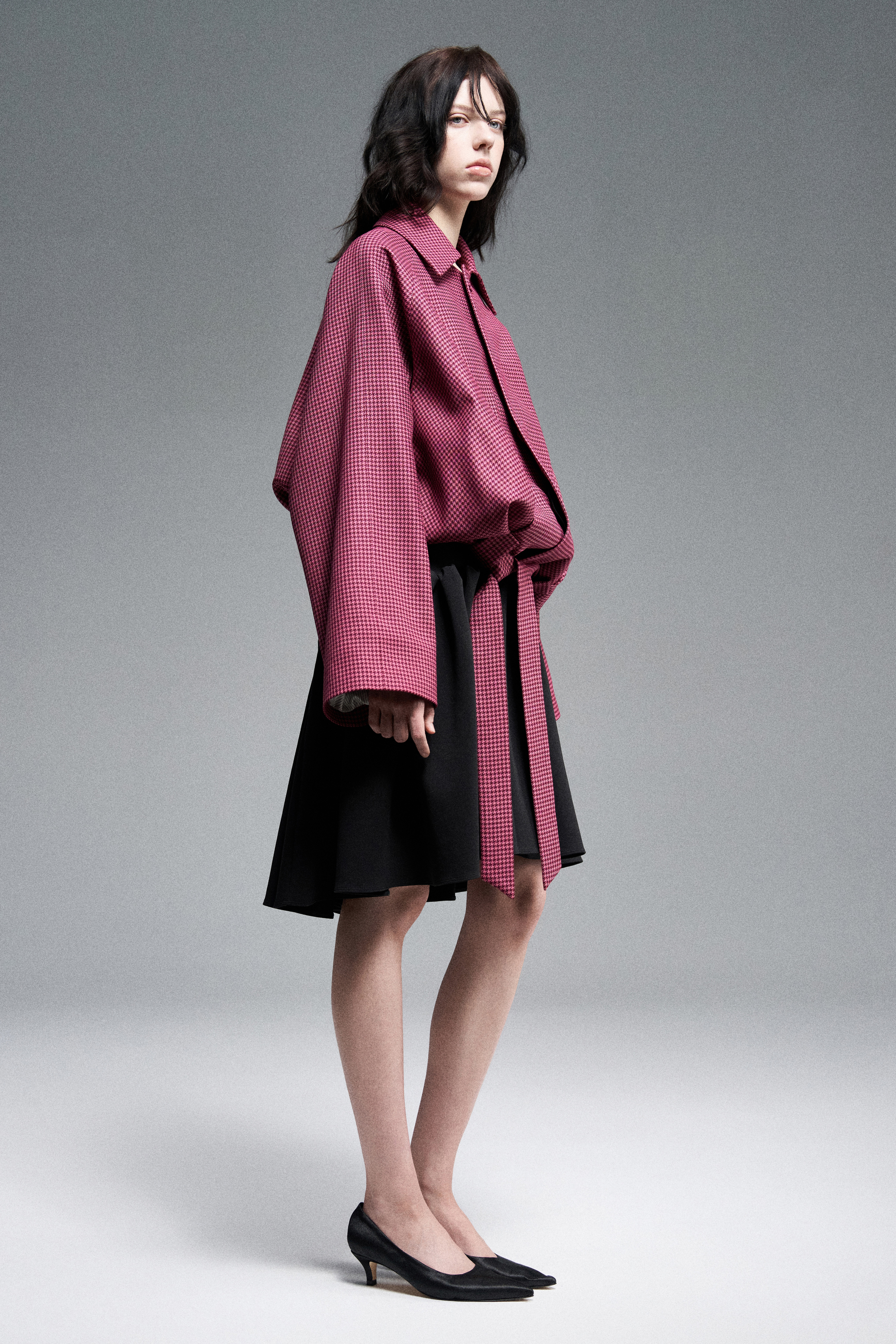 Полупальто из шерсти. Скульптурный силуэт-кокон с широким поясом по низу.
