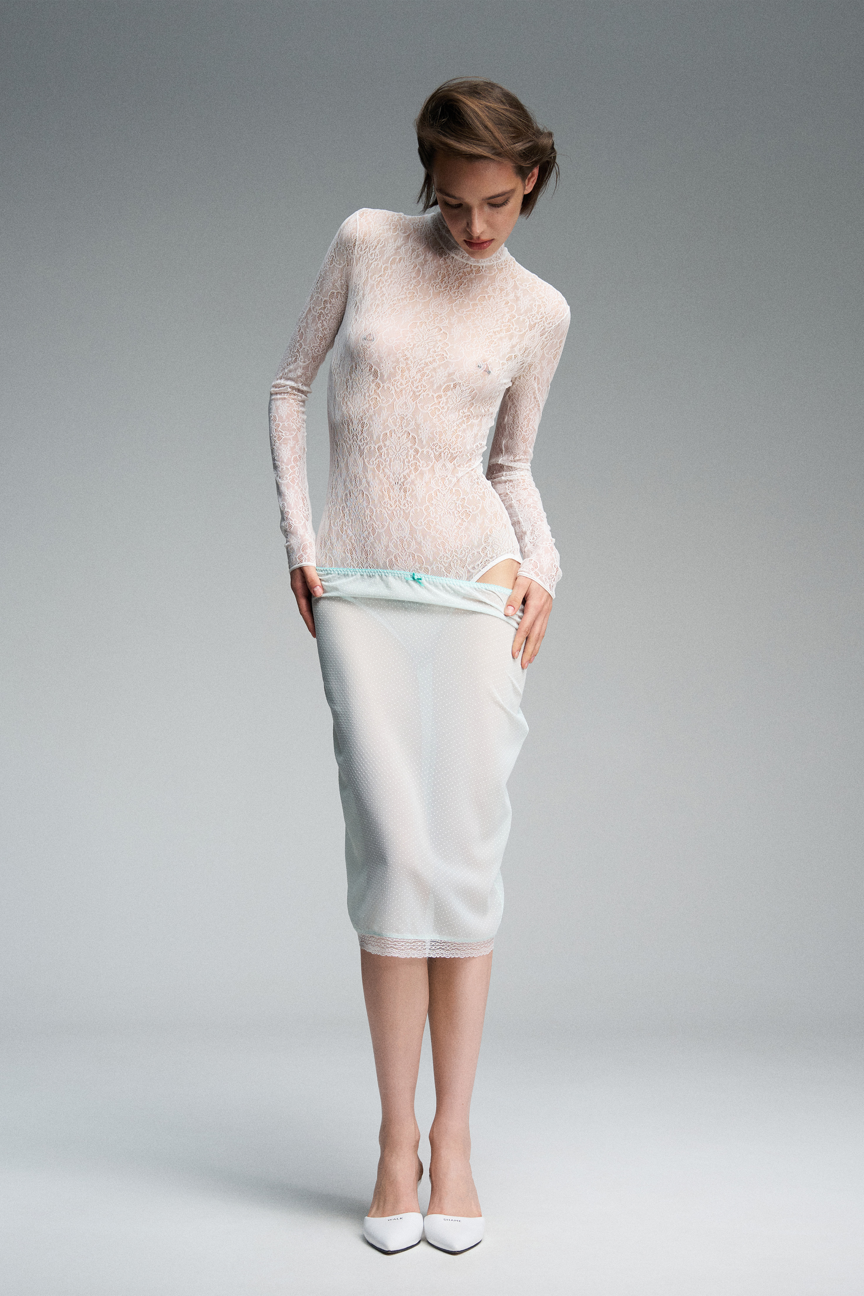 Полупрозрачная юбка миди с принтом Polka Dot. Горох на ткани выполнен из прорезиненного материала. По нижнему краю контрастное кружево. Можно носить как самостоятельно, так и в качестве второго слоя под платье или юбку.