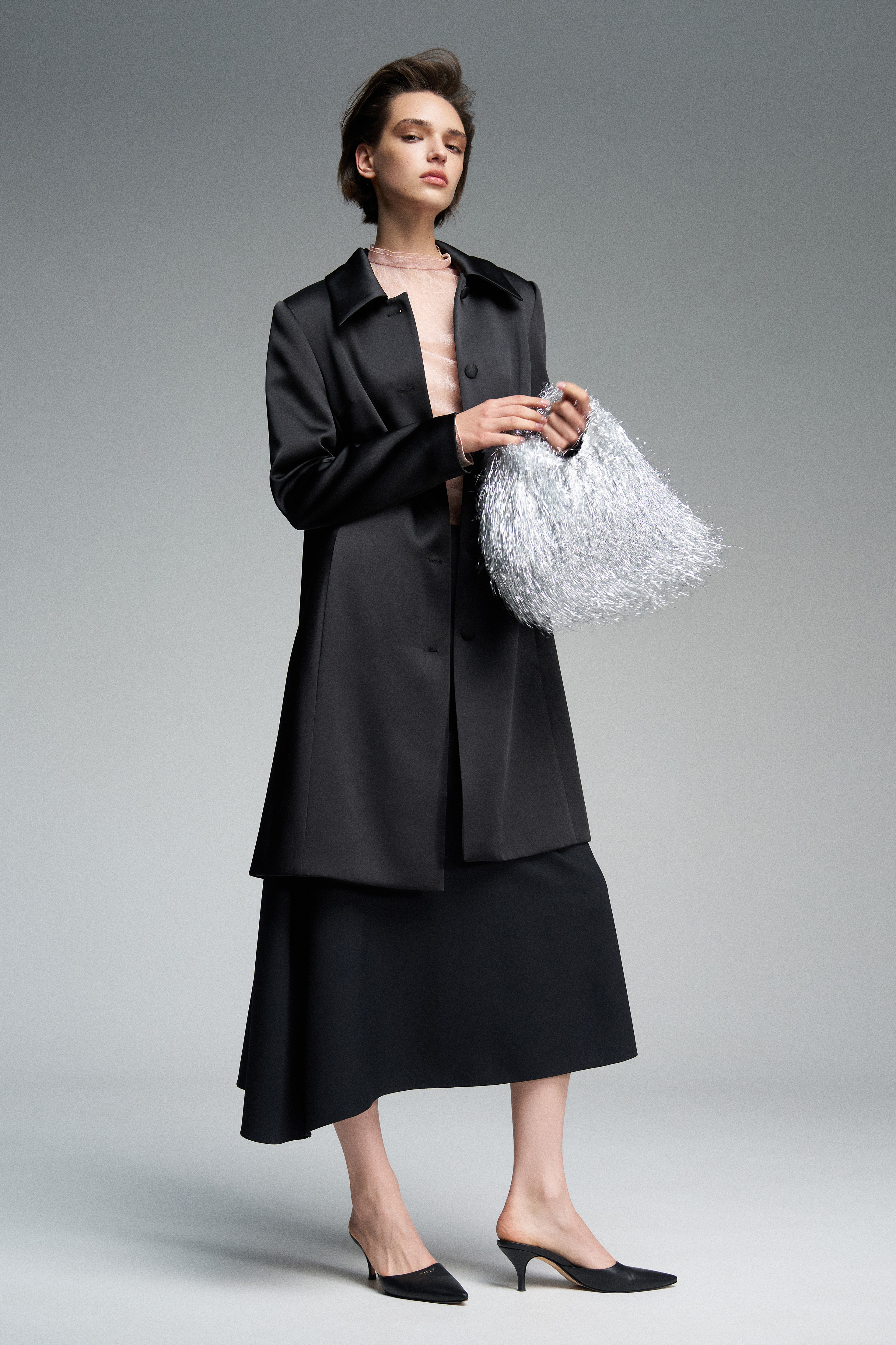 Юбка миди сшита из чёрного крепа. Асимметричный крой придаёт образу динамику, а застёжка на молнию делает посадку удобной и лаконичной. Отсутствие подкладки позволяет ткани идеально повторять силуэт, создавая чистый и графичный образ.