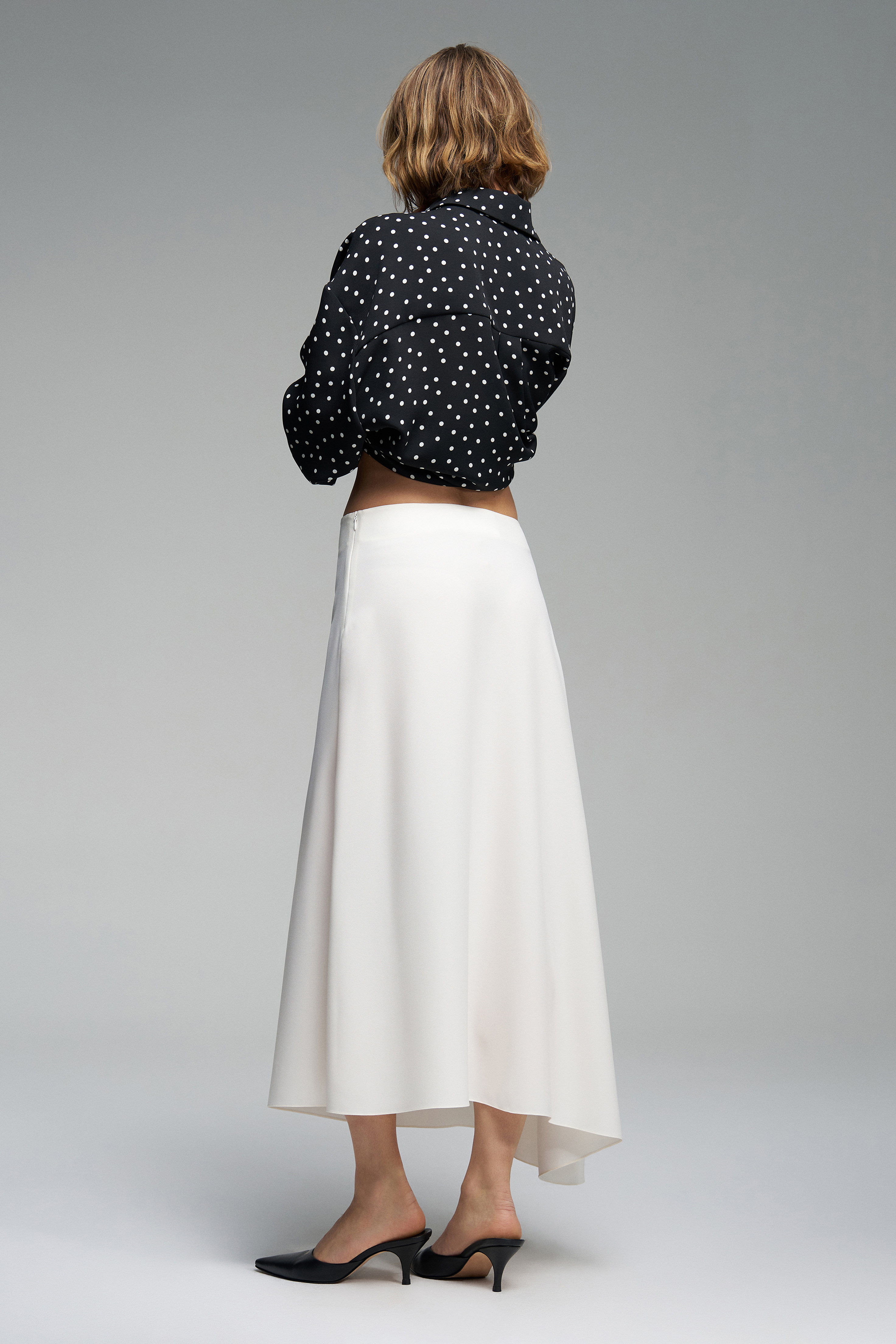 Юбка миди сшита из молочного крепа. Асимметричный крой придаёт образу динамику, а застёжка на молнию делает посадку удобной и лаконичной. Отсутствие подкладки позволяет ткани идеально повторять силуэт, создавая чистый и графичный образ.