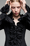 Приталенная блуза украшена рюшами — они проходят вдоль линии застёжки и на рукавах. В этой модели глубокий вырез, а сама застёжка на пуговицы остаётся функциональной деталью.